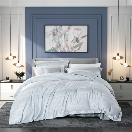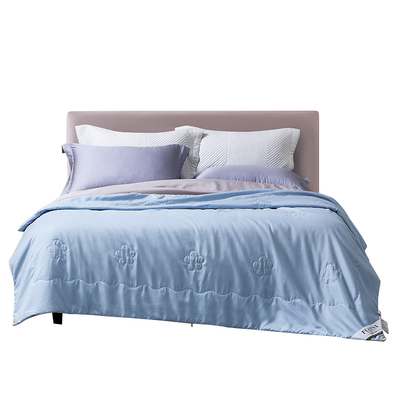 好蚕丝 集轻,柔,细为一体的蚕丝,素有人体“第二皮;精选磨毛好面料 沁凉浅蓝色的磨毛印花面料,手接触肌