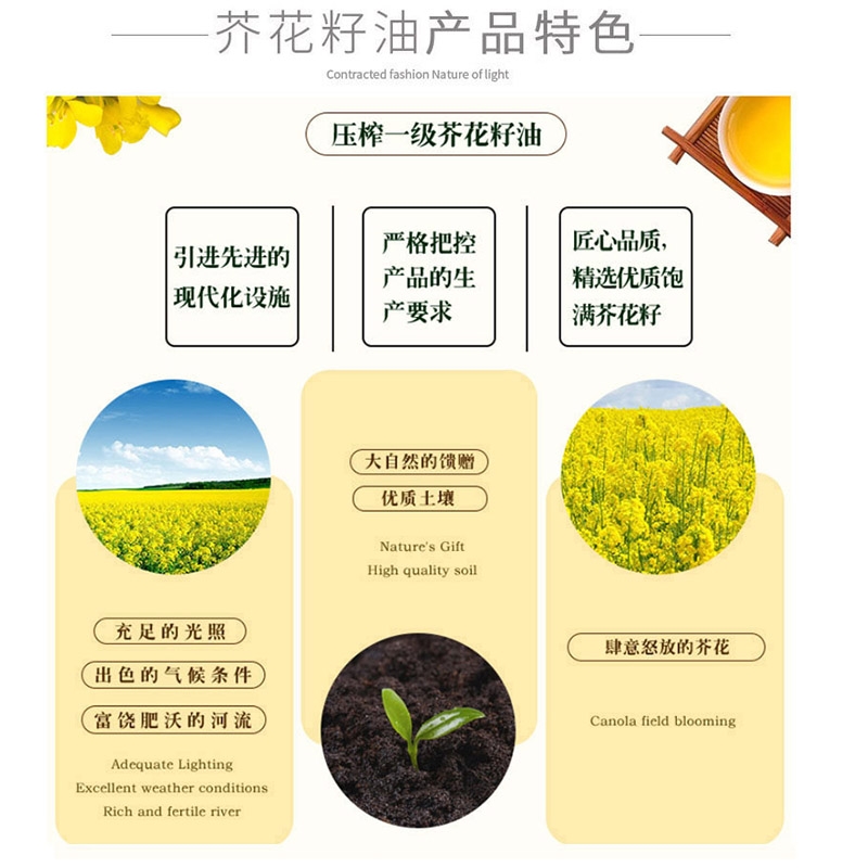 无胆固醇,含极少量的饱和脂肪。;物理压榨;芥花籽油拥有93%的不饱和脂肪和7%的饱和脂肪
