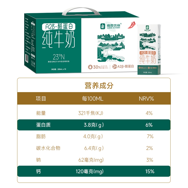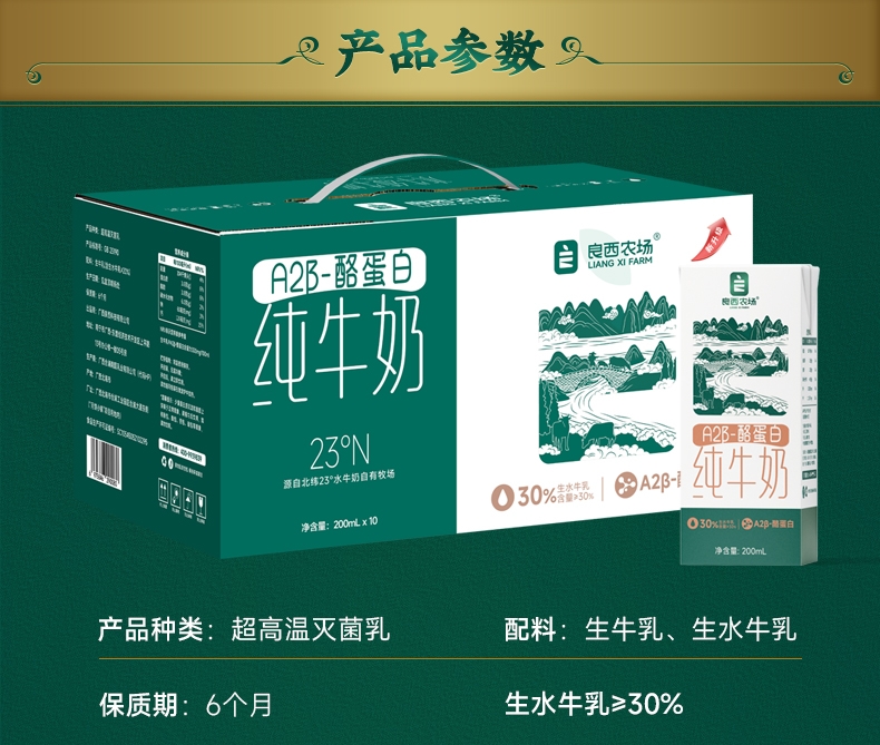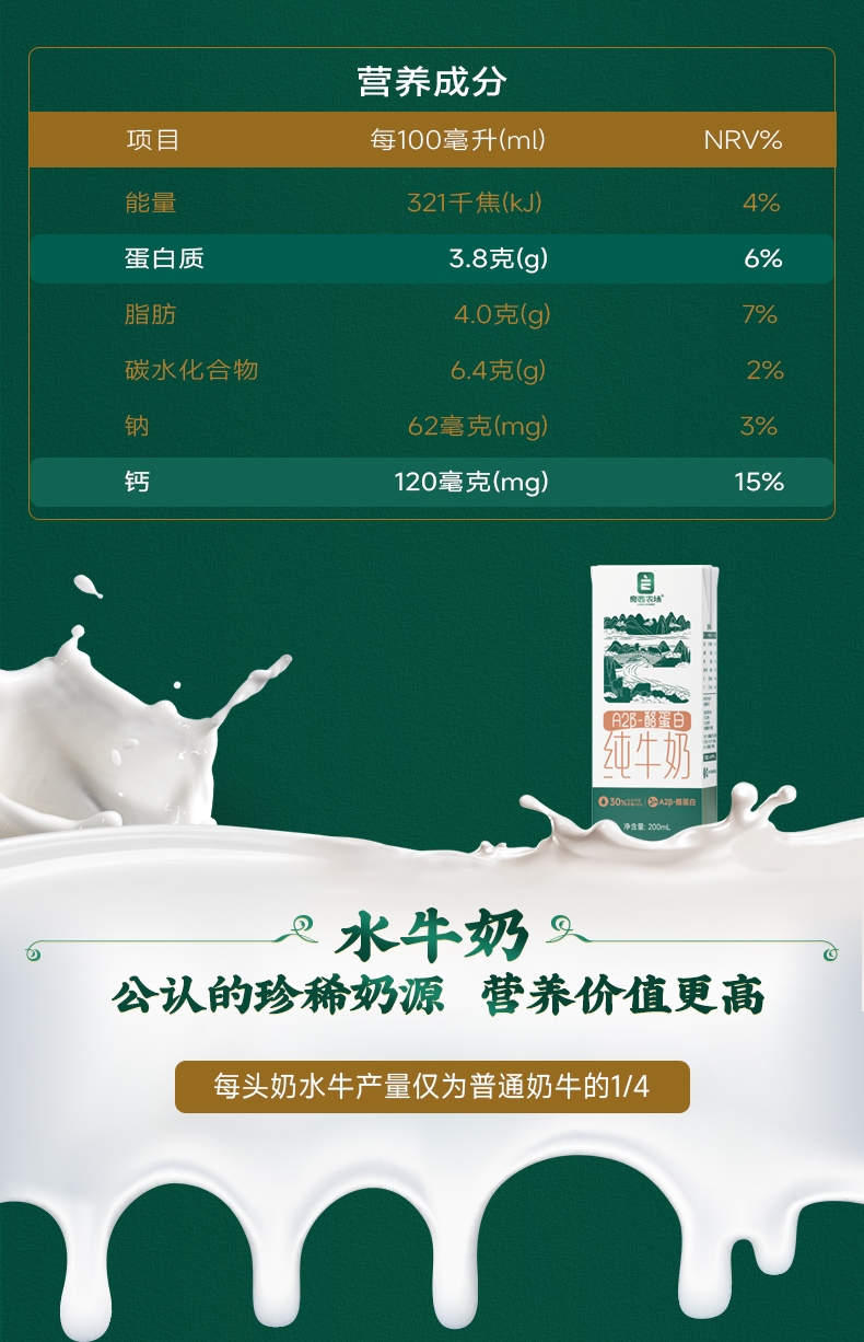 源自北纬23°水牛奶之乡,自有牧场优质奶源;引入广西亚热带森林水源,从源头保障品质;3.8g/100ml优质乳蛋白;120mg/100ml原生高钙;300mg/100mlA2β-酪蛋白
