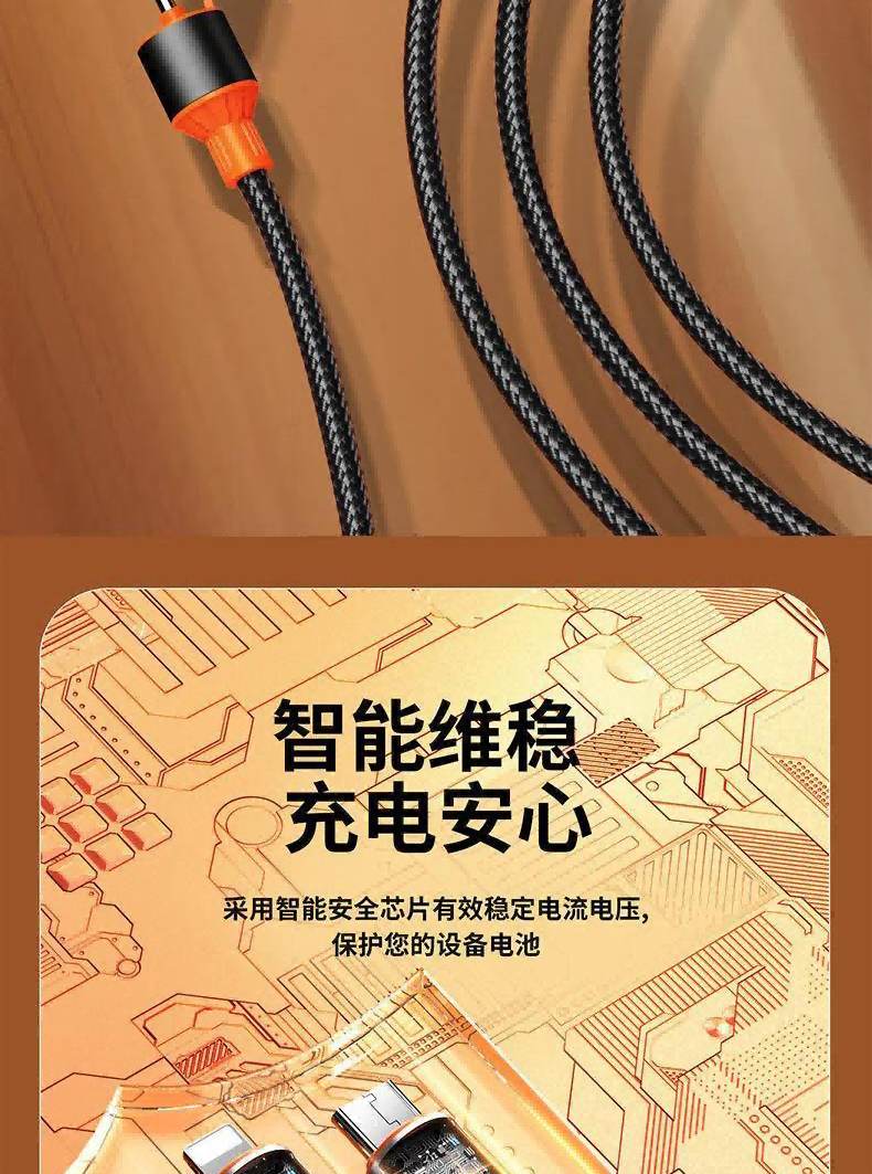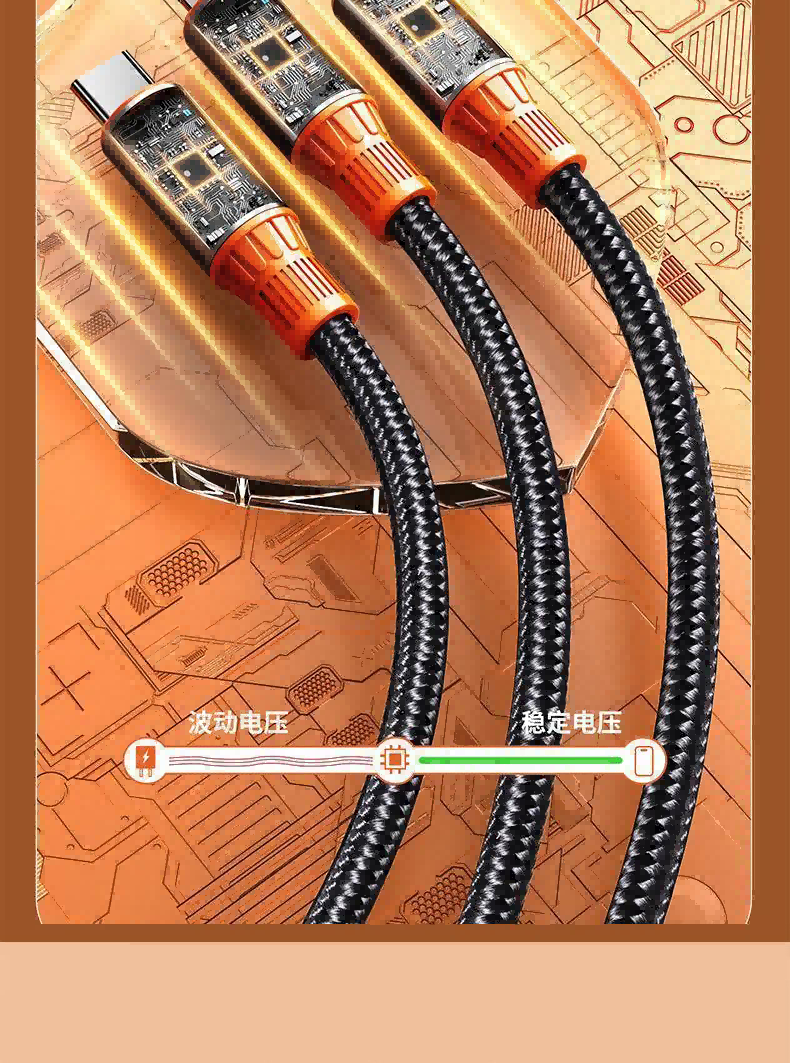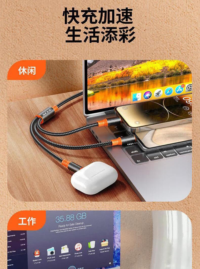 快充二拖三满电不排序;输入端USB-A和USB-C二合一,满足多种设备;采用智能安全芯片有效稳定电流电压,保护您的设备电池;