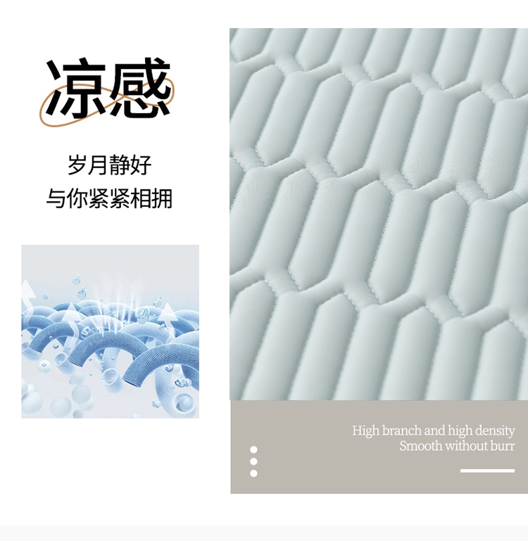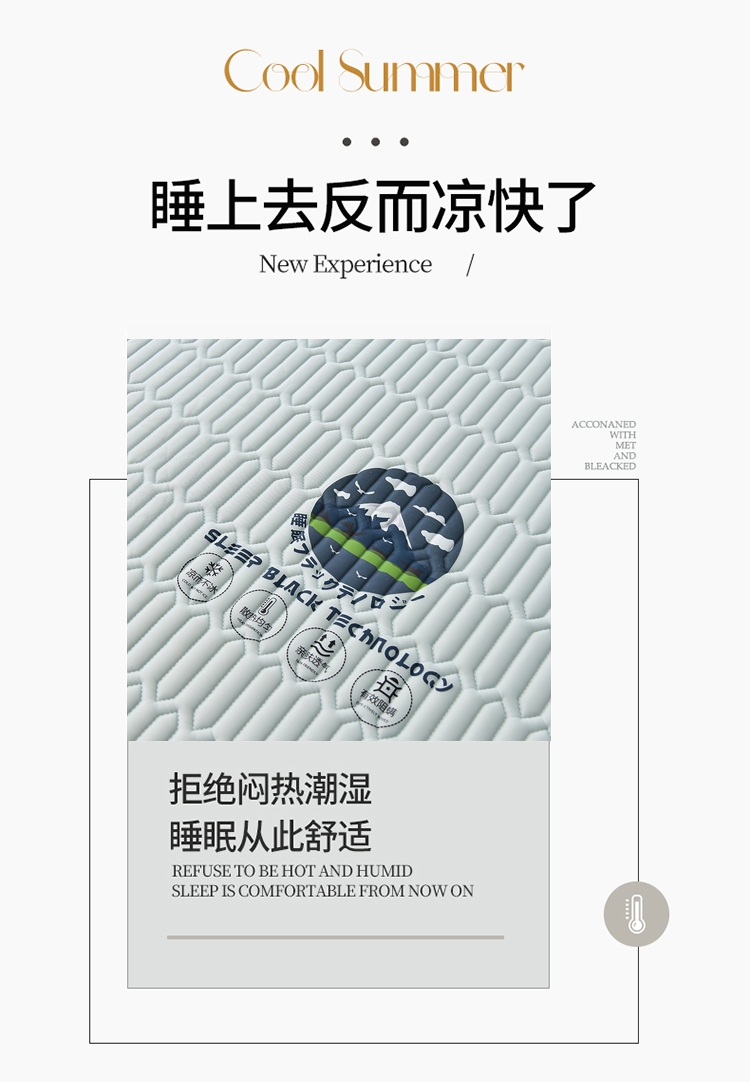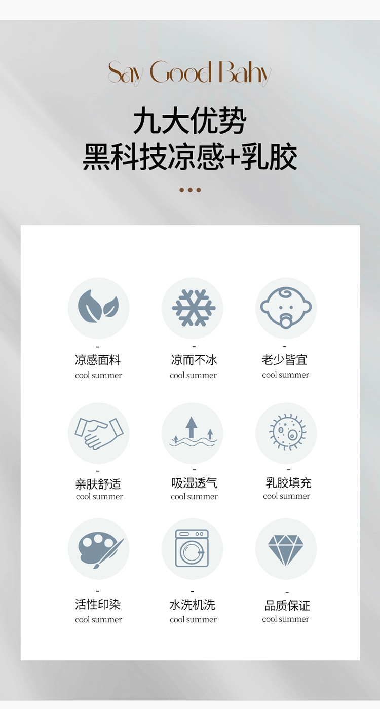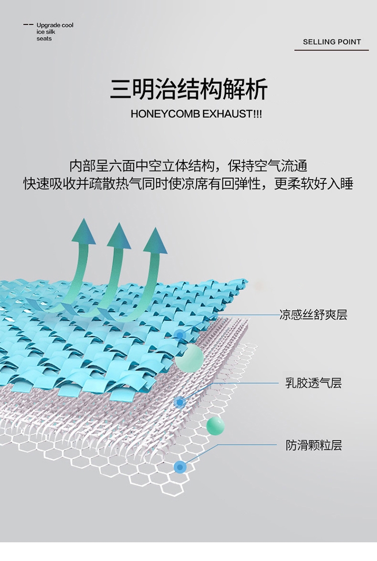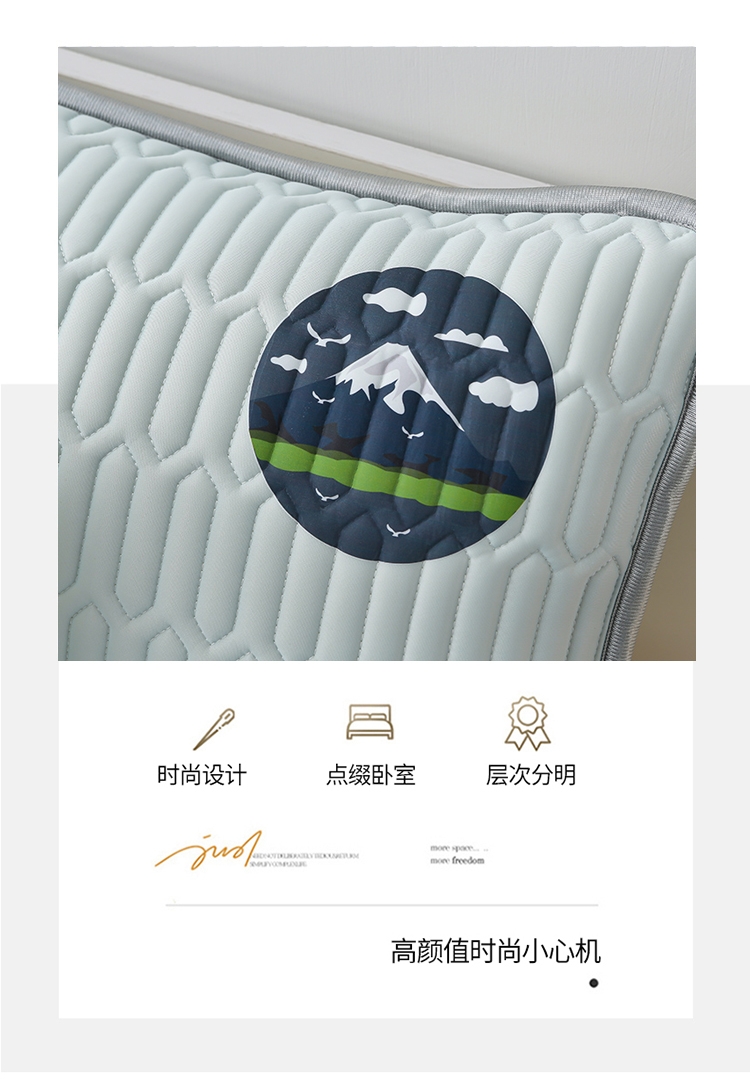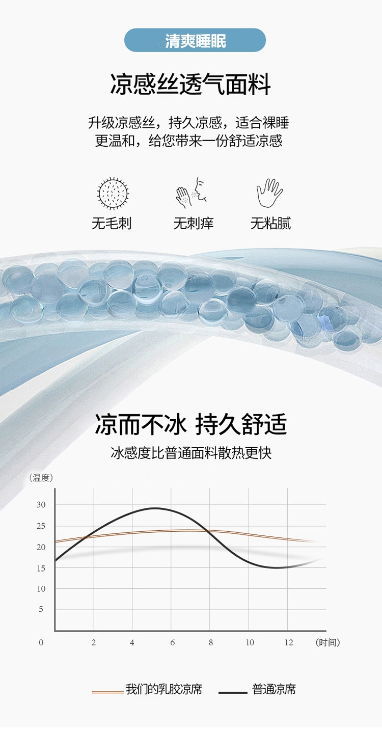 采用凉感丝面料,亲和肌肤、干爽舒适;人体工学设计,多层结构形成中空对流层;活性印花图案,不易褪色,色牢度高