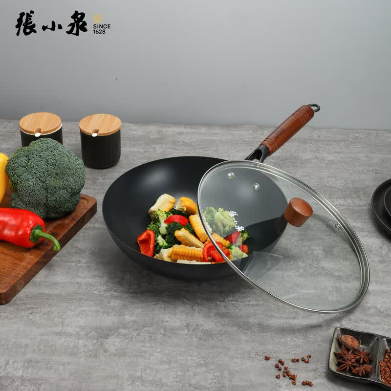 锅体采用1.4mm厚拉伸工艺,30cm直径轻巧方便;严选精铁基材,清新健康少油烟;金属铆钉加固工艺,结实牢固;人体工程学实木手柄设计,握感舒适;可视钢化玻璃锅盖,烹饪进度一目了然