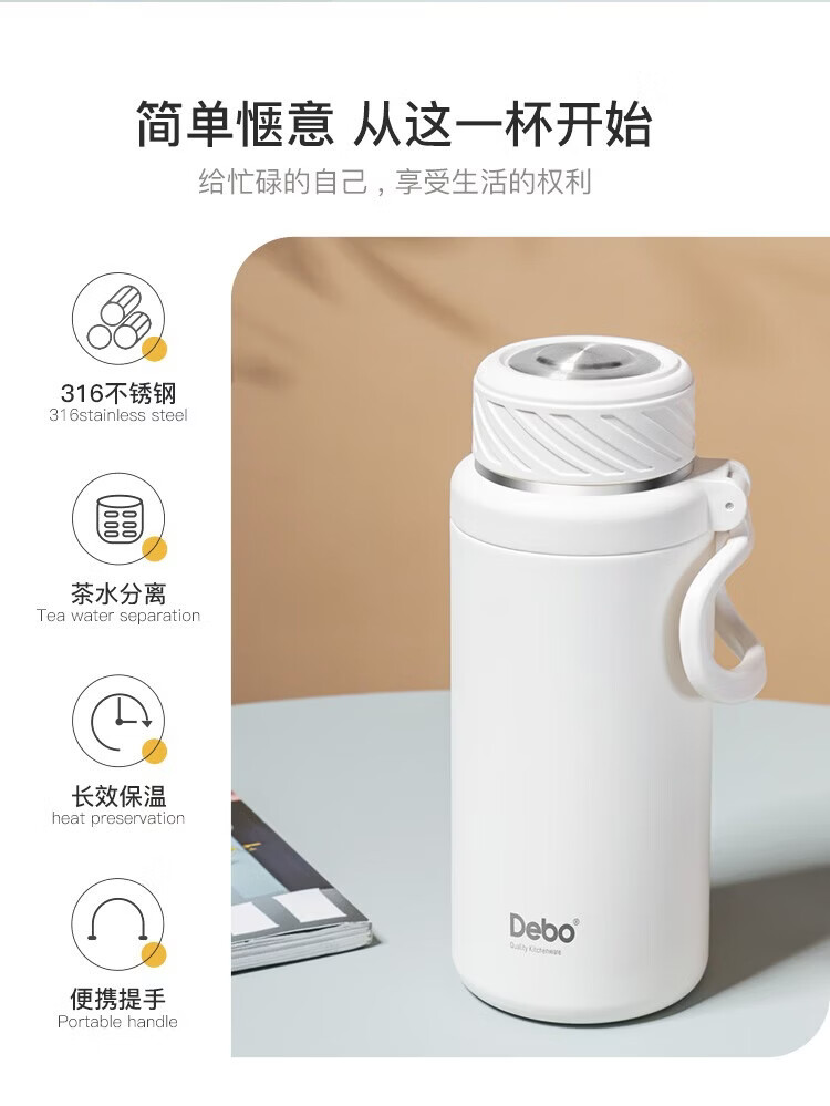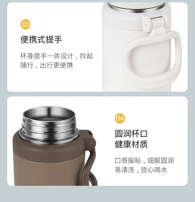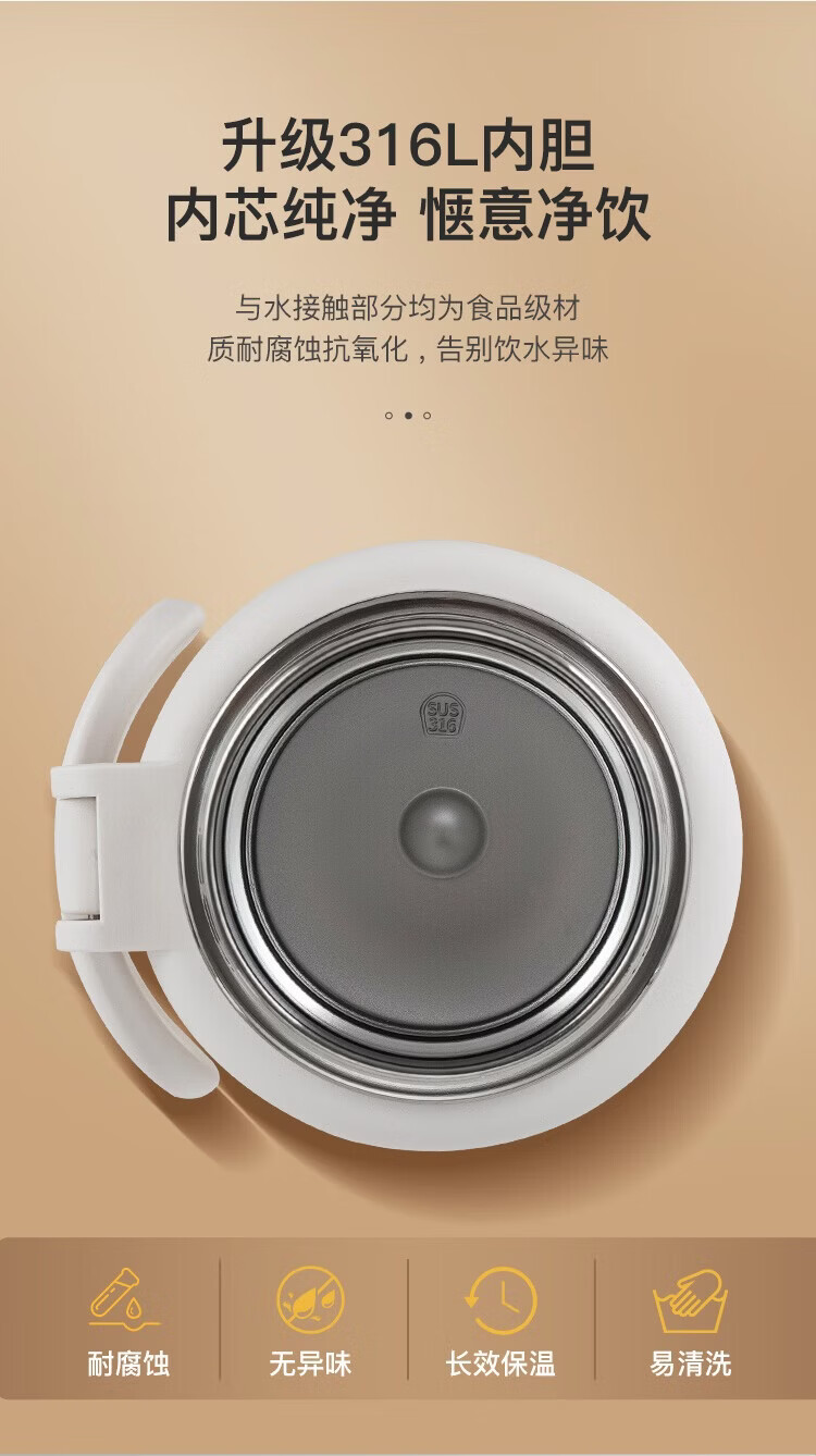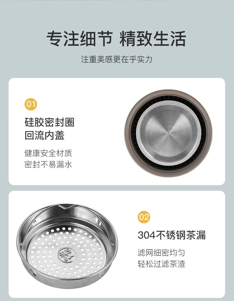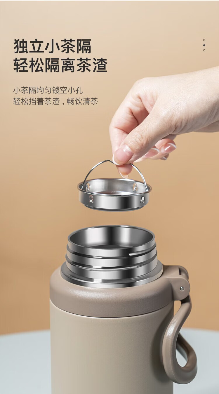 经典旋转开盖,螺纹杯盖306°密封防漏;316不锈钢医用级内胆,超强耐腐蚀,安心饮用;304不锈钢茶网,滤网细密轻松分离茶水