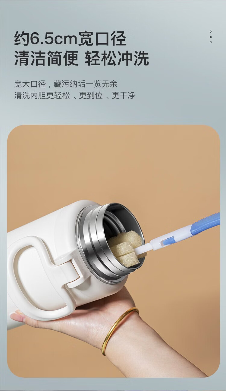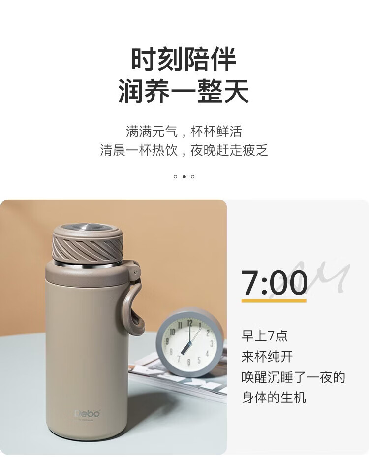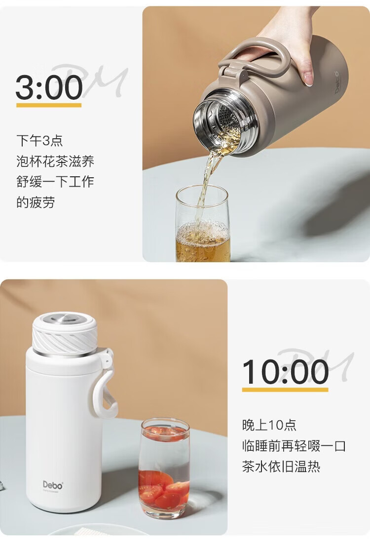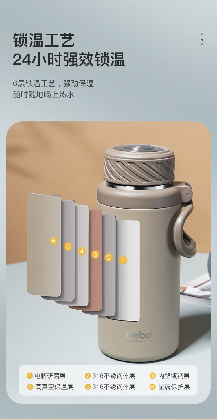 经典旋转开盖,螺纹杯盖306°密封防漏;316不锈钢医用级内胆,超强耐腐蚀,安心饮用;304不锈钢茶网,滤网细密轻松分离茶水