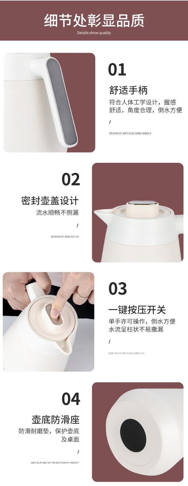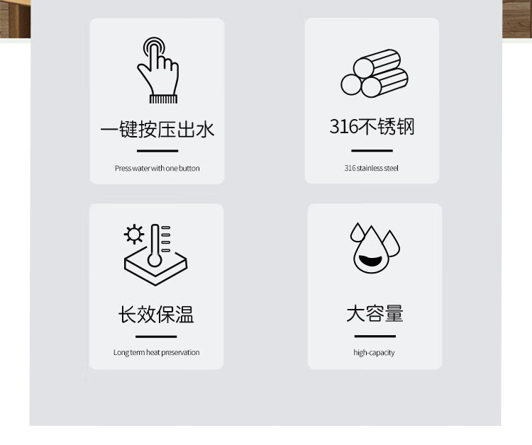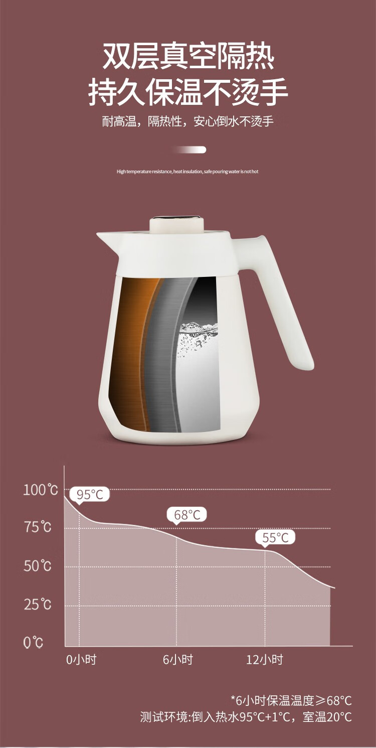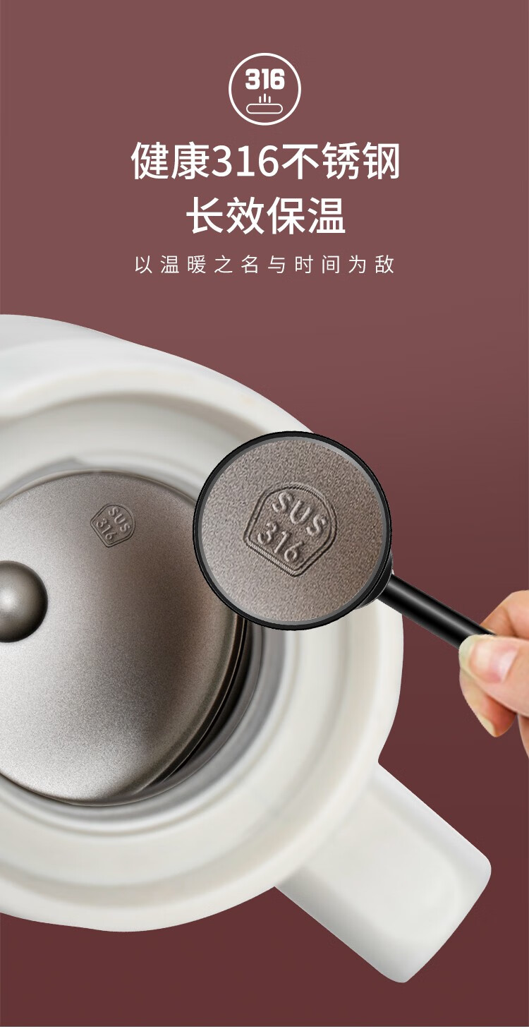 316不锈钢,抗菌无异味;壶口经过精细抛光处理,易清洗;经实验室测试,六小时保温68℃