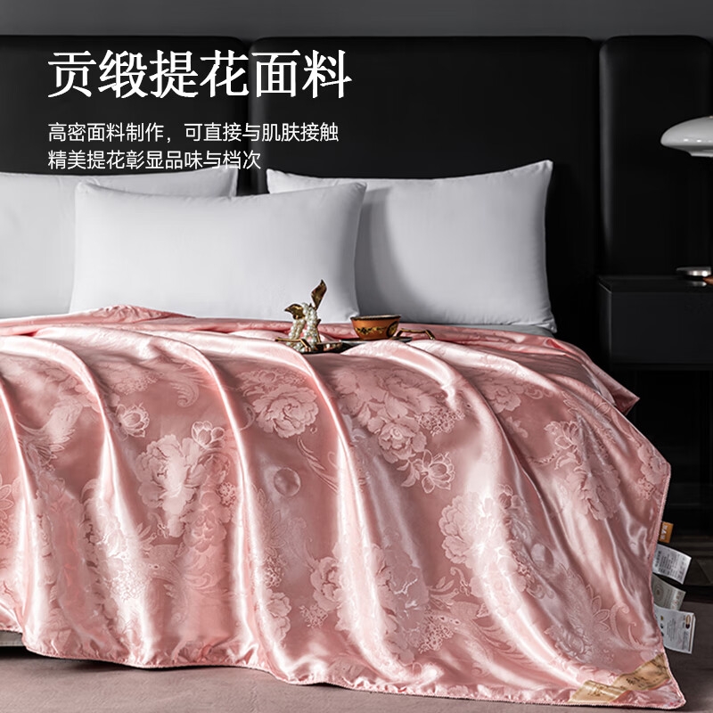 优选高密度锻贡提花面料制作,精美提花彰显品味与档次;甄选100%柞蚕丝中长丝填充,呵护陪伴每一夜;新一代活性印染工艺,颜色靓丽,不易起球,不易褪色