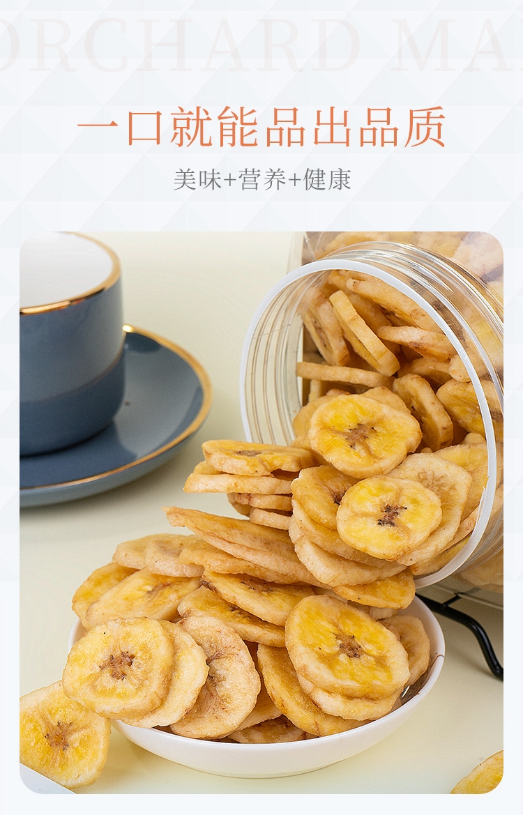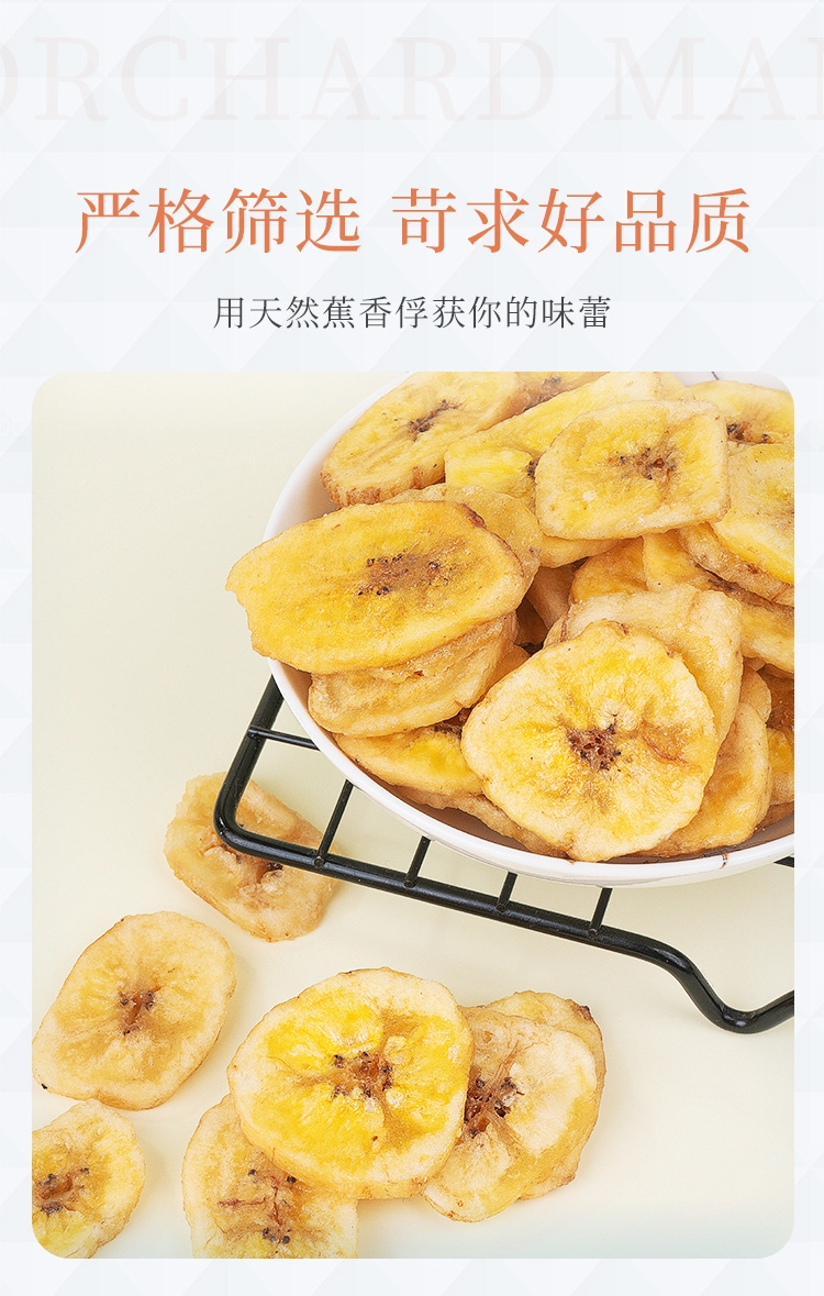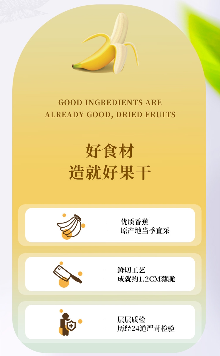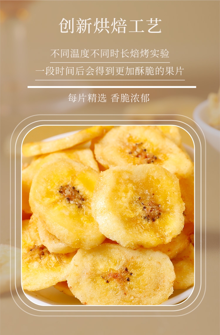 优质香蕉原产地当季直采;鲜切工艺,成就约1.2cm薄脆;创新烘焙工艺,香脆可口