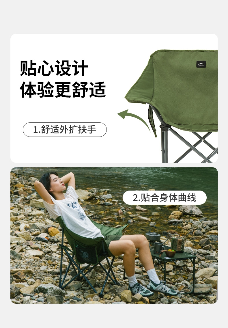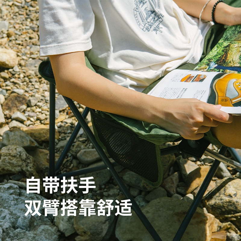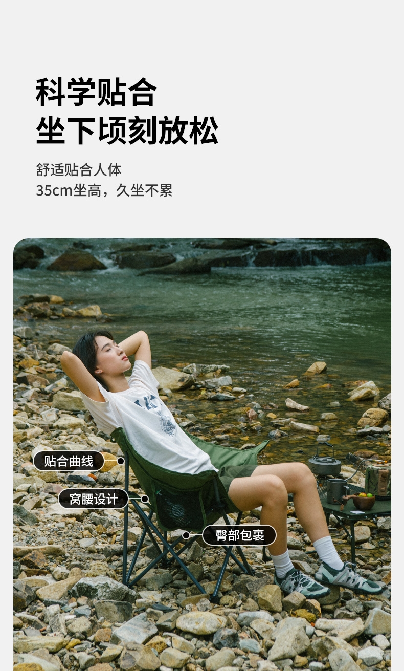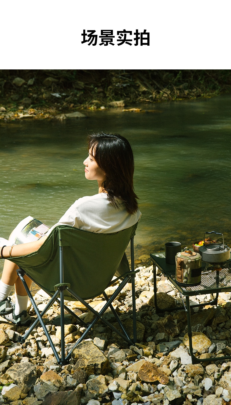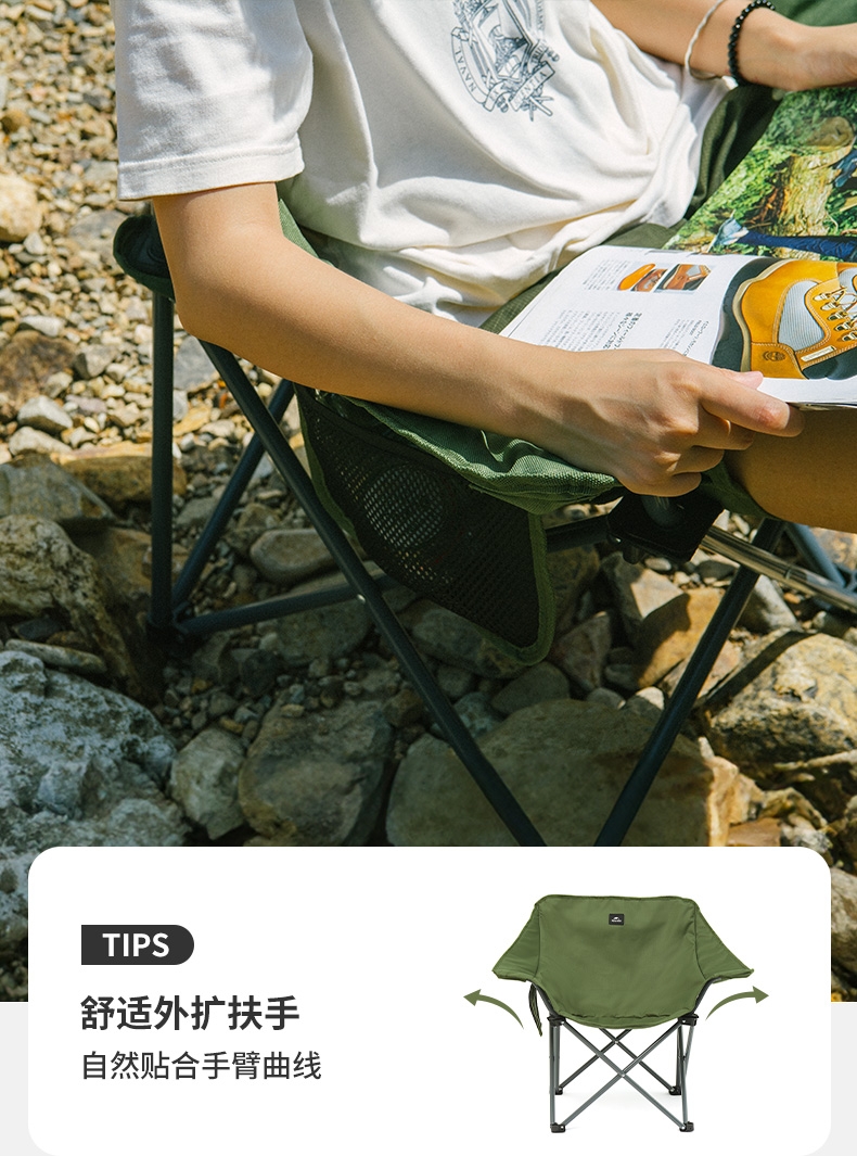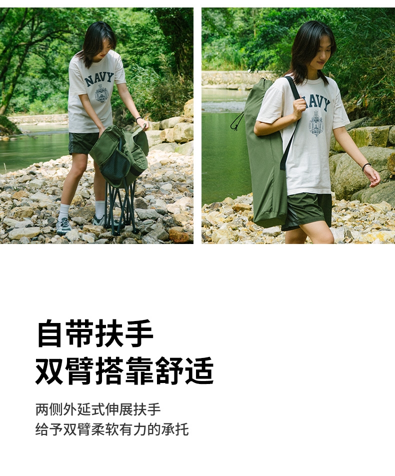 一键开合,单手可拎 体验轻松自在的露营方式;人体工程学弧度,舒适贴合人体 35cm黄金坐高;两侧外延式伸展扶手 给予双臂柔软有力的承托