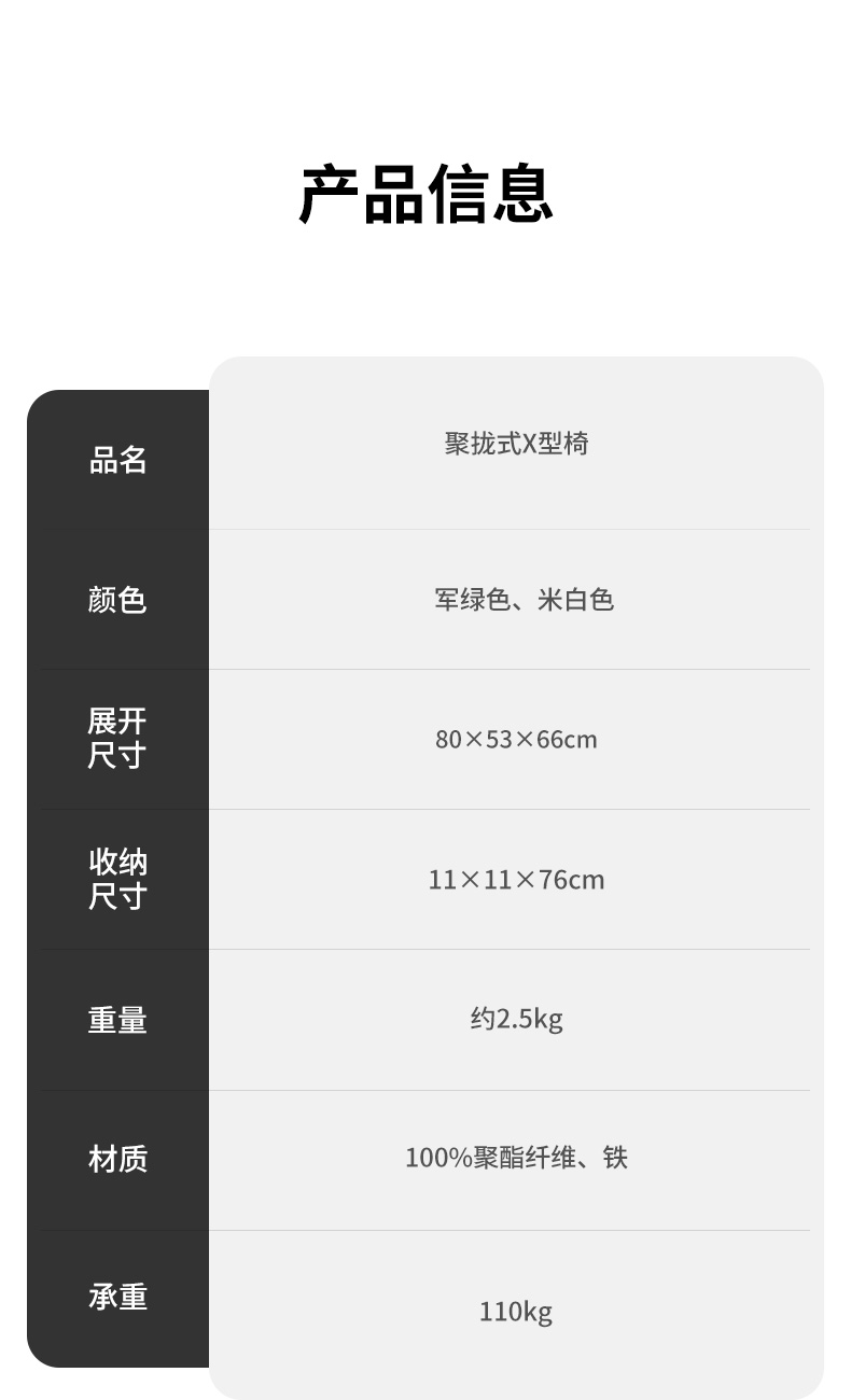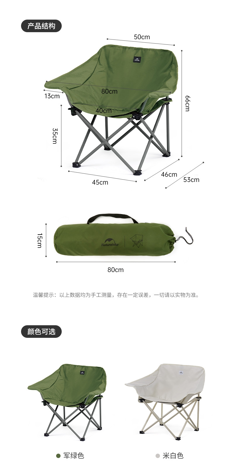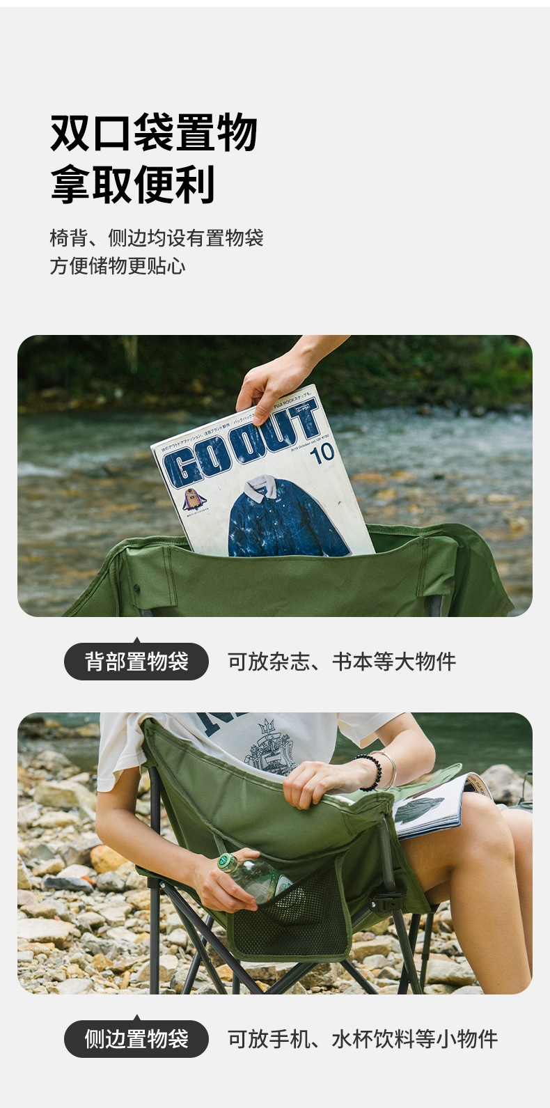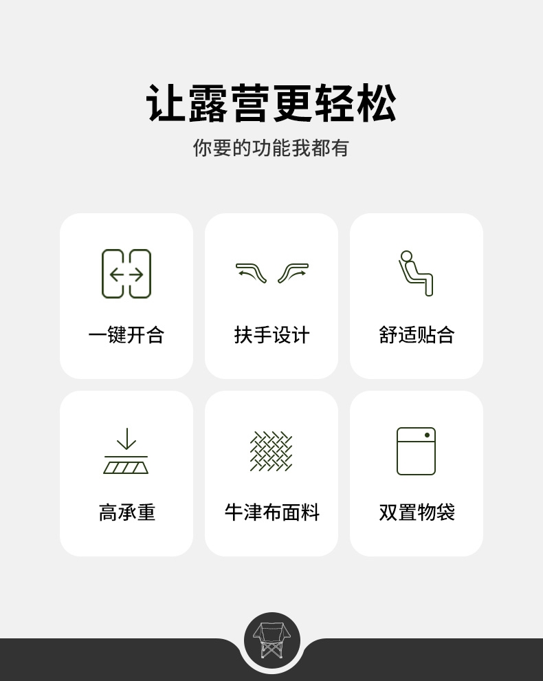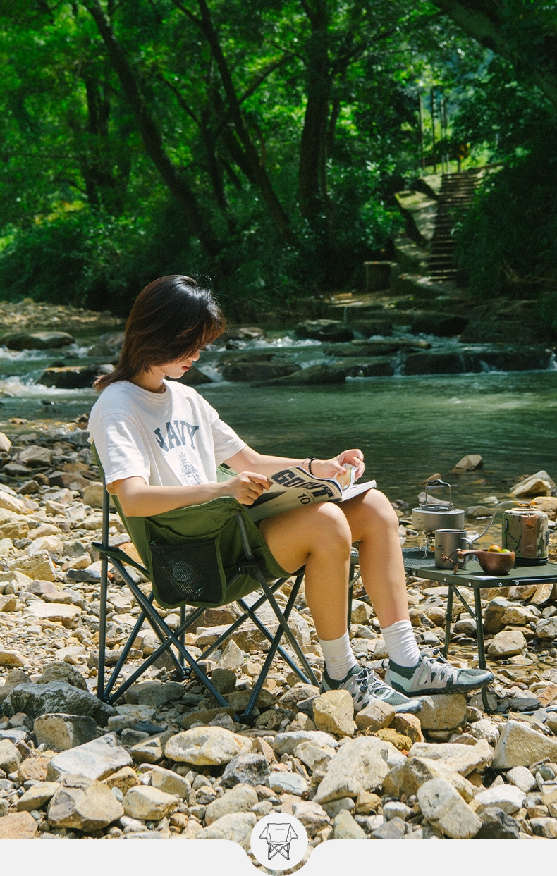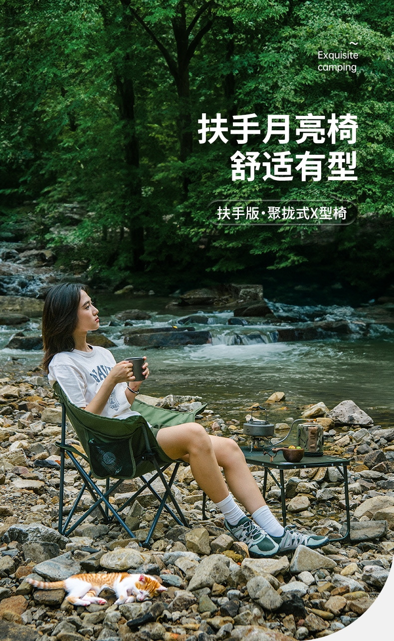 一键开合,单手可拎 体验轻松自在的露营方式;人体工程学弧度,舒适贴合人体 35cm黄金坐高;两侧外延式伸展扶手 给予双臂柔软有力的承托