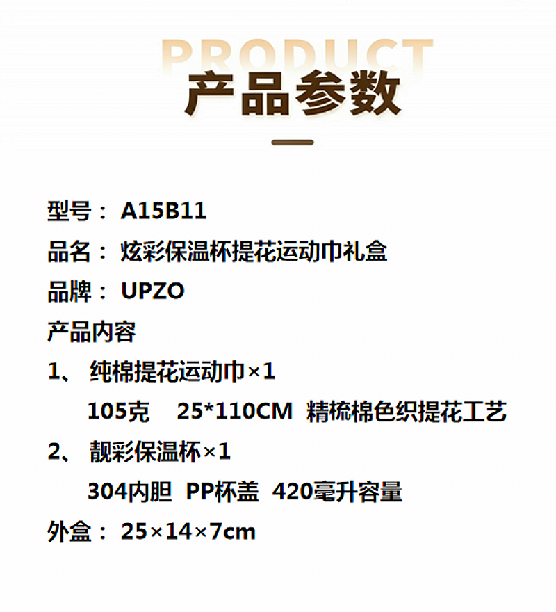 配置清单: 纯棉提花运动巾*1、靓彩保温杯*1、礼盒