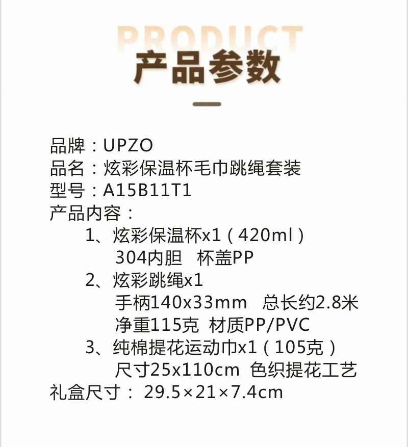 配置清单:炫彩跳绳*1、靓彩保温杯*1、纯棉提花运动巾*1、礼盒*1、拎袋*1