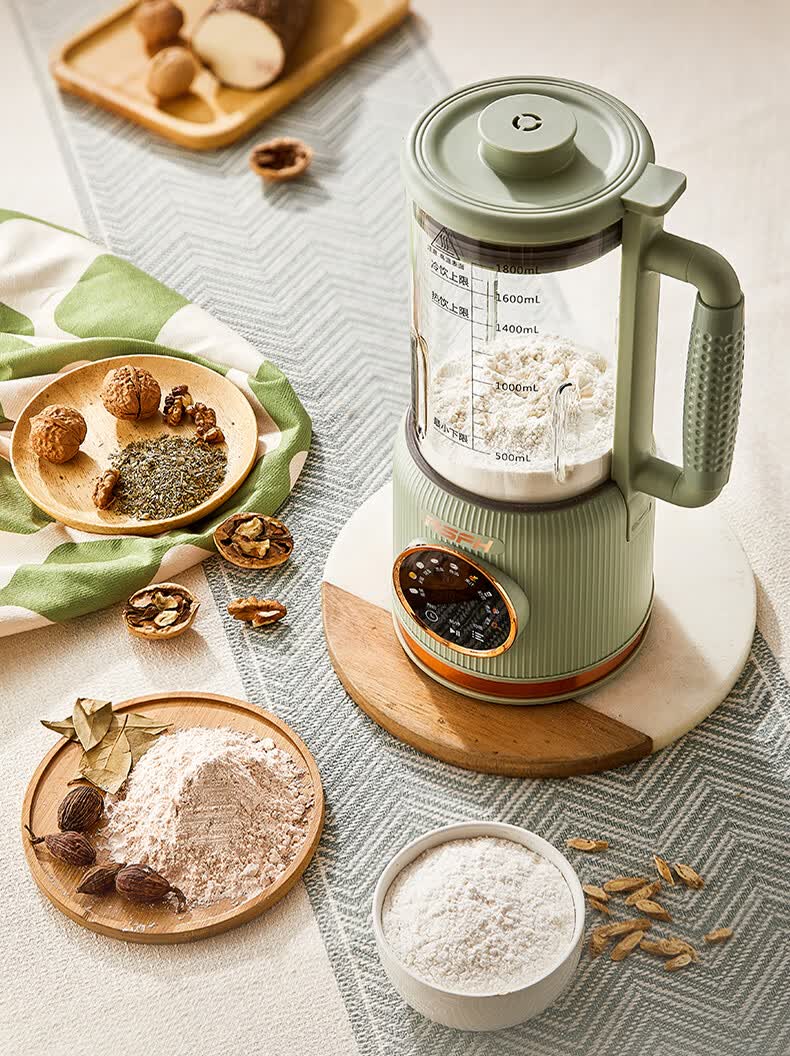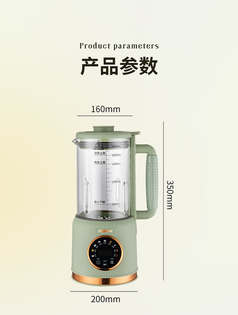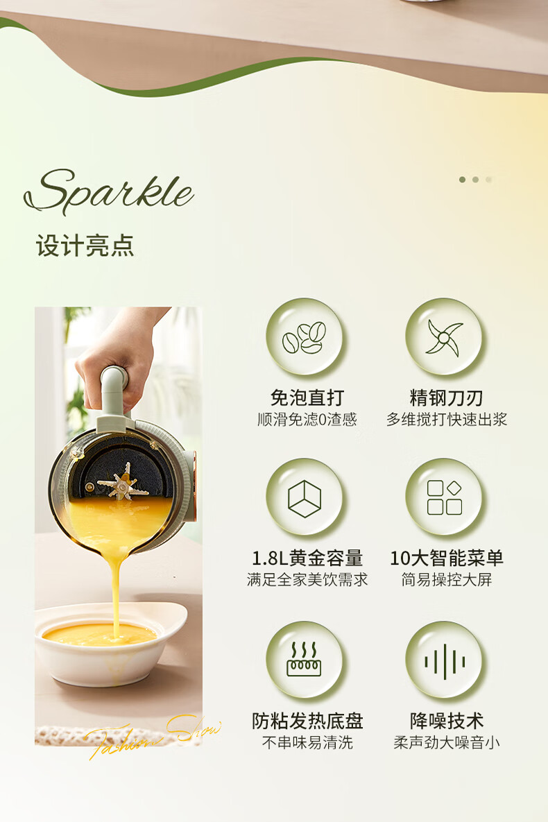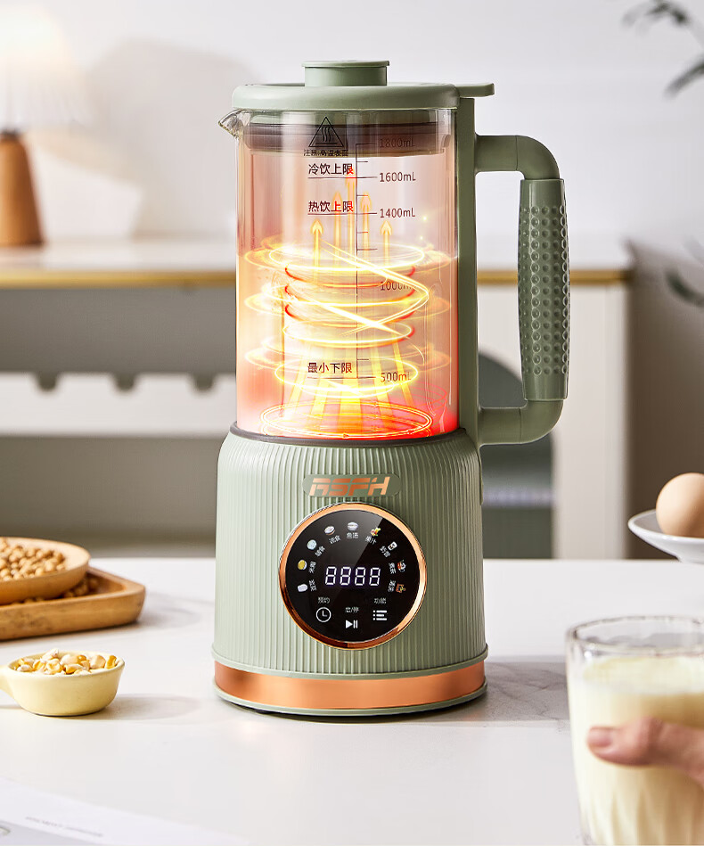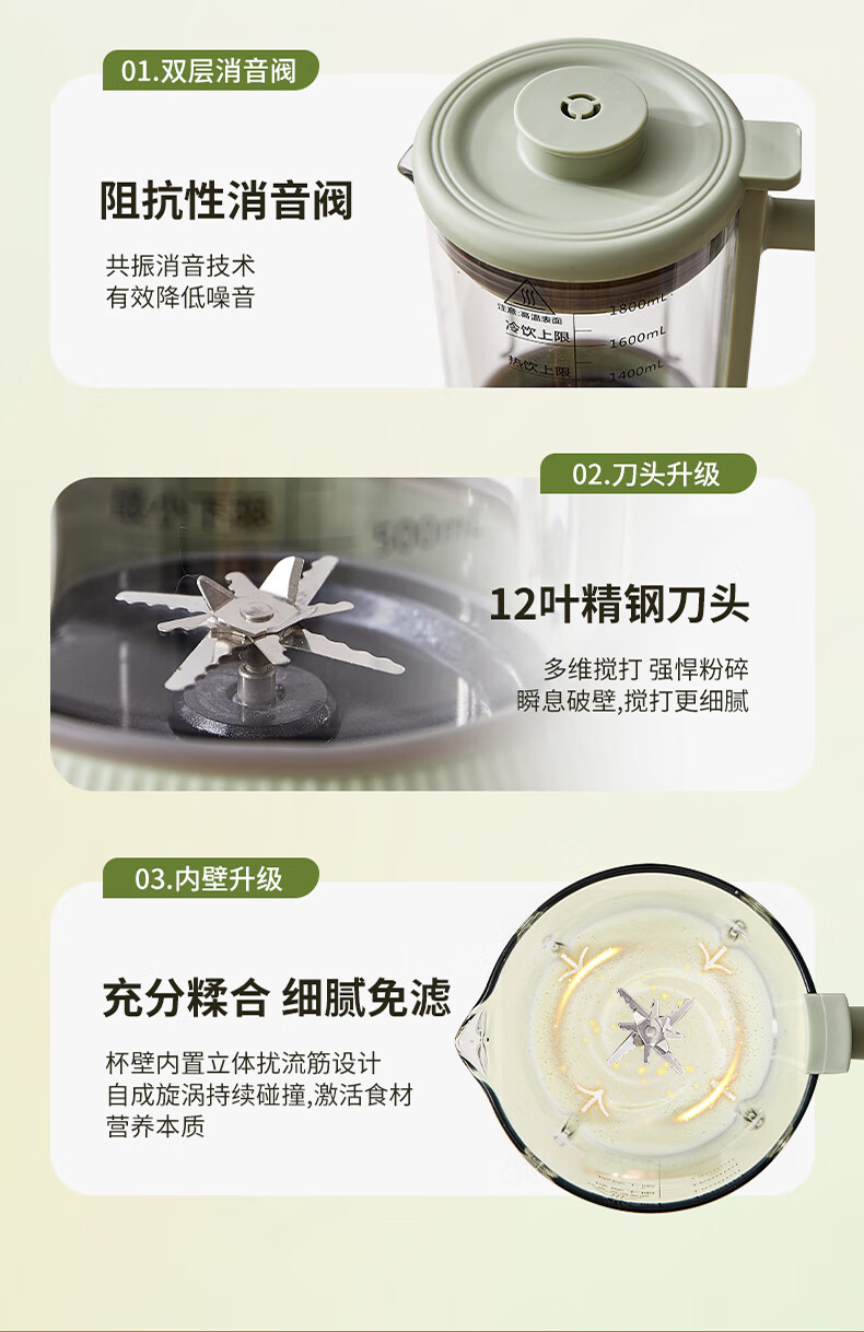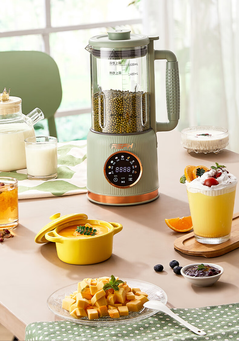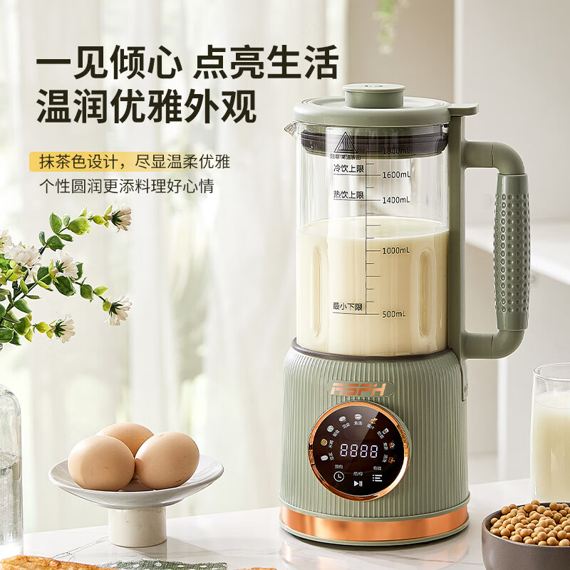 清新抹茶绿,一体设计,1.8L大容量,满足全家需求;12叶304不锈钢刀片,多维度快速绞打,顺滑免过滤;陶瓷釉发热底盘,受热均匀,10大智能菜单,一键触控