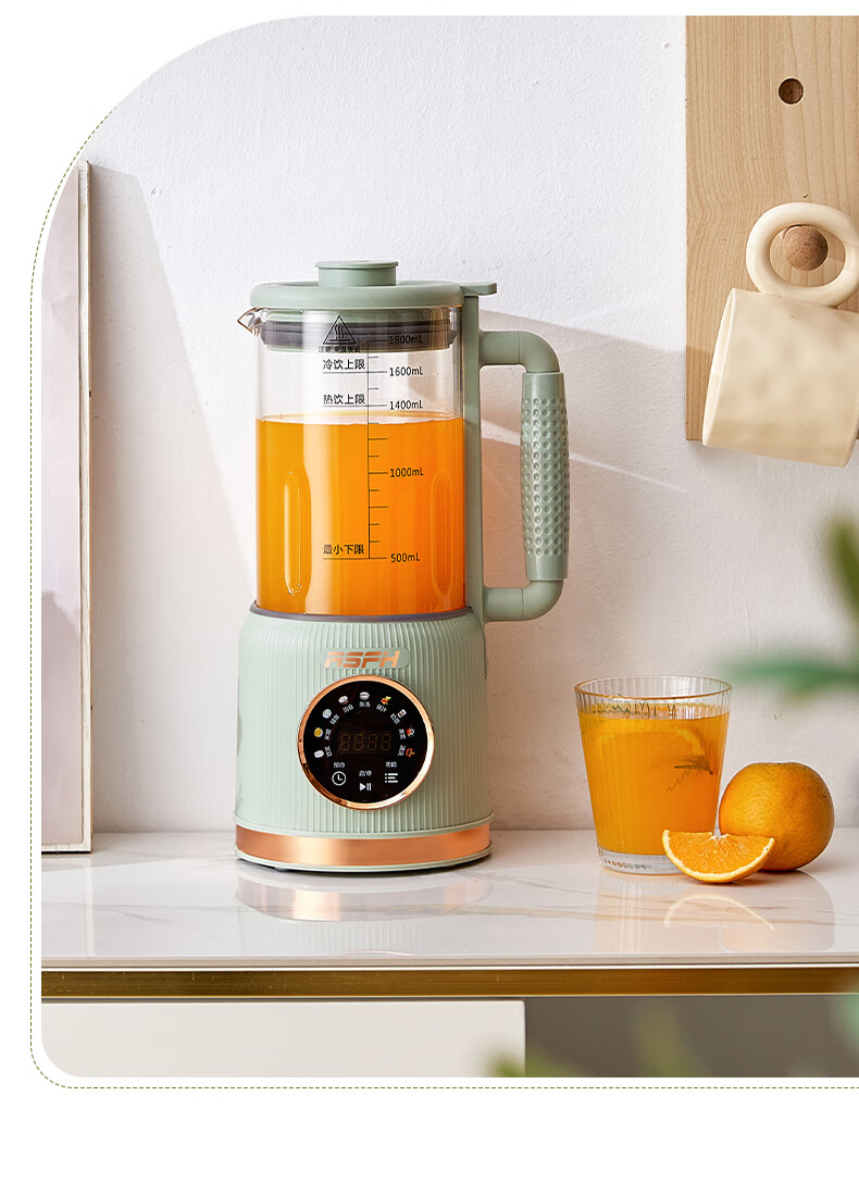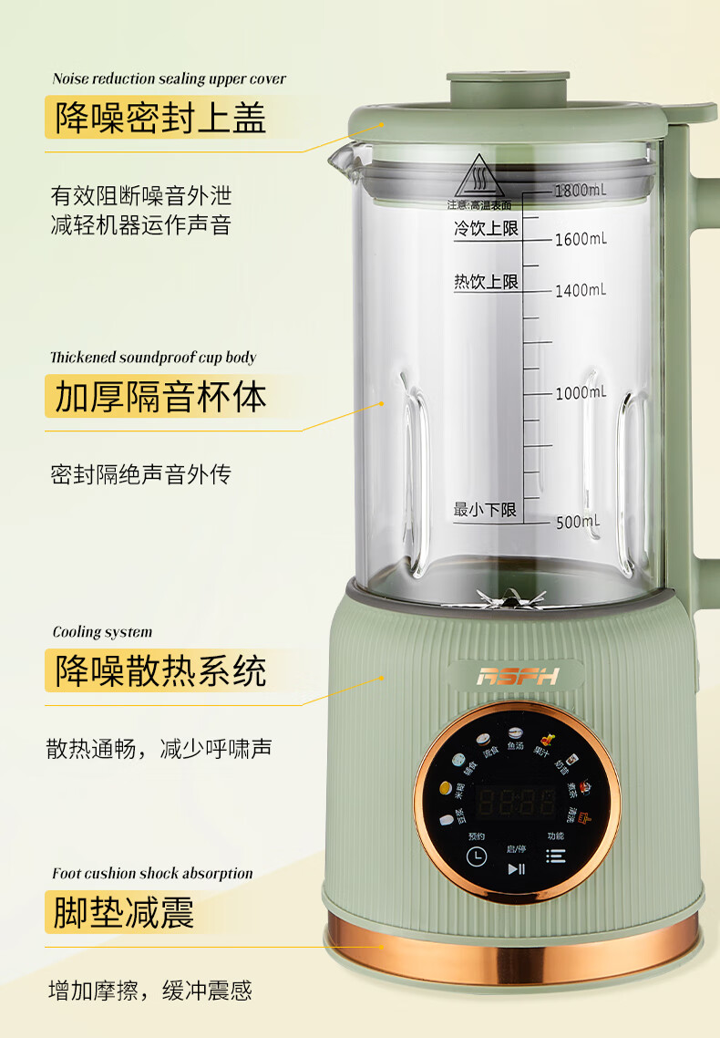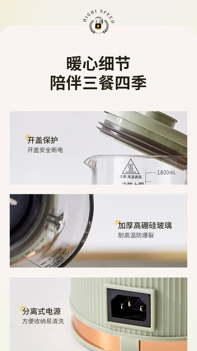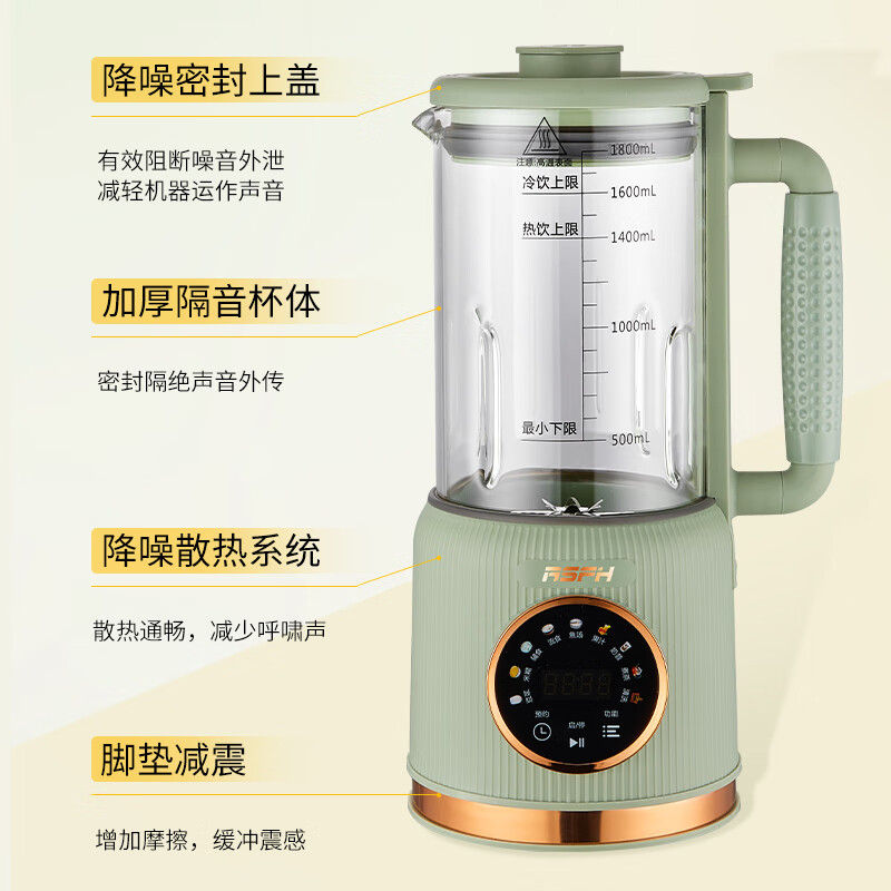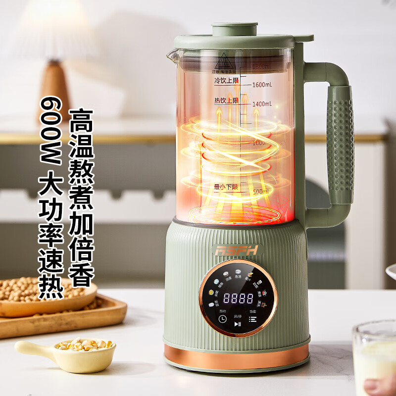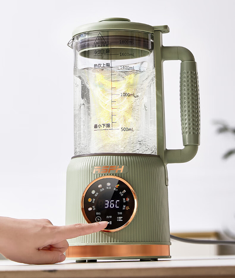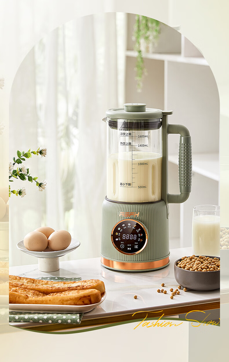 清新抹茶绿,一体设计,1.8L大容量,满足全家需求;12叶304不锈钢刀片,多维度快速绞打,顺滑免过滤;陶瓷釉发热底盘,受热均匀,10大智能菜单,一键触控