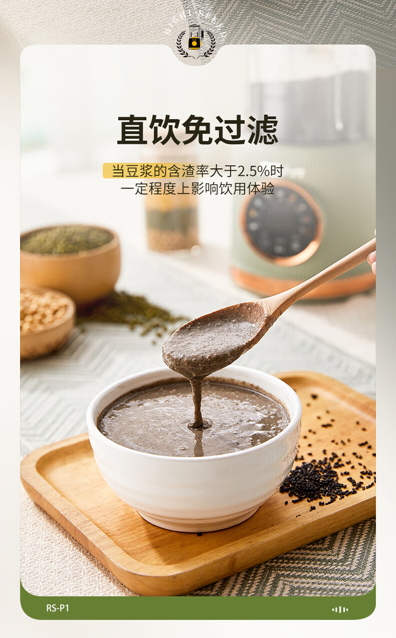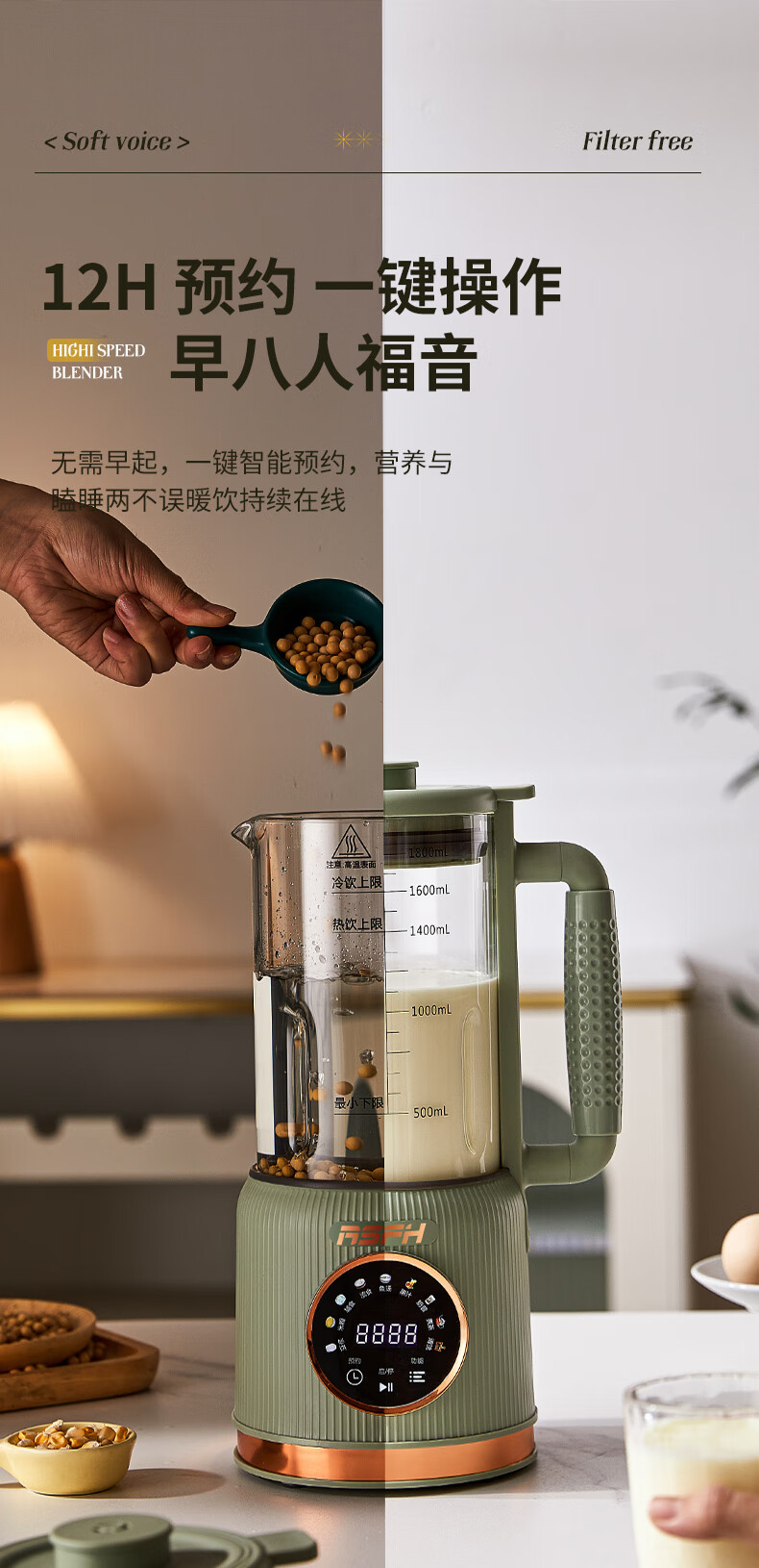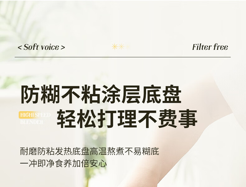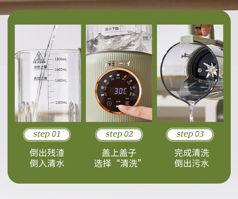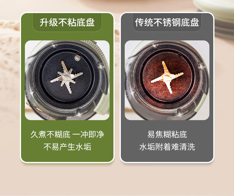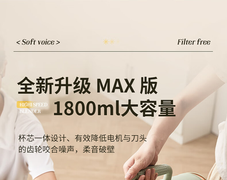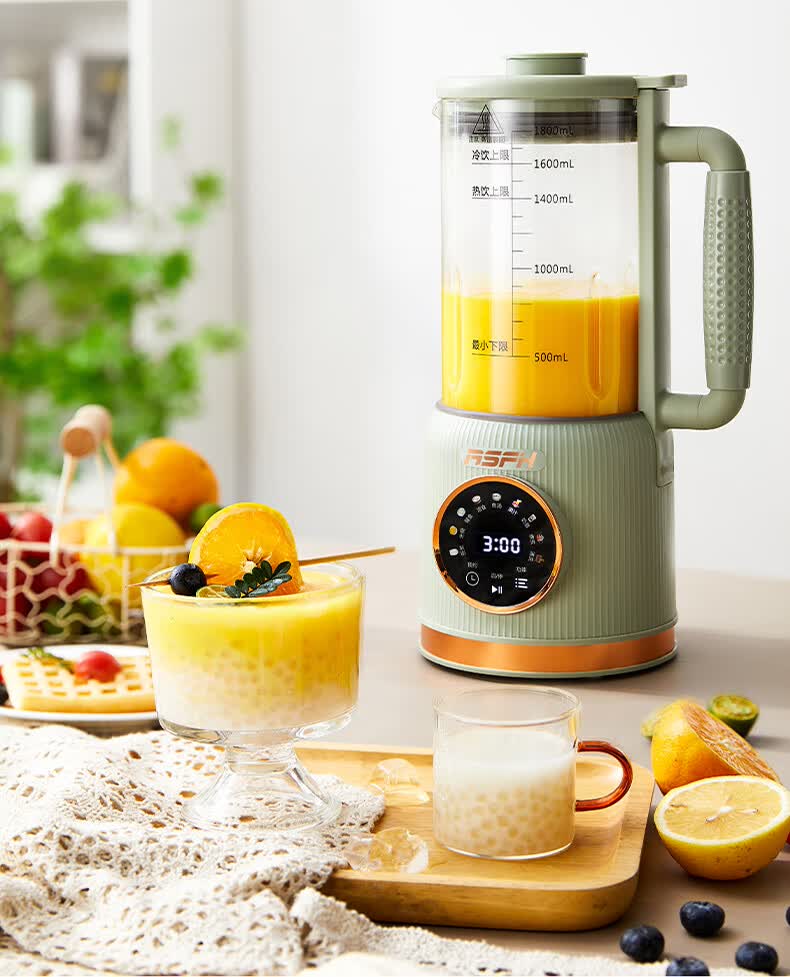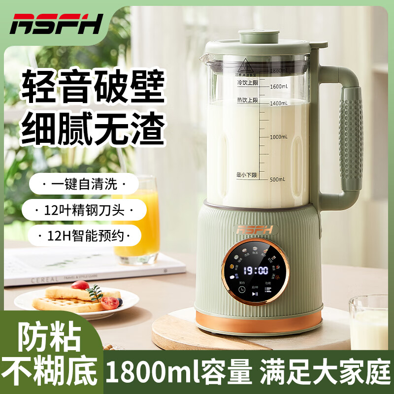 清新抹茶绿,一体设计,1.8L大容量,满足全家需求;12叶304不锈钢刀片,多维度快速绞打,顺滑免过滤;陶瓷釉发热底盘,受热均匀,10大智能菜单,一键触控