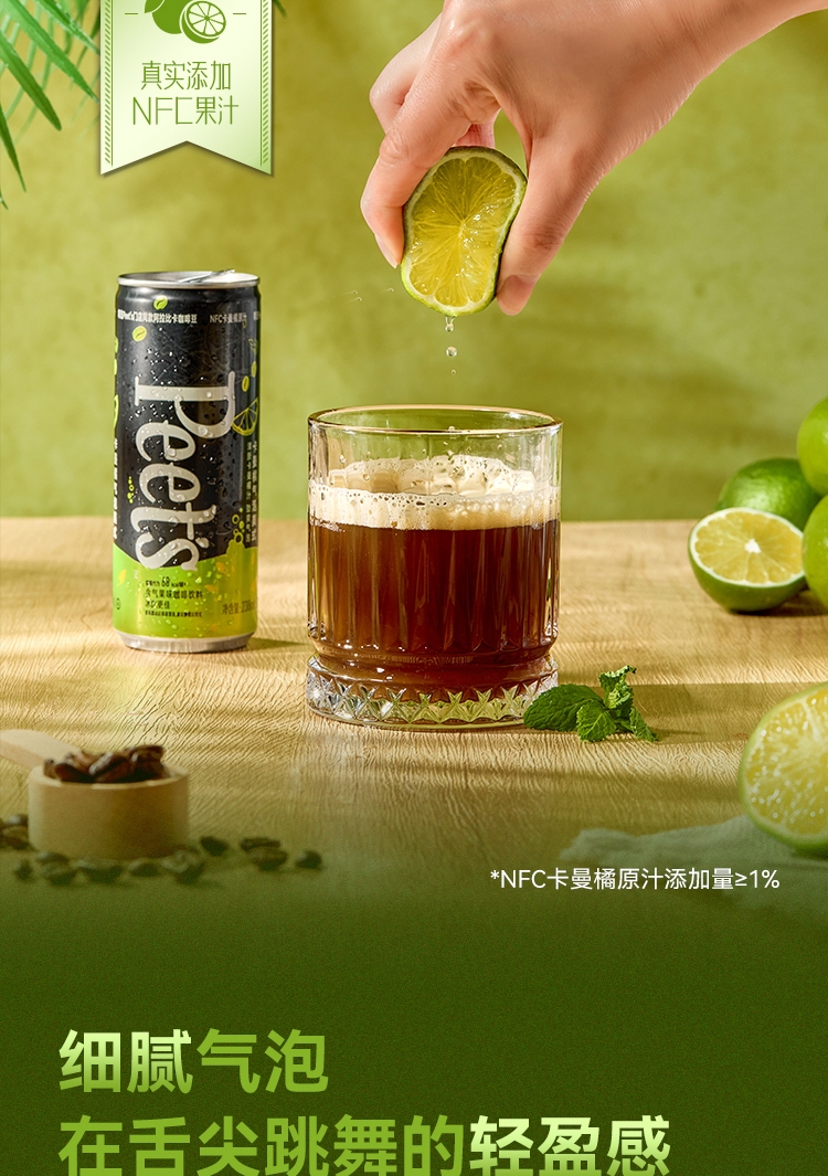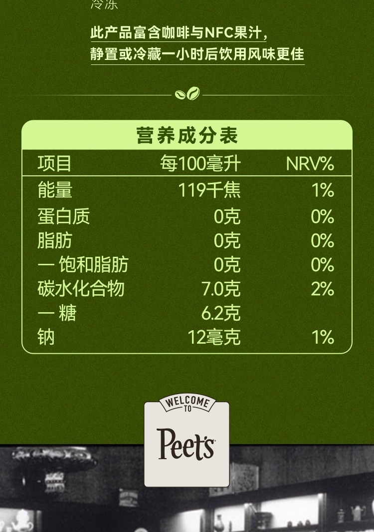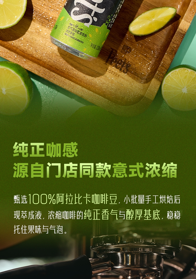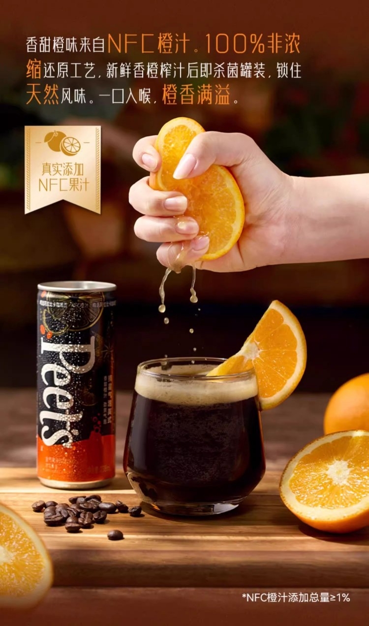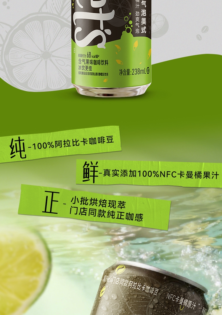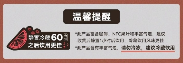 纯-100%阿拉比卡咖啡豆;鲜-真实添加100%NFC果汁;正-手工烘焙现萃,门店同款纯正咖感