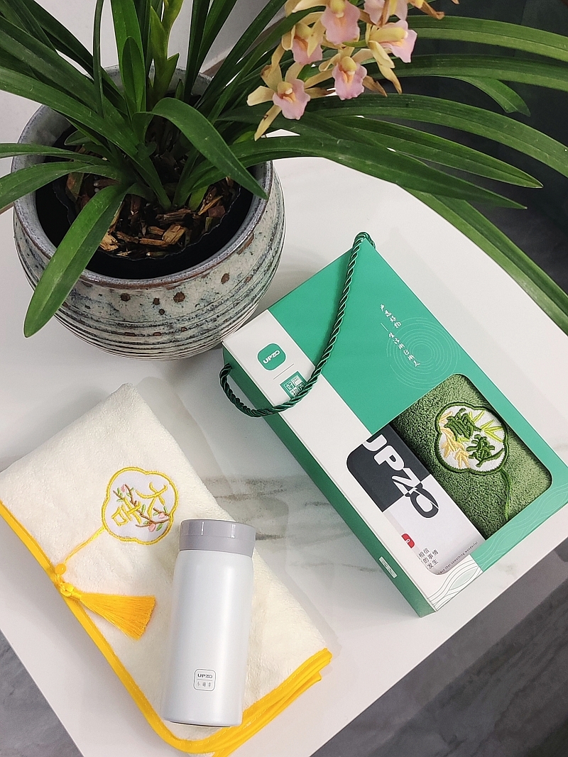 小确幸主题杯 设计融入祝福语 产品撞色搭配;微米国风毛巾 精制包边 厚实面料 结合国风刺绣 ;手提盒设计 顺遂主题融入 优质伴手礼