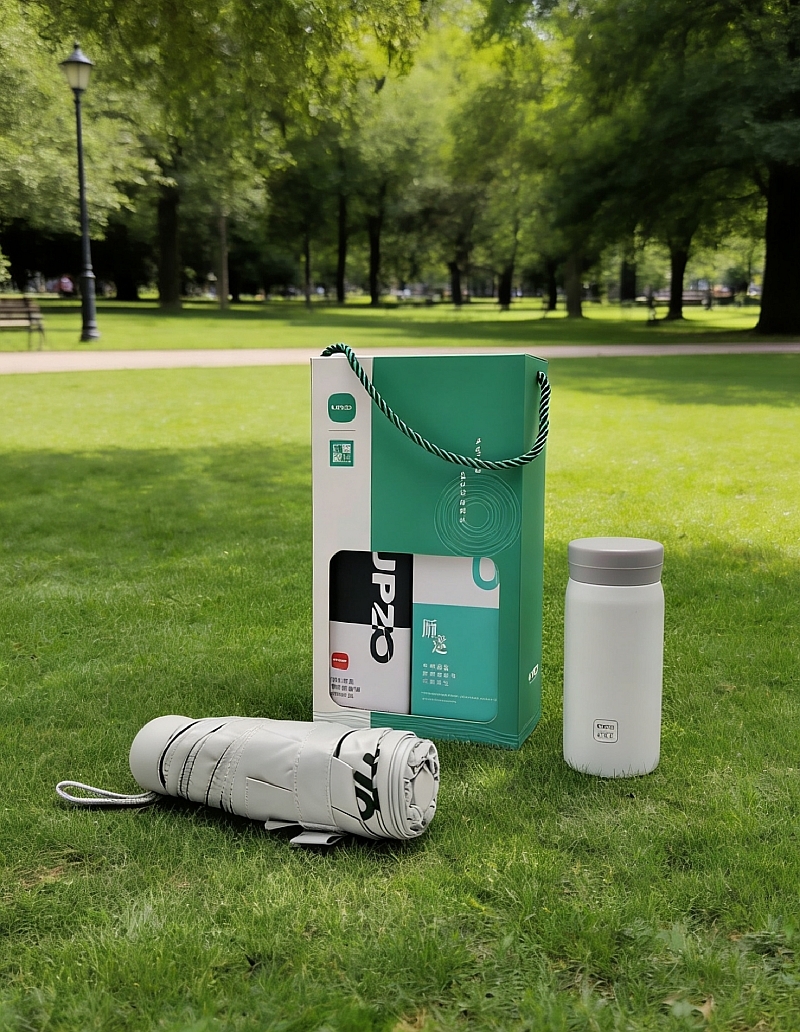 小确幸主题杯 设计融入祝福语 杯体撞色搭配 ;晴雨两用伞 90直径 6骨 色彩靓丽 ;手提盒设计 顺遂主题融入 优质伴手礼