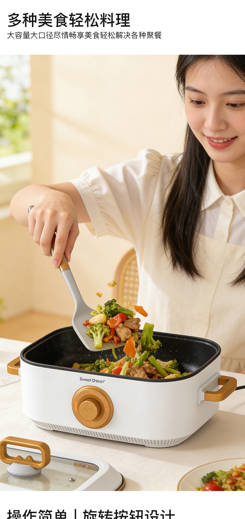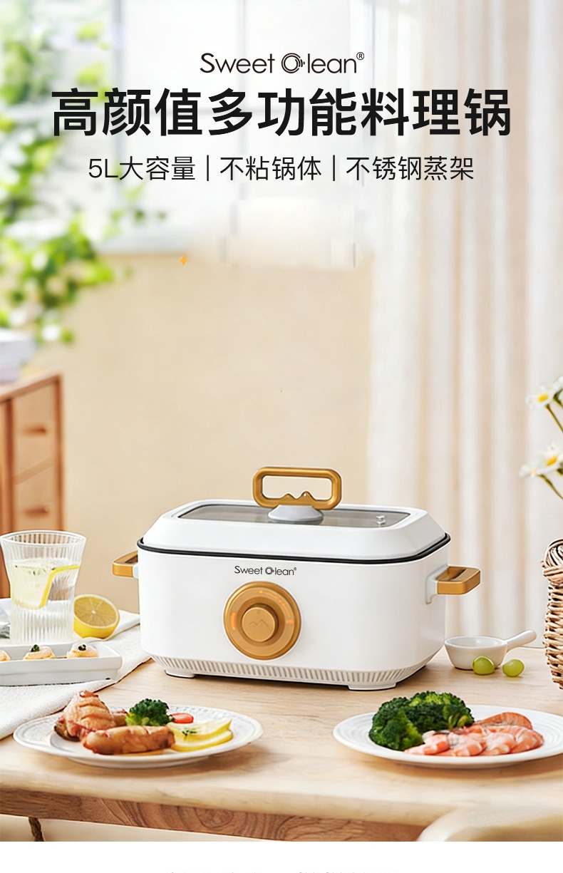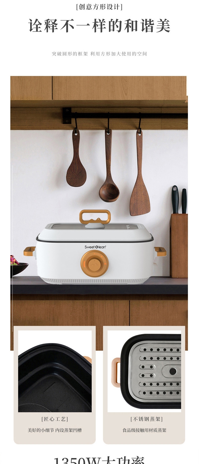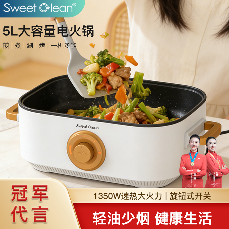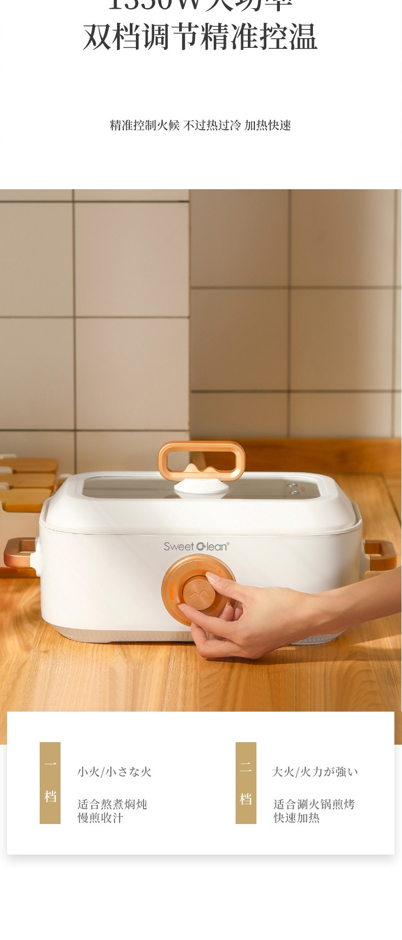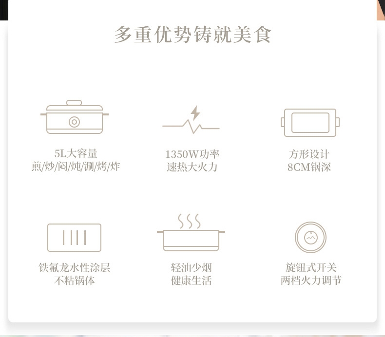 多种美食 轻松料理5L大容量大口径尽情畅享美食轻松;双档机械操控简易便捷 体面优雅随行;铁氟龙水性涂层不粘锅易清洗耐用不发热一冲一擦即净;一锅多用蒸/煎/炒/闷/炖/烤/涮/炸多餐美味;1350W大功率旋钮开关两档火力调温控制