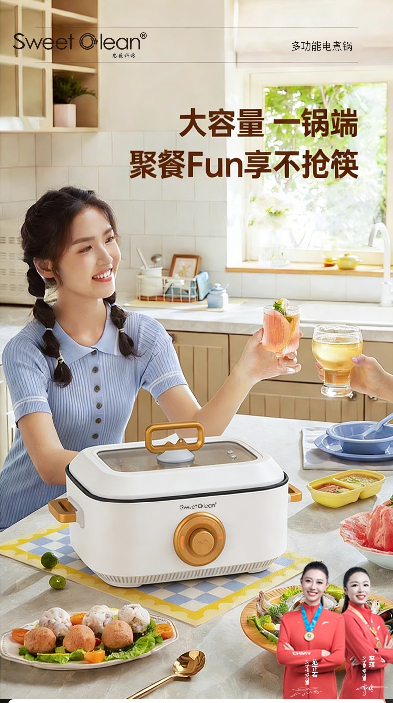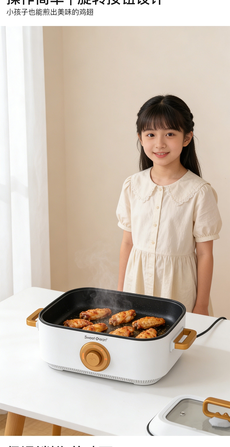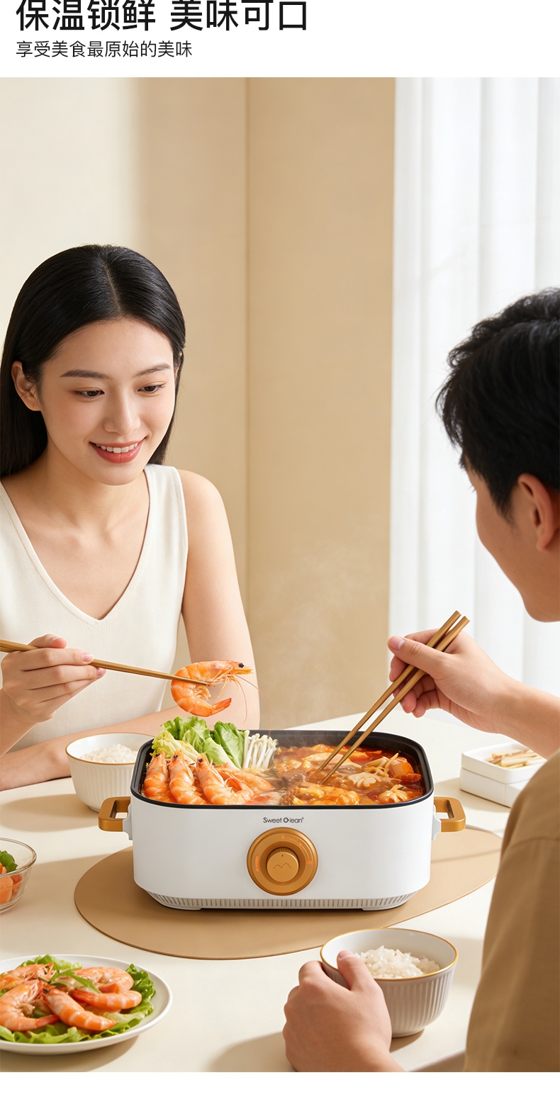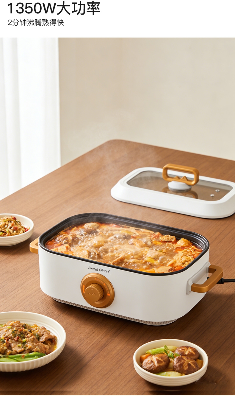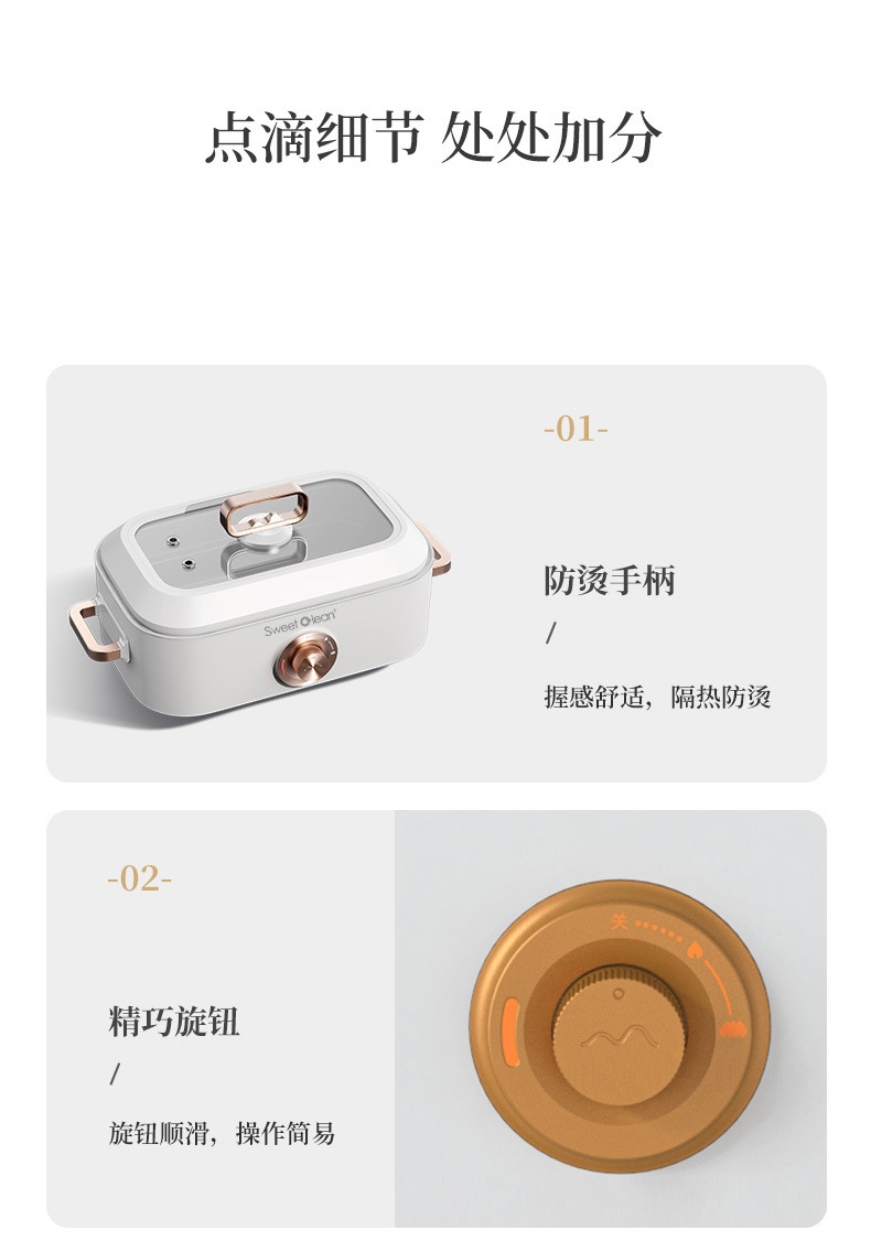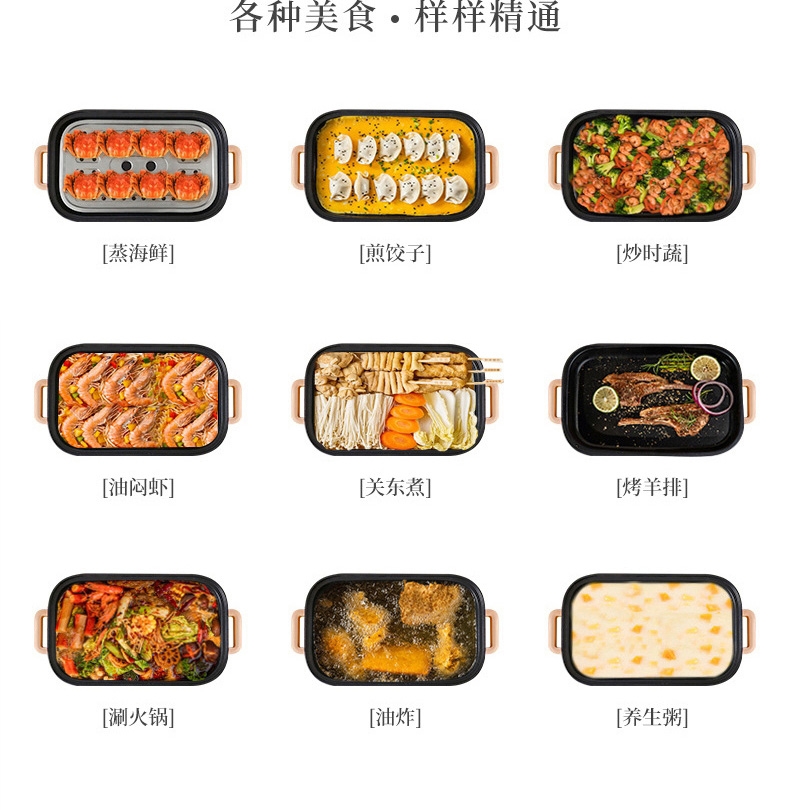 多种美食 轻松料理5L大容量大口径尽情畅享美食轻松;双档机械操控简易便捷 体面优雅随行;铁氟龙水性涂层不粘锅易清洗耐用不发热一冲一擦即净;一锅多用蒸/煎/炒/闷/炖/烤/涮/炸多餐美味;1350W大功率旋钮开关两档火力调温控制
