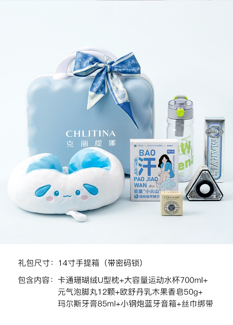 配置清单:卡通珊瑚绒U型枕+欧舒丹乳木果香皂50g+运动水杯700ml+玛尔斯牙膏85ml+元气泡脚丸12颗+小钢炮蓝牙音箱