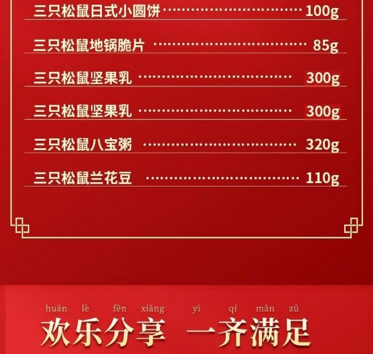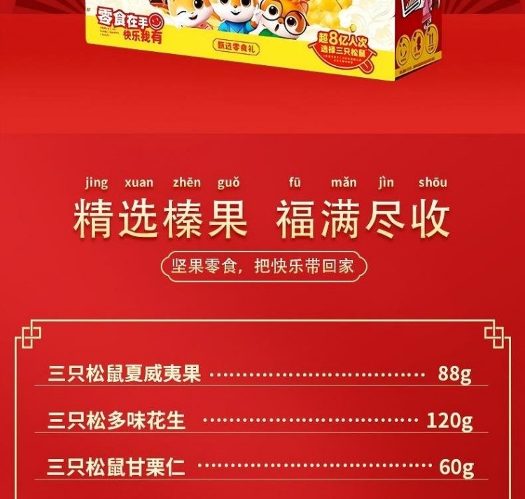 配置清单:三只松鼠-夏威夷果88g 三只松鼠-甘栗仁60g 三只松鼠-多味花生120g 三只松鼠-兰花豆110g 三只松鼠-日式小圆饼100g 三只松鼠-地锅脆片85g 三只松鼠-八宝粥320g 三只松鼠-坚果乳300g 三只松鼠-坚果乳300g