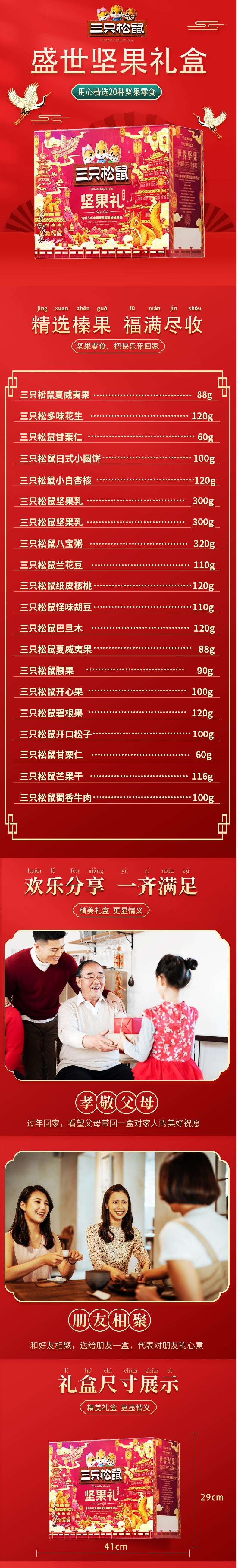 配置清单:三只松鼠-开心果100g 三只松鼠-碧根果120g 三只松鼠-开口松子100g 三只松鼠-夏威夷果88g 三只松鼠-夏威夷果88g 三只松鼠-巴旦木120g 三只松鼠-腰果90g 三只松鼠-小白杏120g 三只松鼠-纸皮核桃120g 三只松鼠-甘栗仁60g 三只松鼠-甘栗仁60g 三只松鼠-芒果干116g 三只松鼠-蜀香牛肉100g 三只松鼠-多味花生120g 三只松鼠-怪味胡豆110g 三只松鼠-兰花豆110g 三只松鼠-日式小圆饼100g 三只松鼠-八宝粥320g 三只松鼠-坚果乳300g 三只松鼠-坚果乳300g