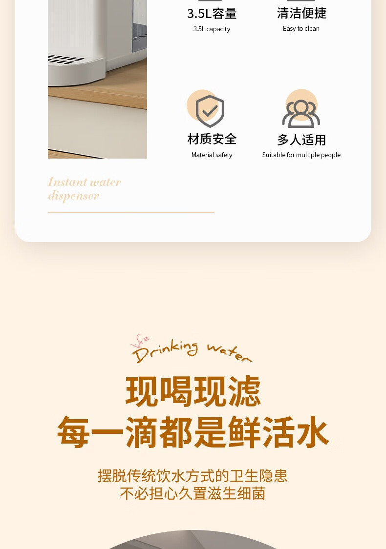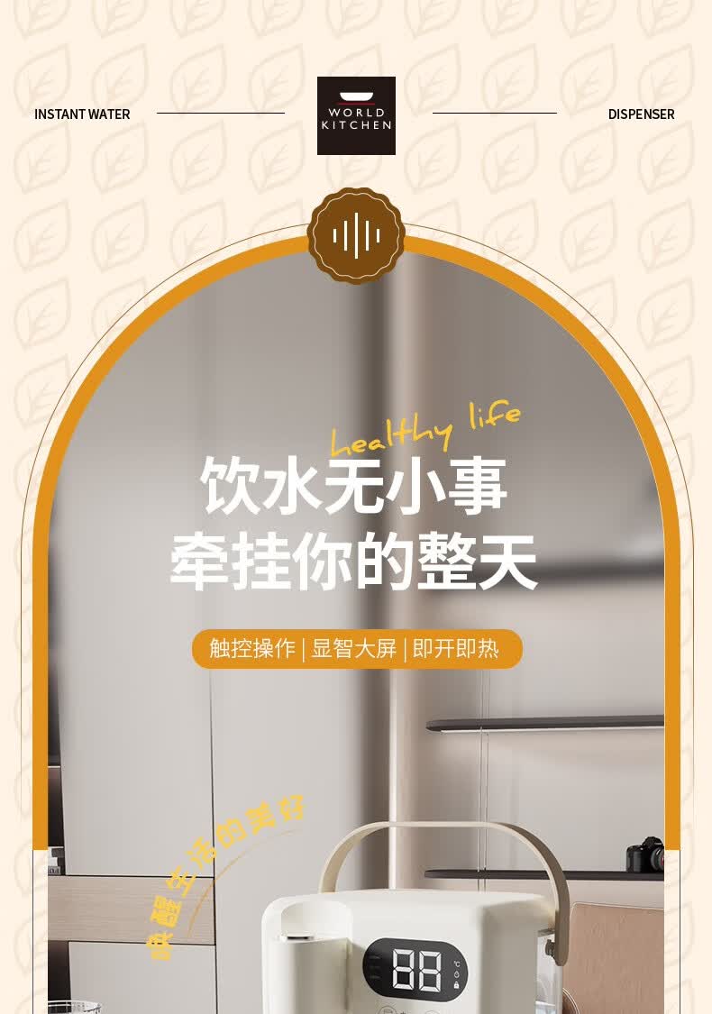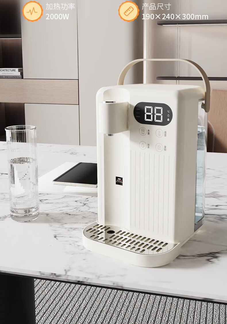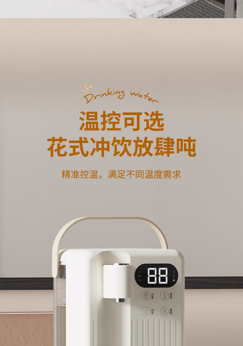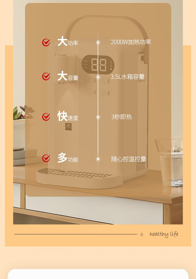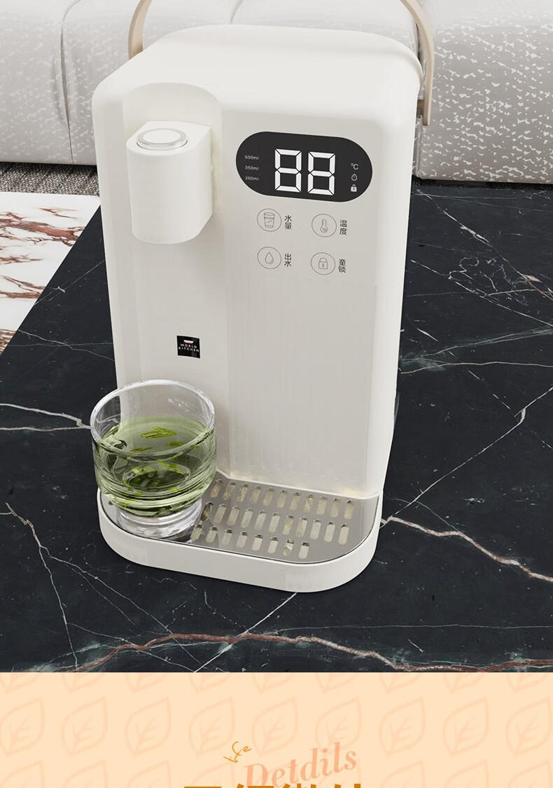 LED显智大屏,一目了然,轻松触控操作;即开即热,3秒出水,随时畅享;水温精细调节,多档即然温控;定量出水,水满即停,一键免看管,省心又便捷 ;3.5L大水箱,轻松满足全家一天的饮水需求