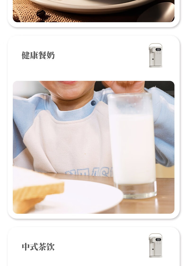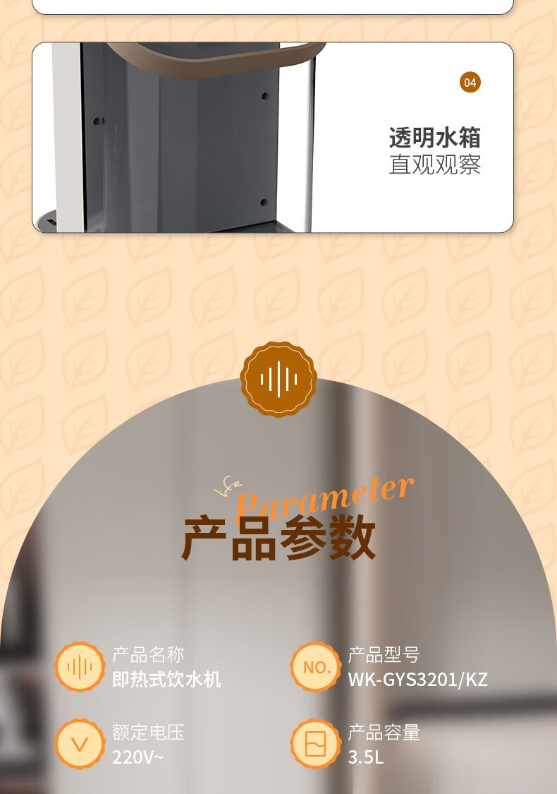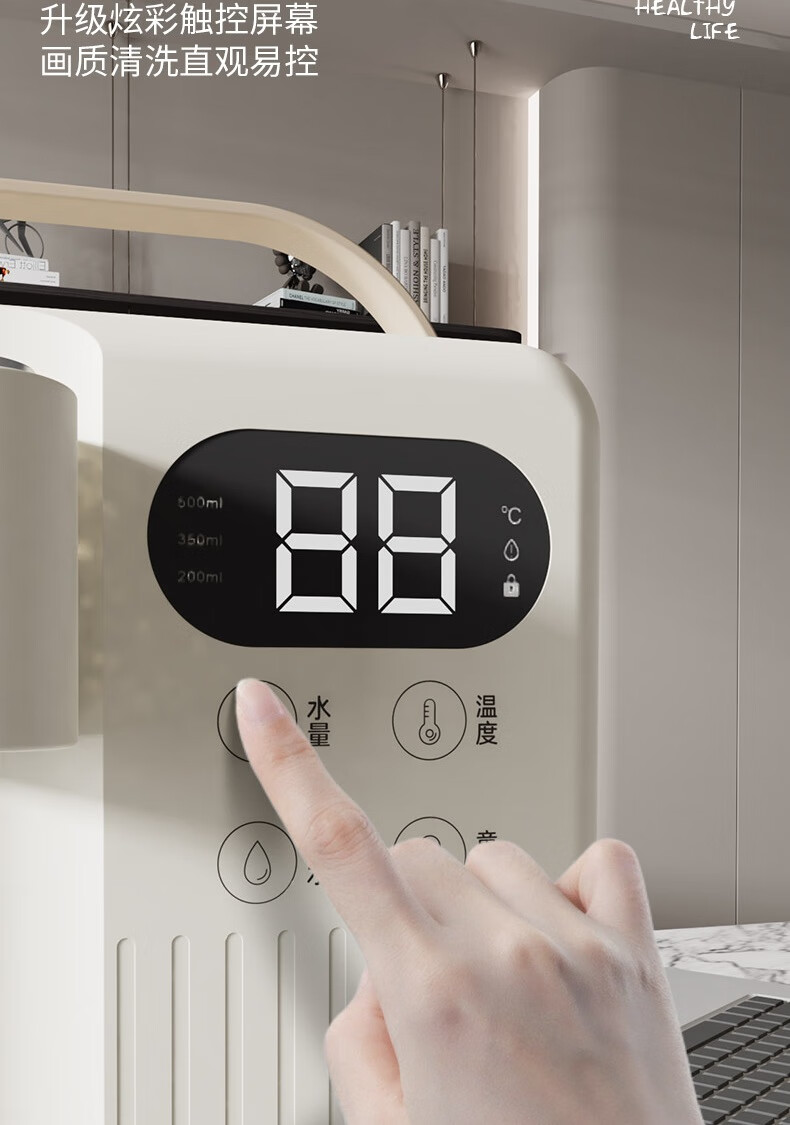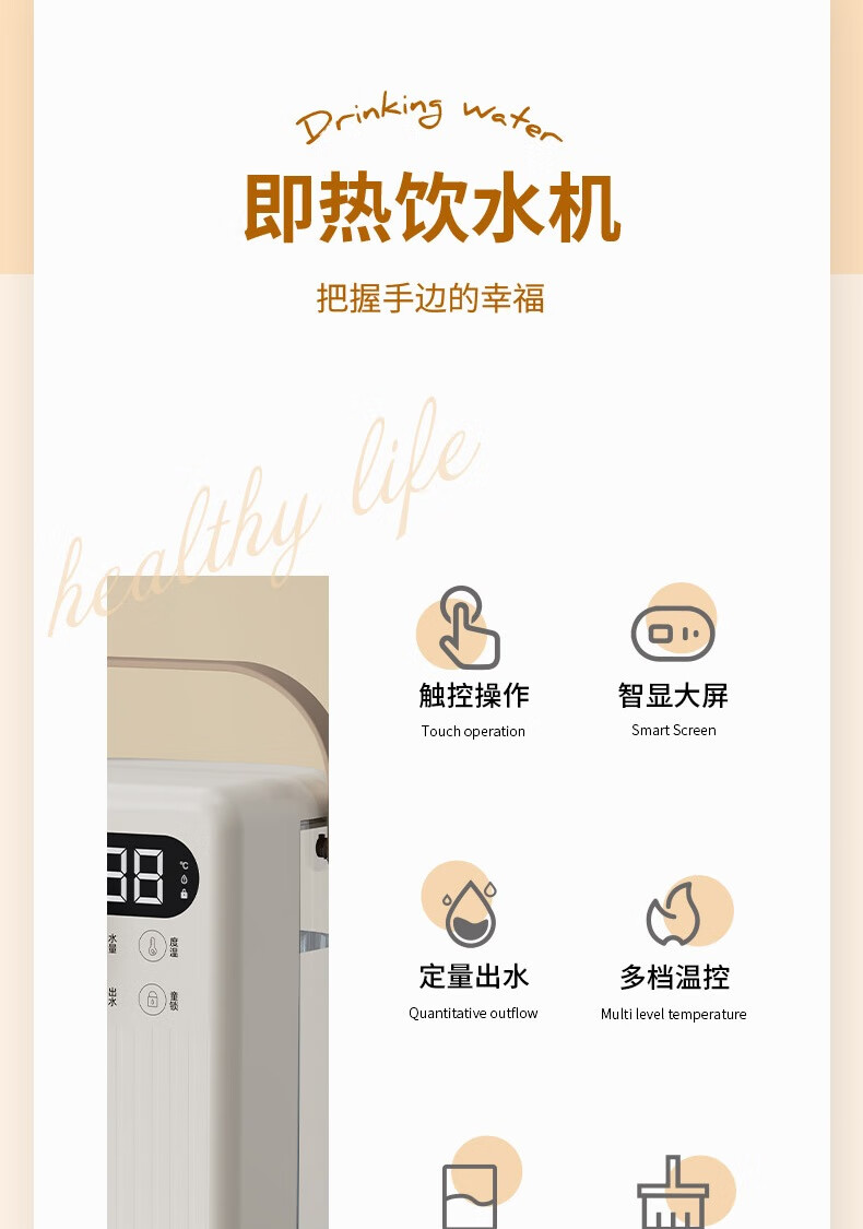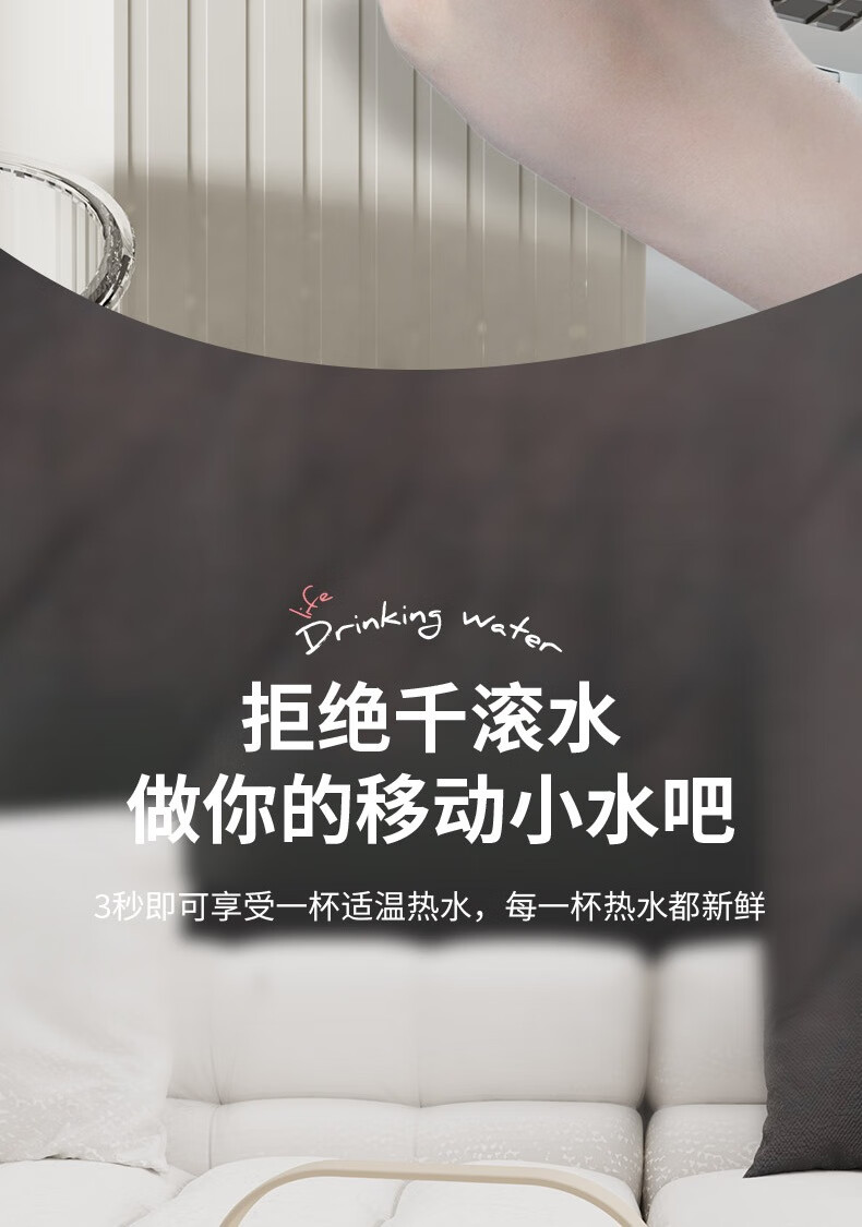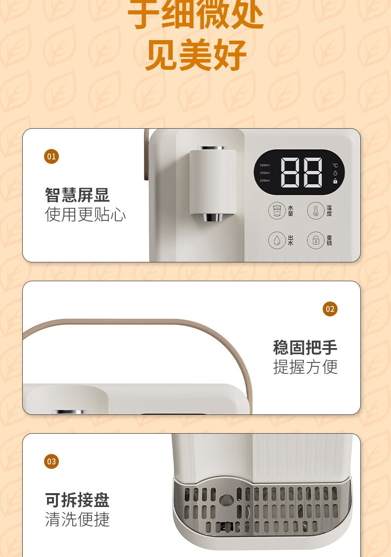 LED显智大屏,一目了然,轻松触控操作;即开即热,3秒出水,随时畅享;水温精细调节,多档即然温控;定量出水,水满即停,一键免看管,省心又便捷 ;3.5L大水箱,轻松满足全家一天的饮水需求