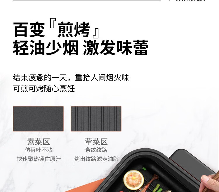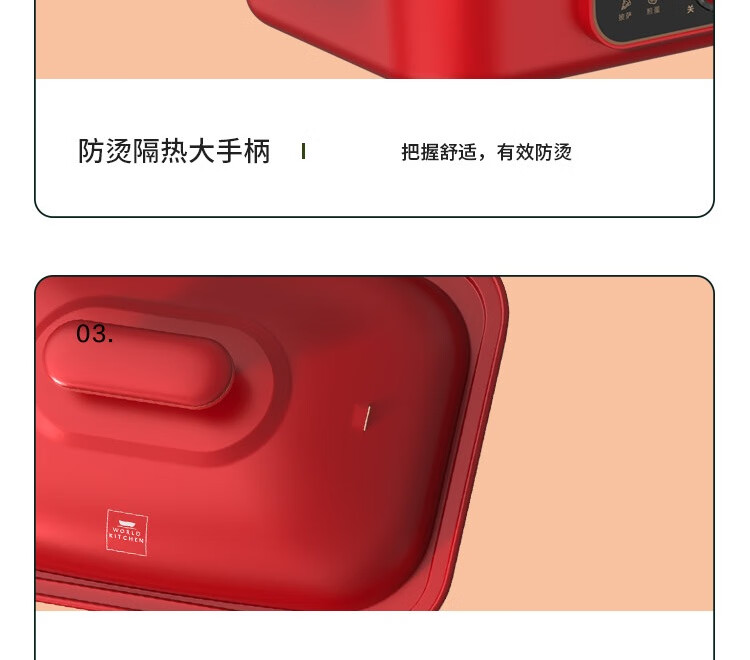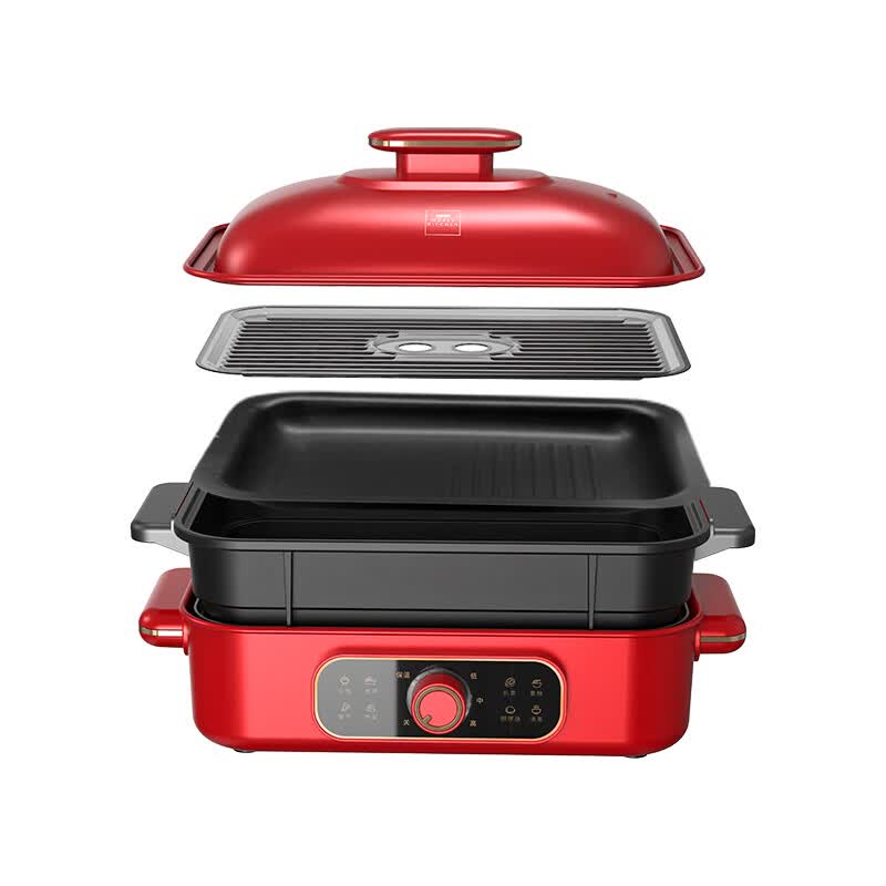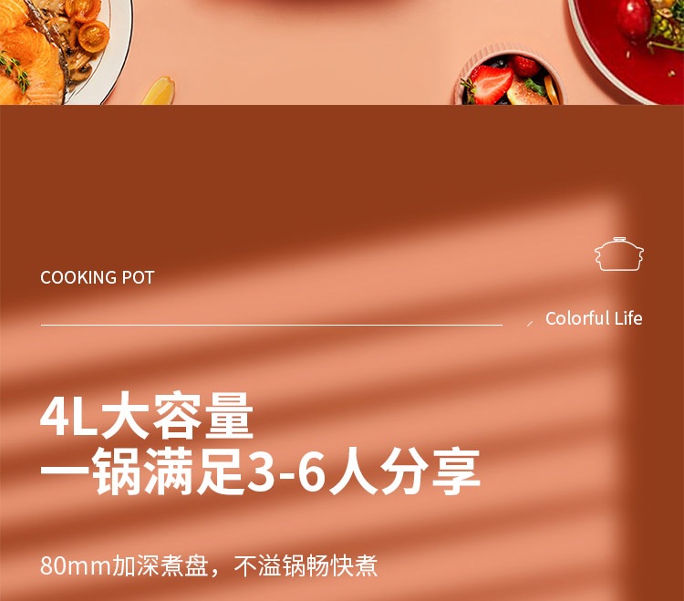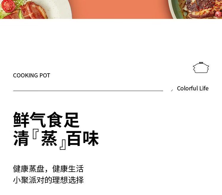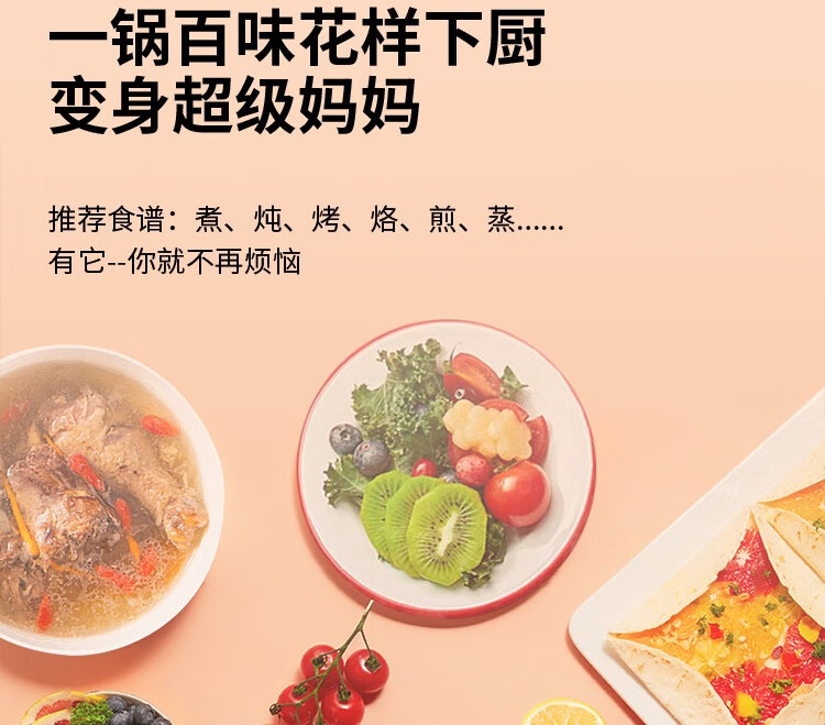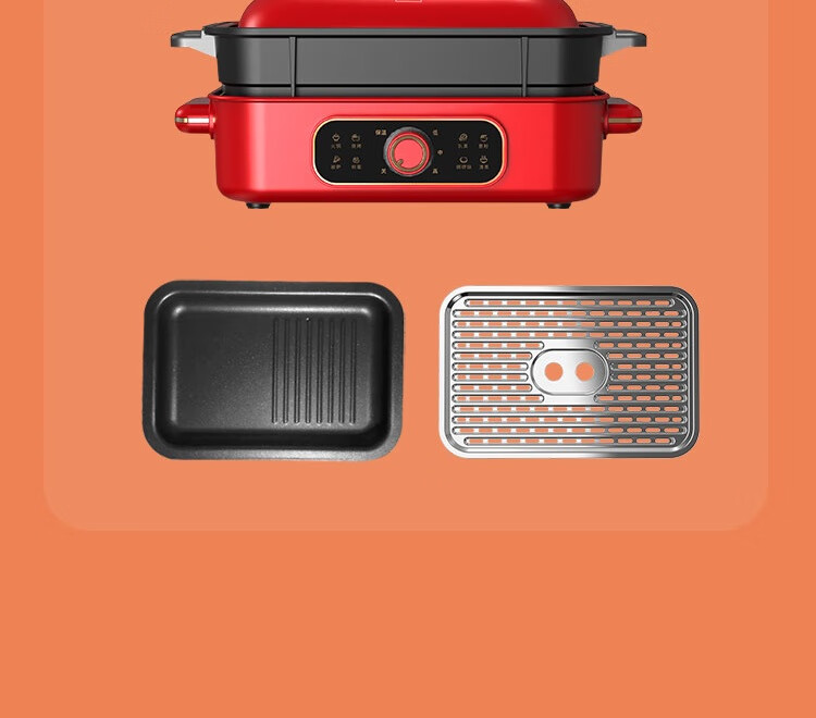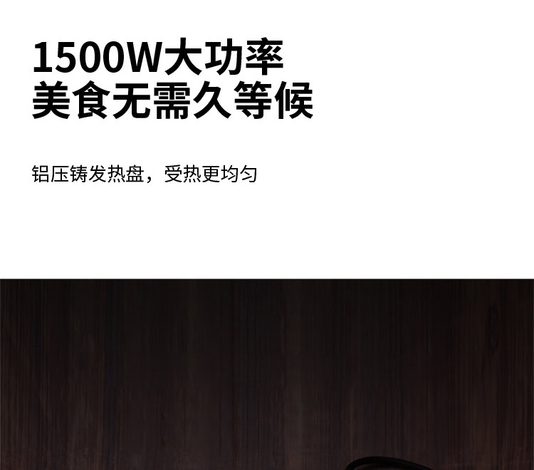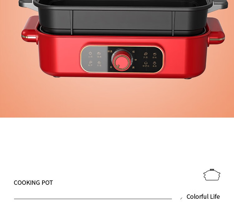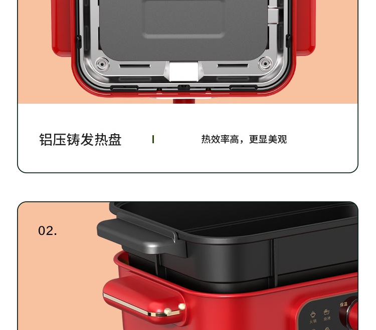 快速加热 , 一锅多用,深煮锅,蒸架等;五档温控,控温更方便;不粘涂层,轻油少烟,防烫手柄;发热盘采用铝压铸,热效率高,更显美观