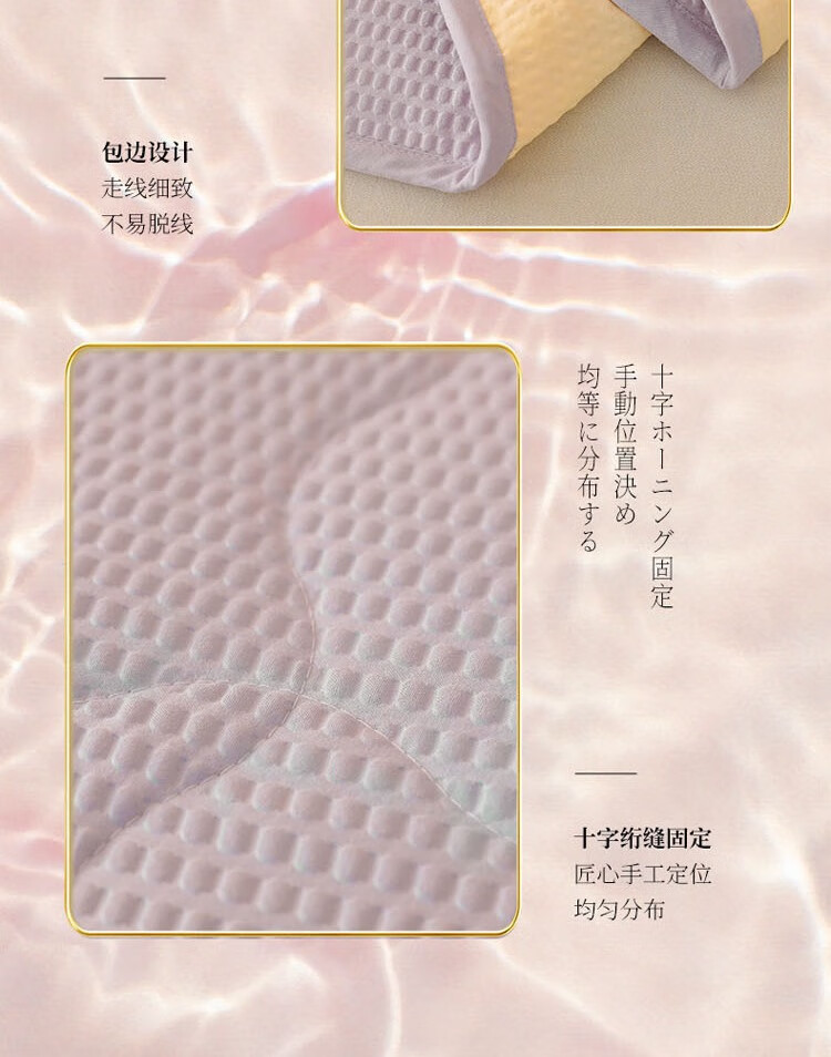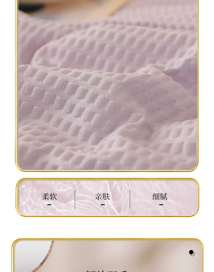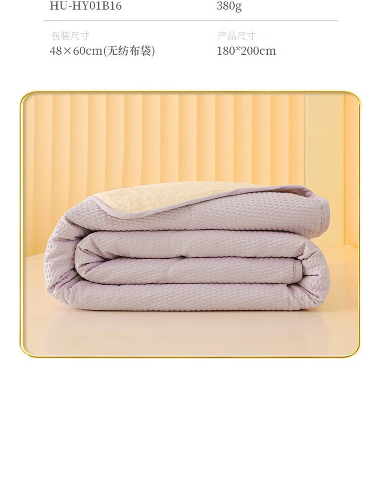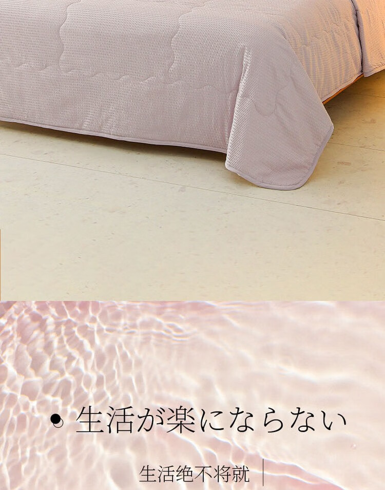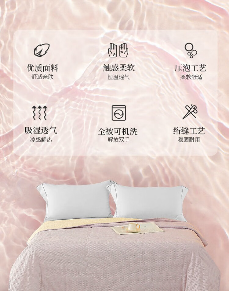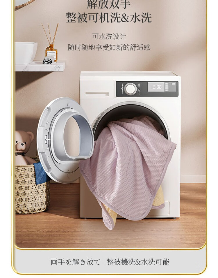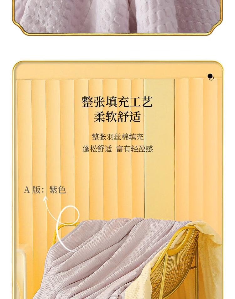 压泡工艺,柔软舒适,手感细腻;整张羽丝棉填充,蓬松舒适,富有轻盈感;精美包边,使被面和填充完美贴合;耐洗耐用,久用如新