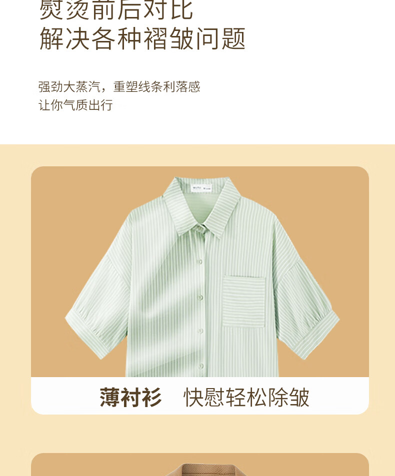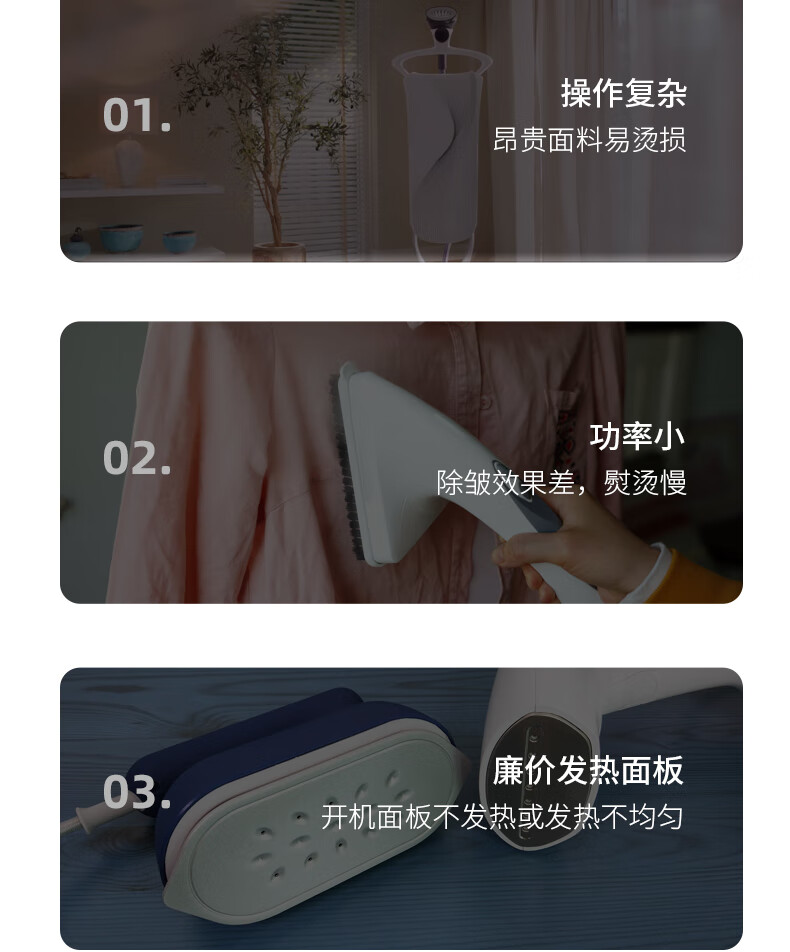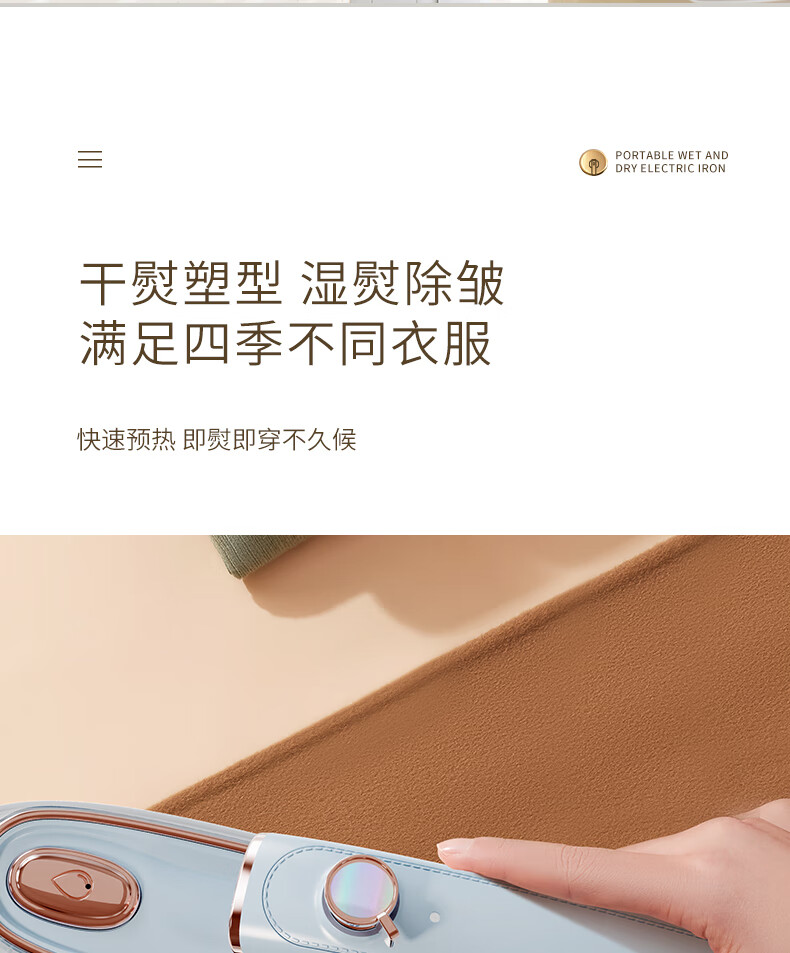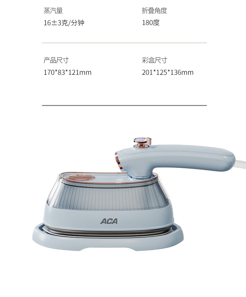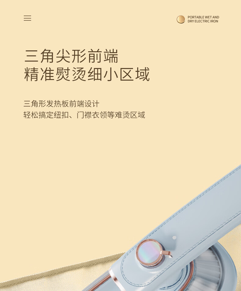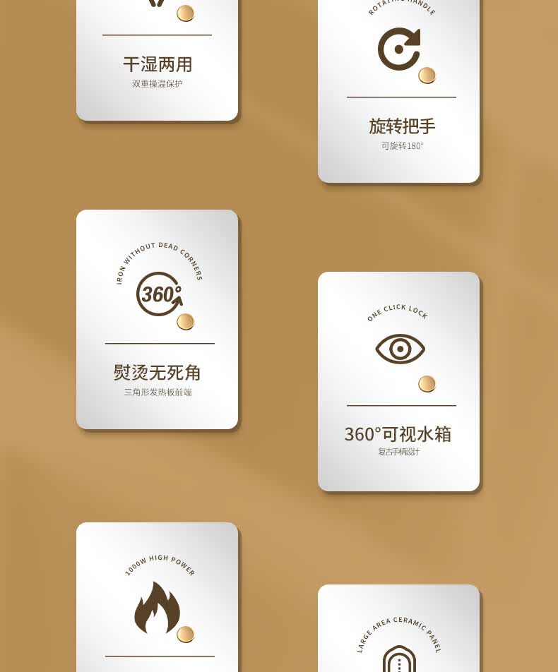 双重操温保护,干湿两用;;旋转把手,多孔大熨烫平面蒸汽底板;360°可视水箱、复古手柄设计