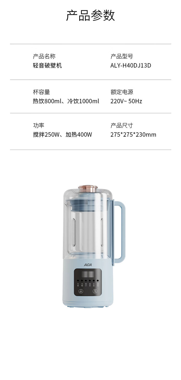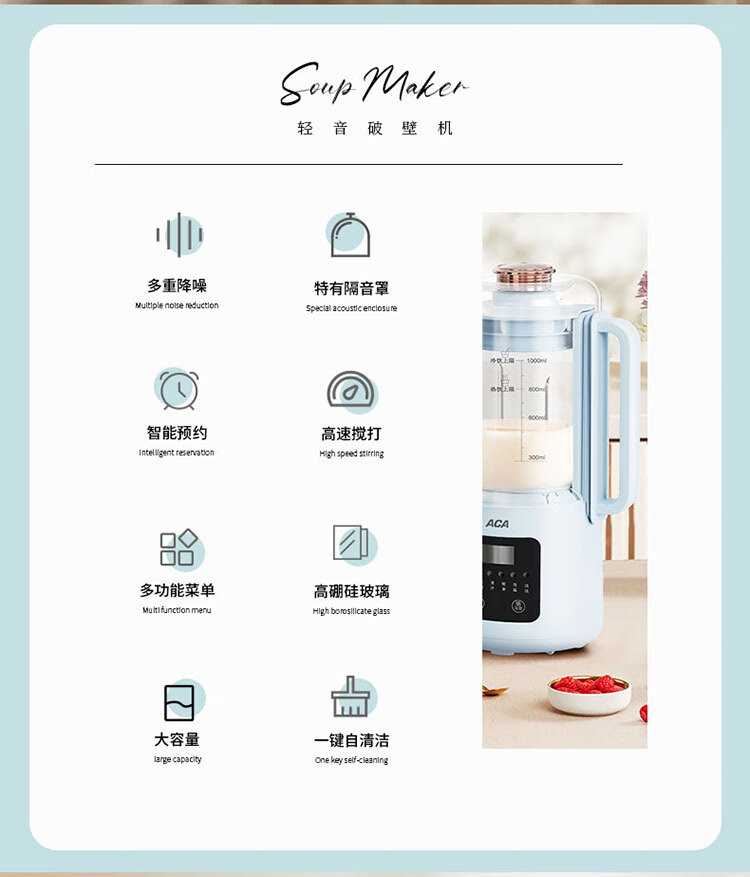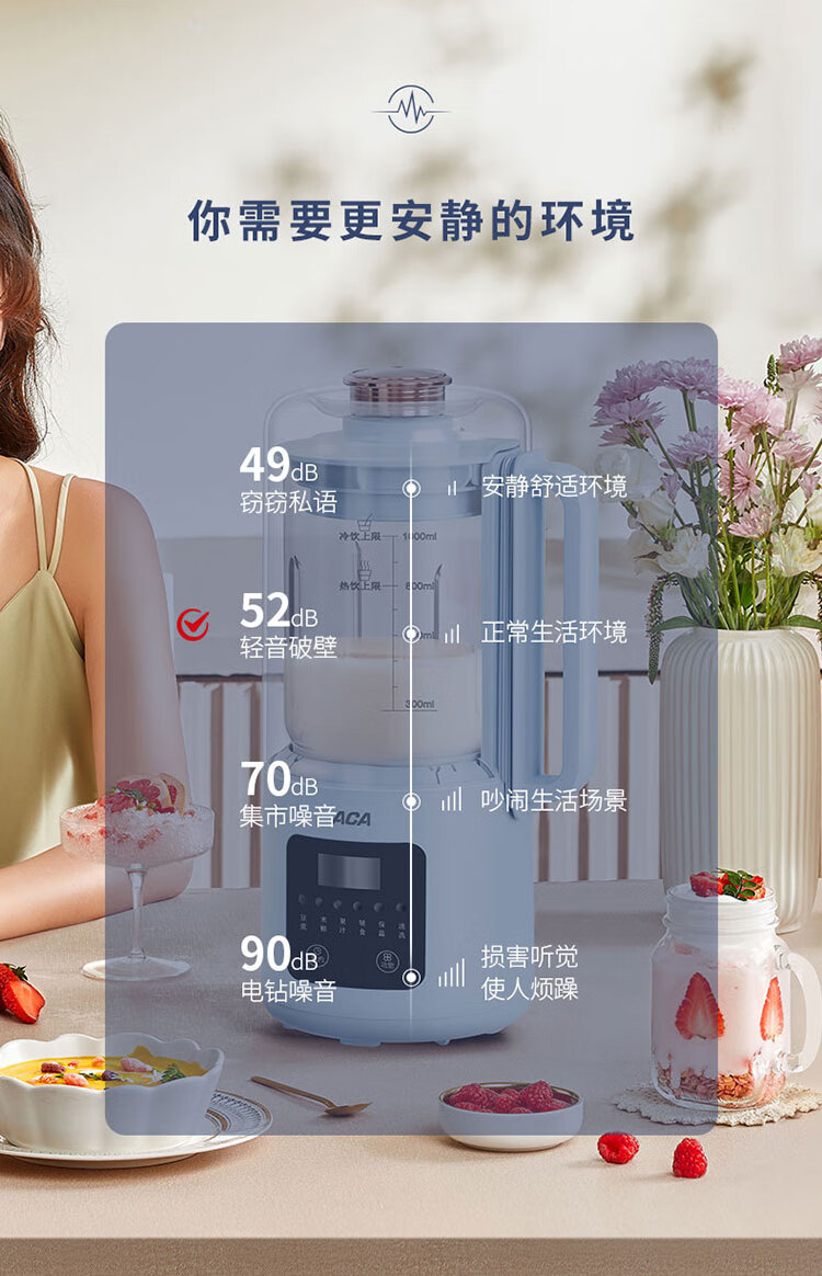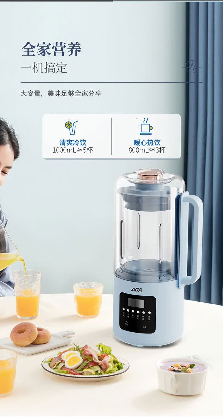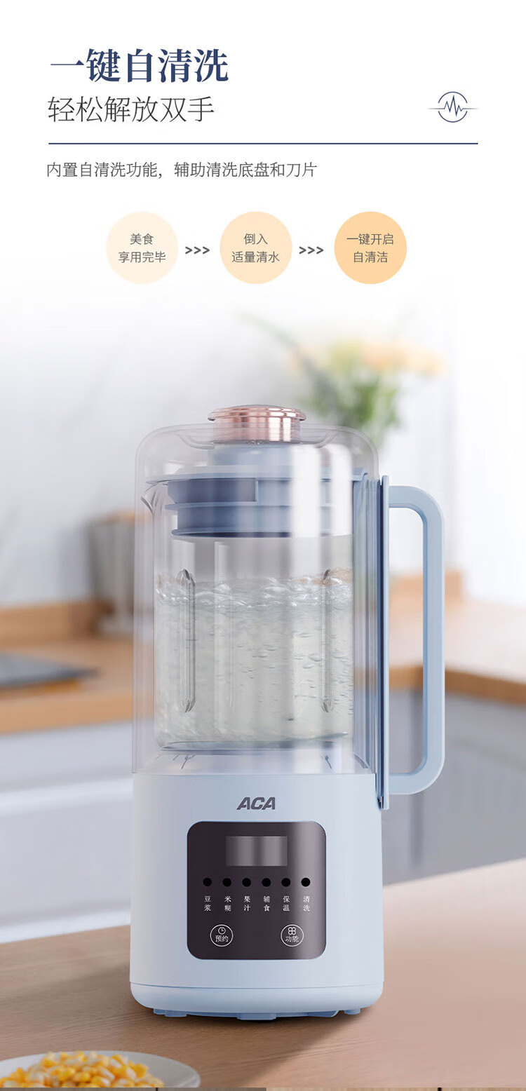 智能显示面板,6大功能随心选;冷热双打一键清洗,一年四季,一键解锁花样饮品;低音运行,细腻无渣好营养