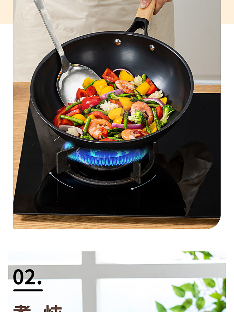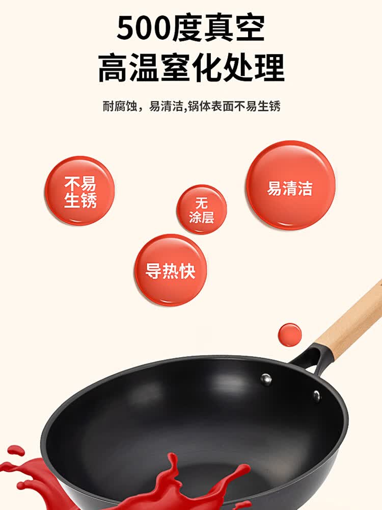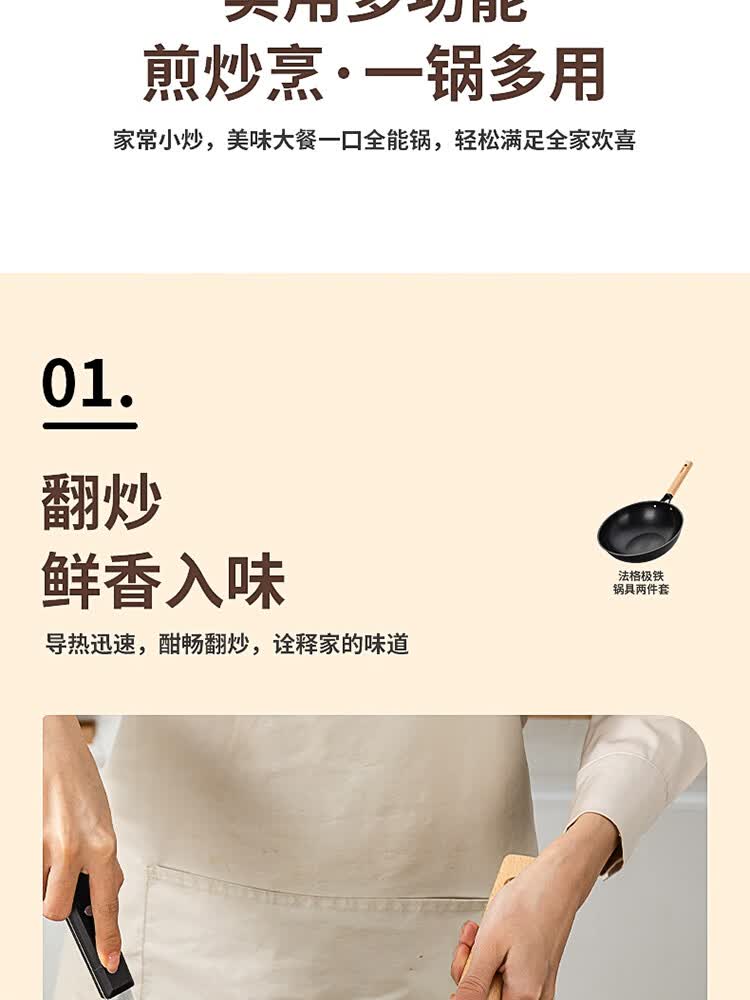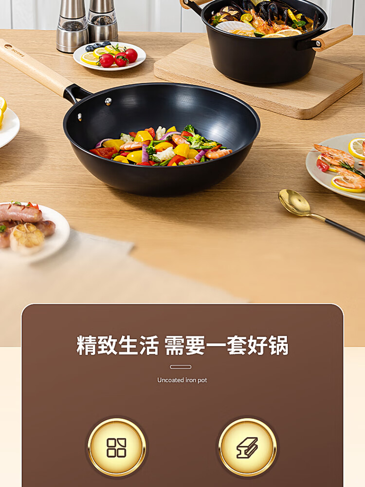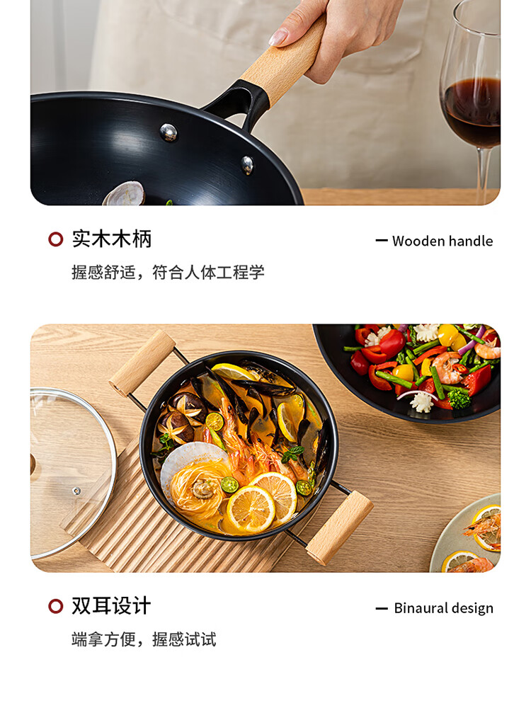 优质精铁旋压成型,造型美观锅体耐用;锅体经500度真空高温窒化,锅体表面不易生锈;实木的手柄人体工程学设计,手感舒适;经典的炒锅和汤锅组合,符合国人使用习惯
