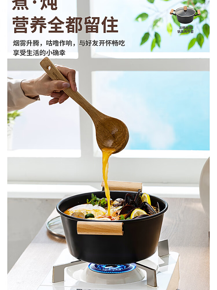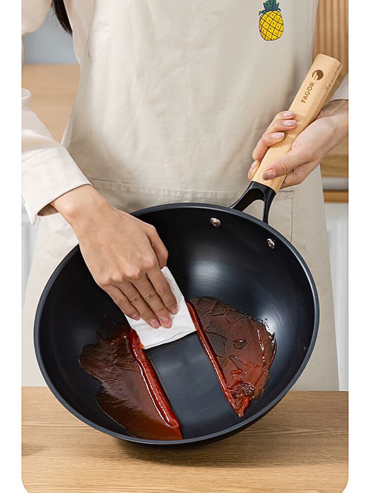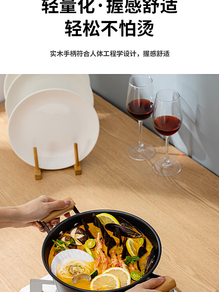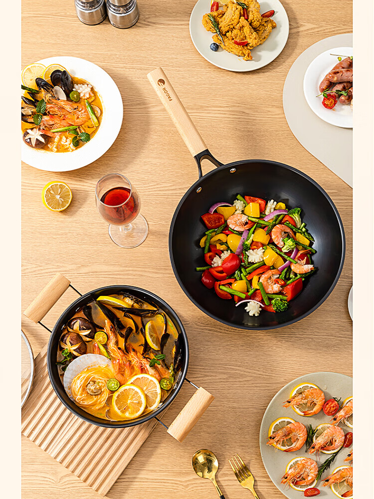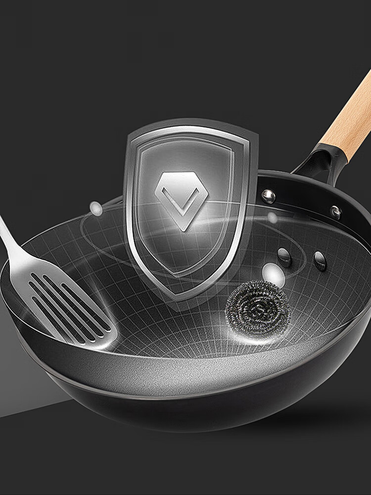 优质精铁旋压成型,造型美观锅体耐用;锅体经500度真空高温窒化,锅体表面不易生锈;实木的手柄人体工程学设计,手感舒适;经典的炒锅和汤锅组合,符合国人使用习惯