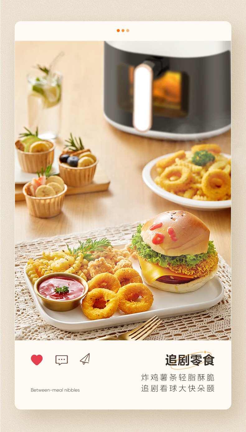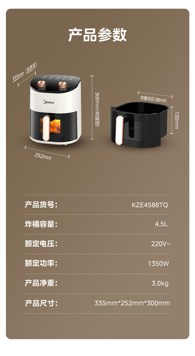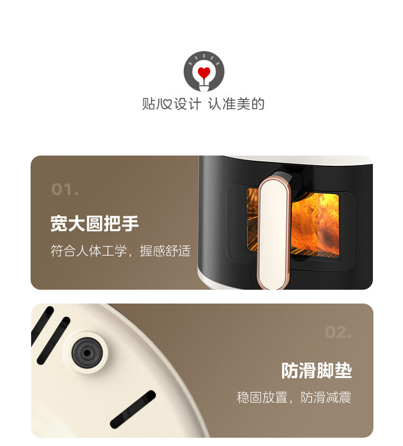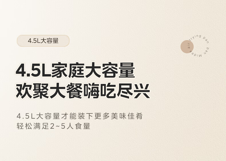 宽屏可视窗,不抽捅也能辨生熟;4.5L精巧容量,聚会美味大放送;盘桶合一,食品接触级不粘涂层,更容易清洗