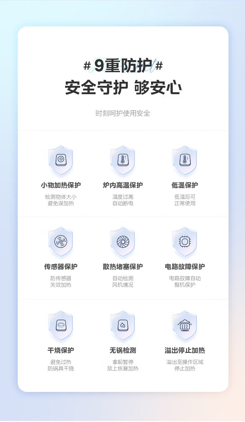 350琉晶溢彩设计,晶透浅色点亮厨房;3D悬浮大火,170mm匀火线圈盘,火更匀更稳; 时尚彩色晶透美观面板,耐高温、防刮花、耐磨损