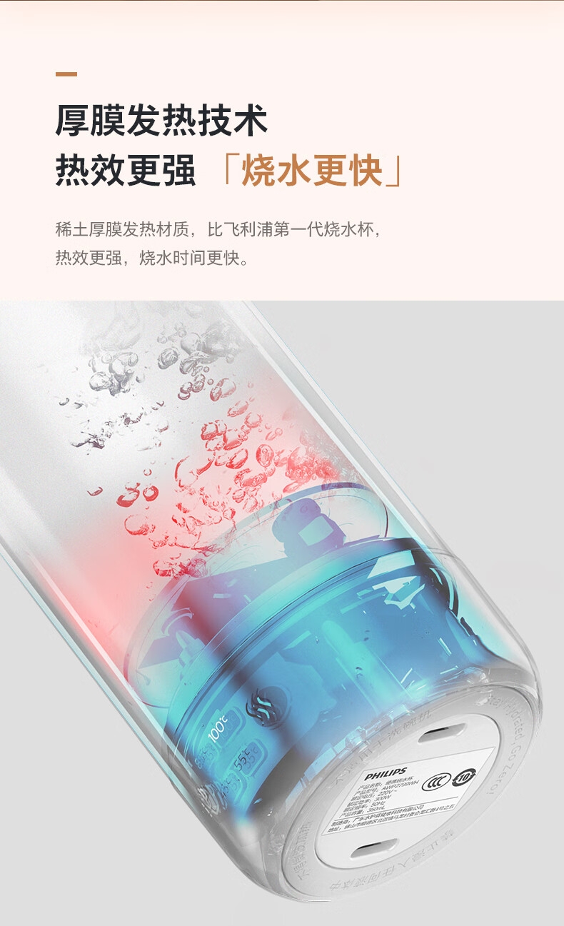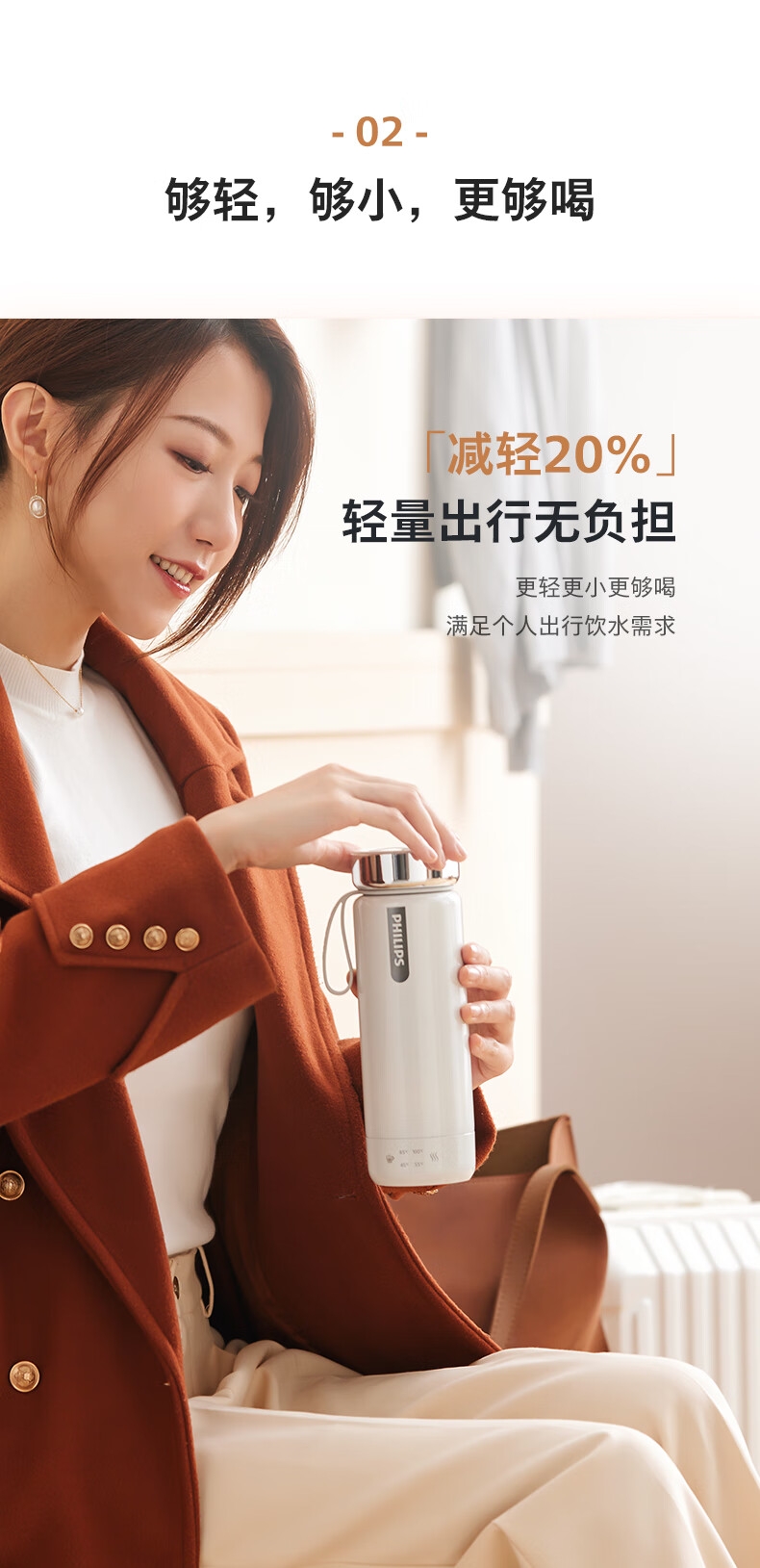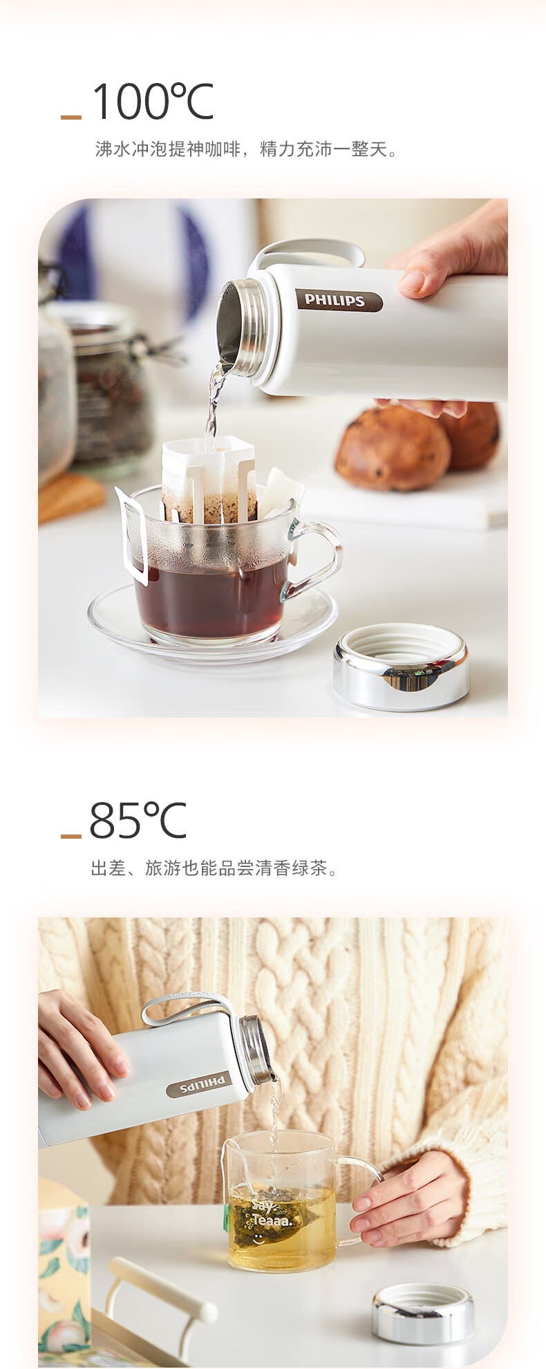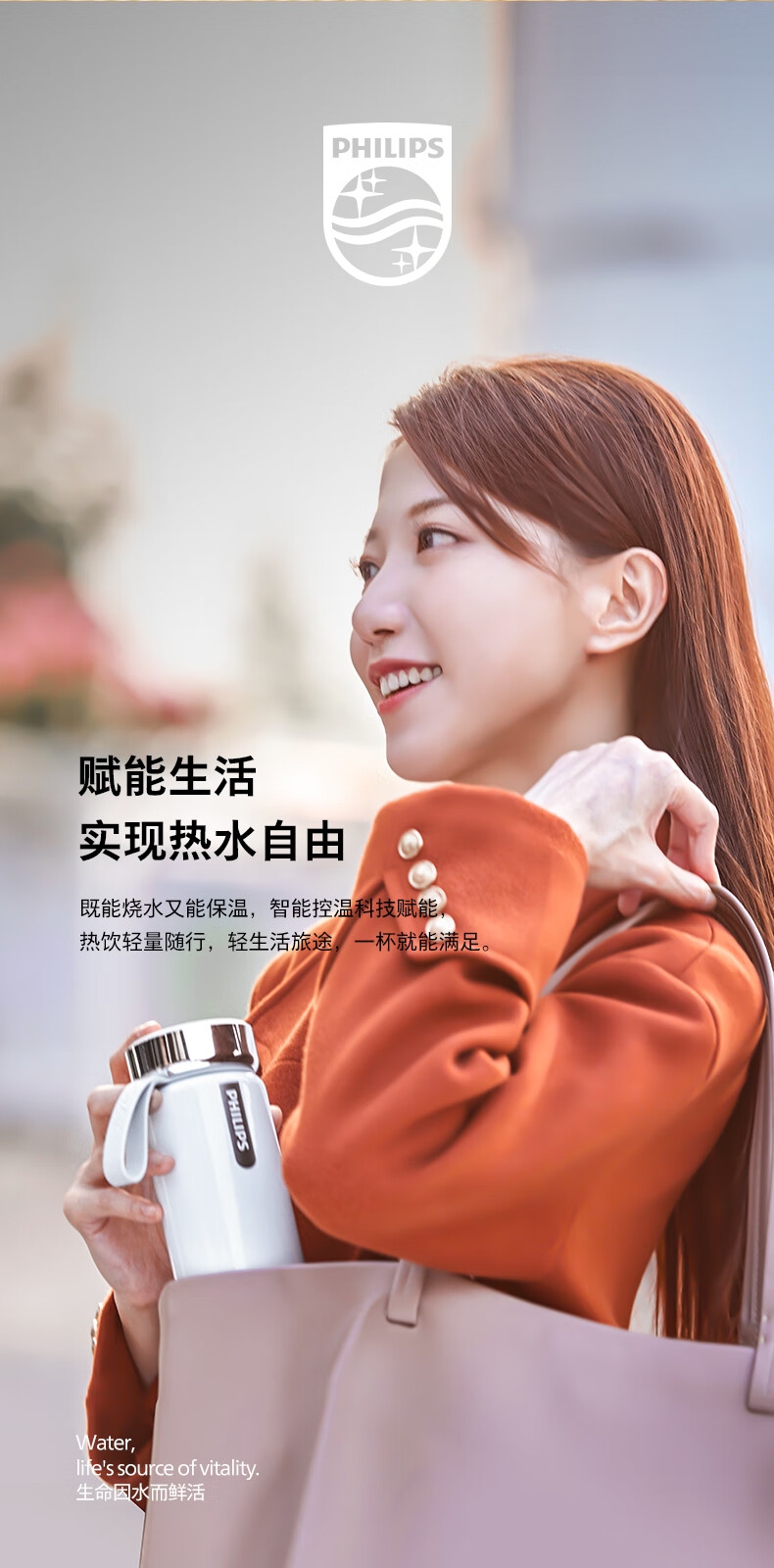 飞利浦 (PHILIPS)随行电热水杯便携迷你烧水杯316不锈钢内胆电热杯保温杯420ml黑色