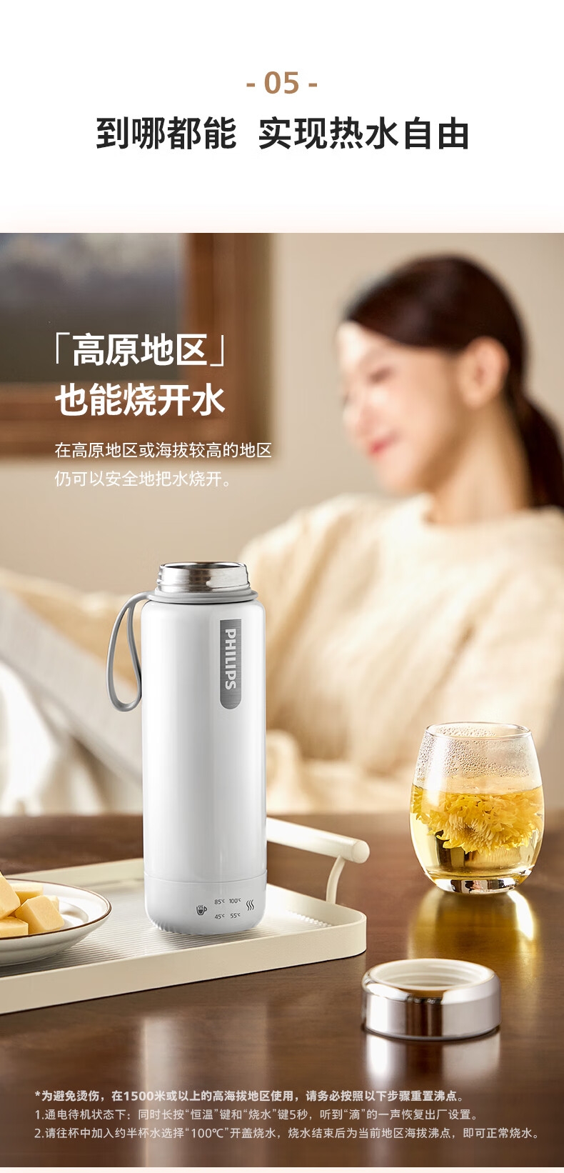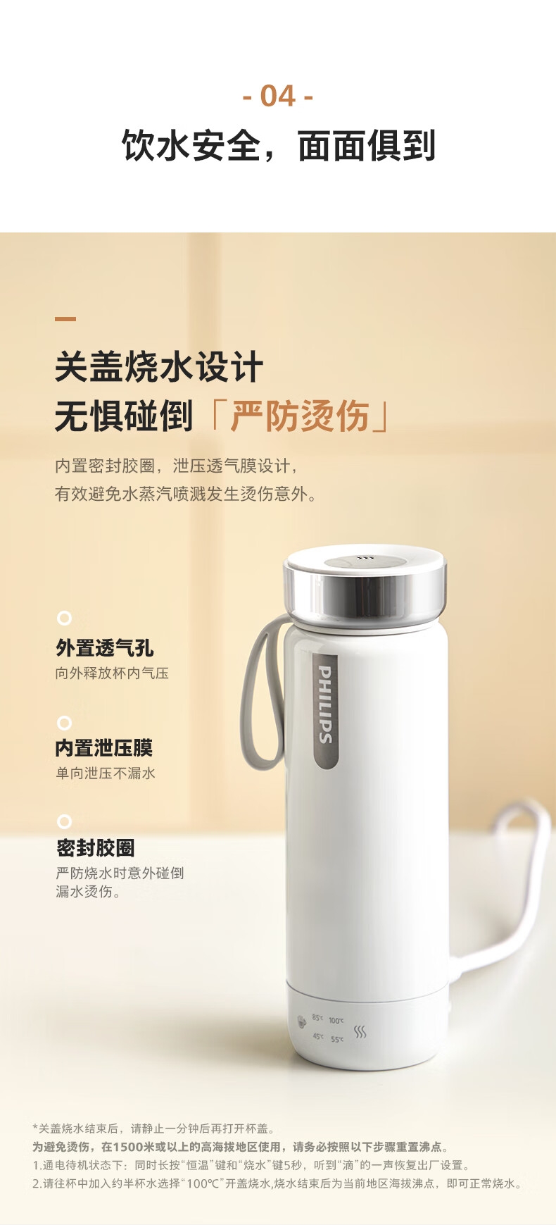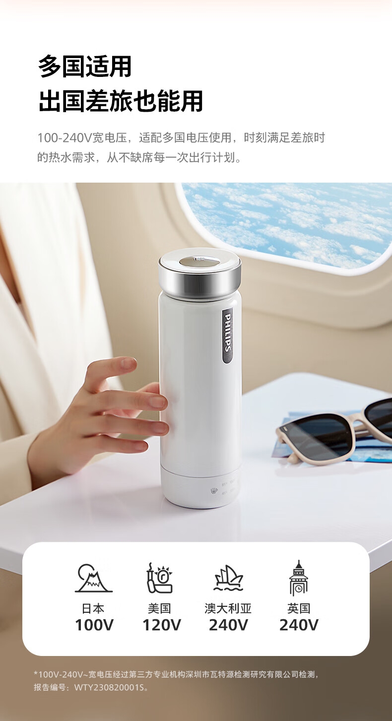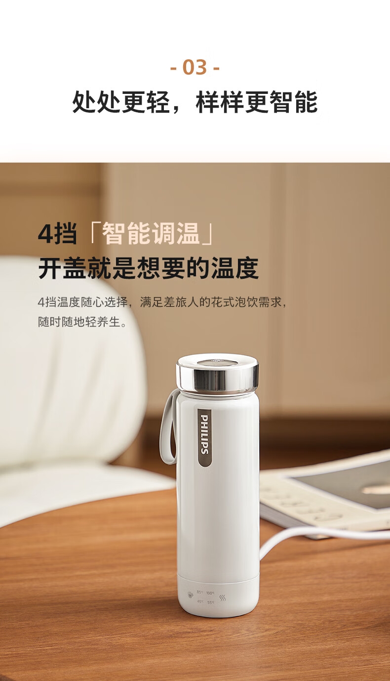 飞利浦 (PHILIPS)随行电热水杯便携迷你烧水杯316不锈钢内胆电热杯保温杯420ml黑色