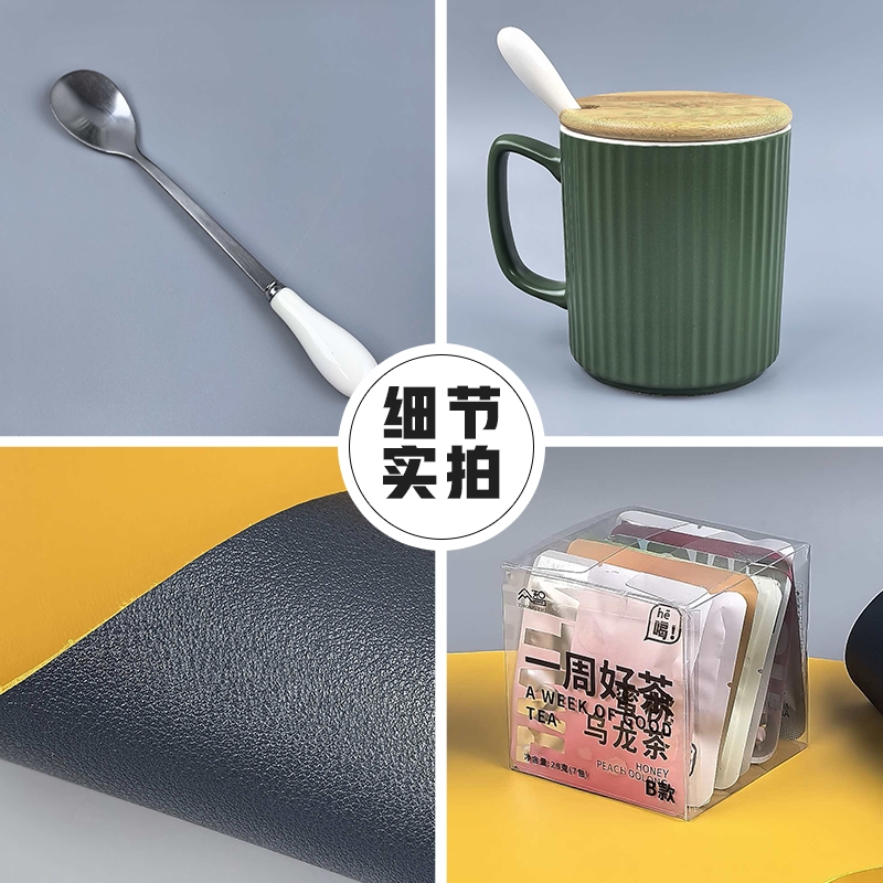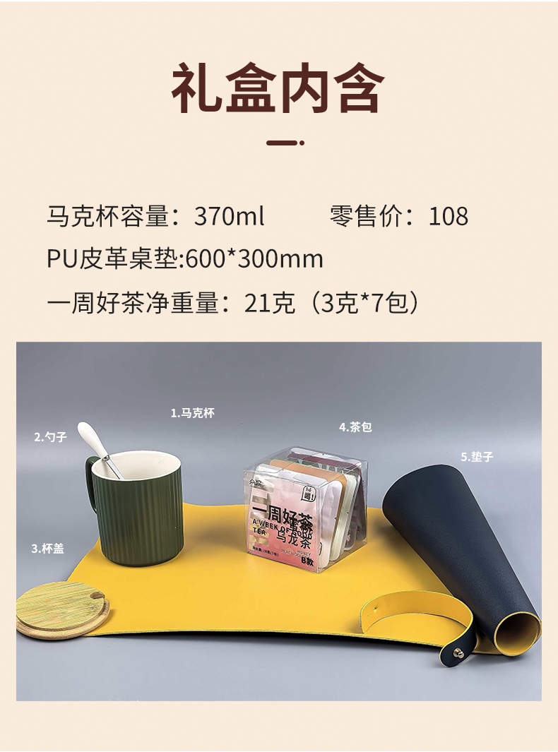 配置清单:皮革桌垫*1 陶瓷马克杯*1 养生茶*1盒 杯盖*1 搅拌勺*1