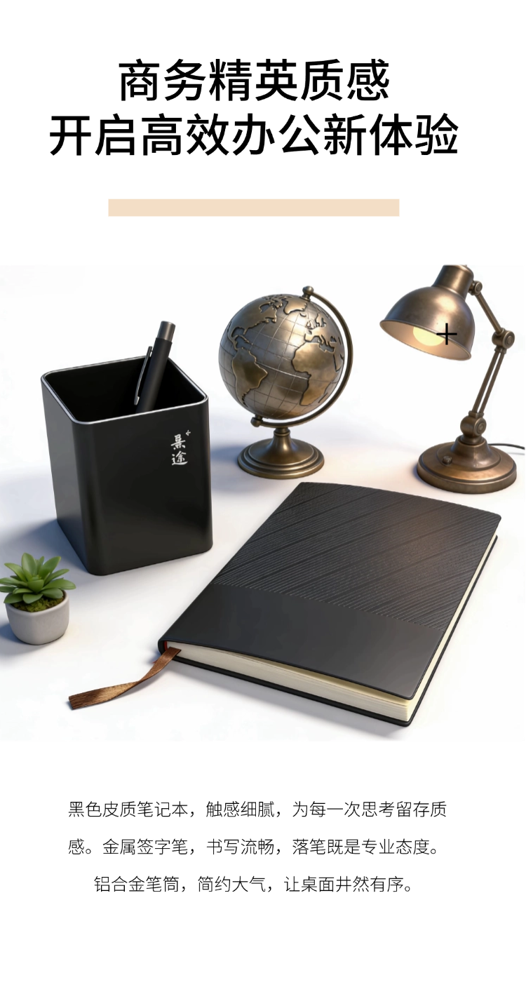 这款铝合金套装妙!笔记本便携,笔精致,提升办公格调;办公优选套装!铝合金笔记本质感佳,笔流畅书写不停!;铝合金套装超赞!笔记本耐用,笔书写顺滑,办公利器!