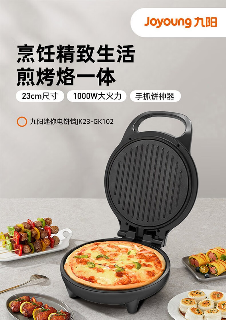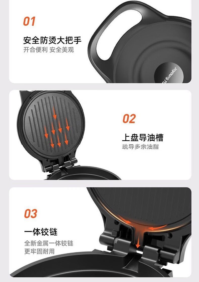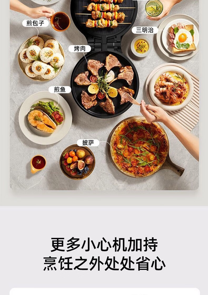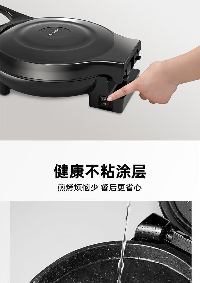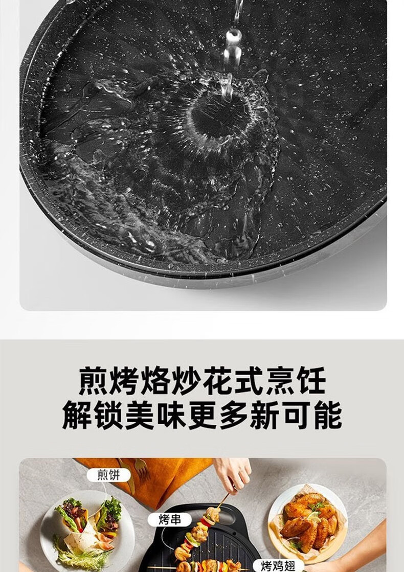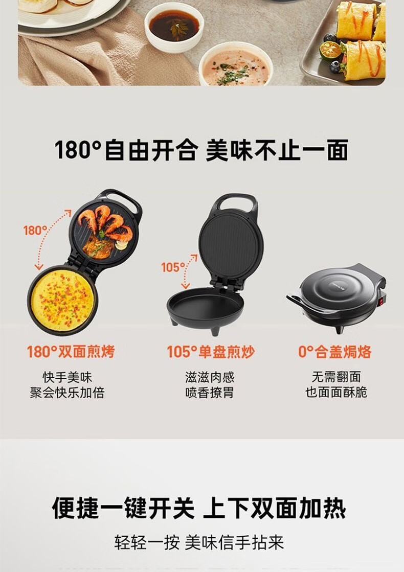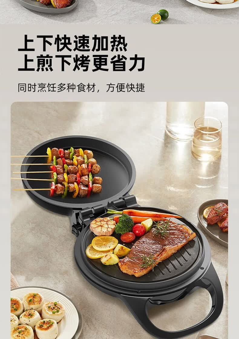 上下双盘,双面加热;聚能烤盘,均匀发热;180度伸展,双面煎烤;无烟不粘锅,耐刮耐磨耐酸碱,易清洁,污渍不残留;煎饼、鸡翅、花生米、烧烤均可