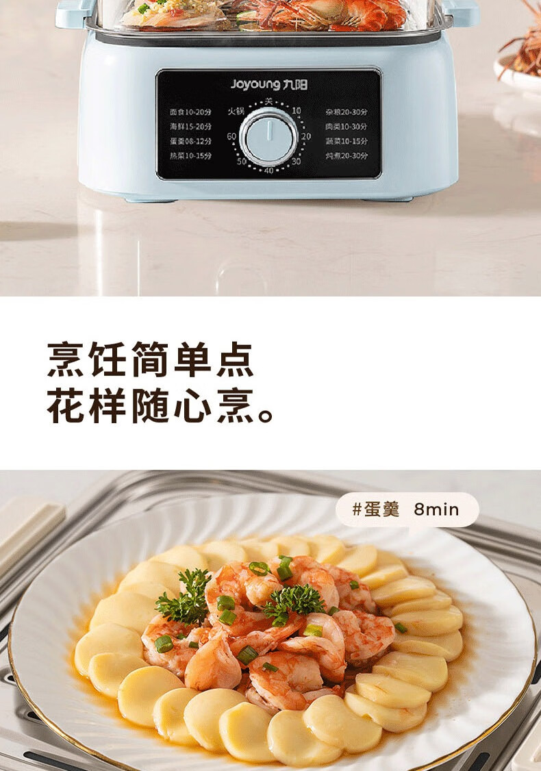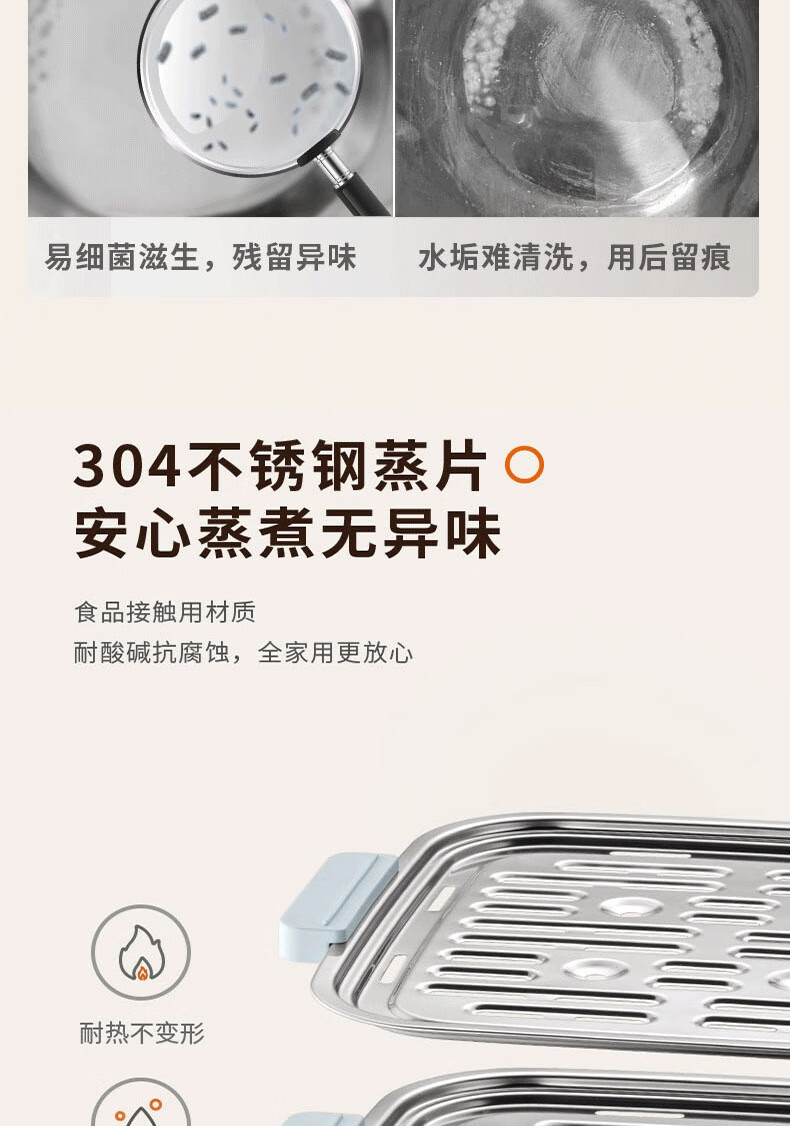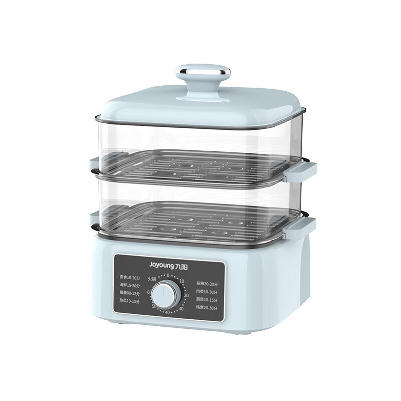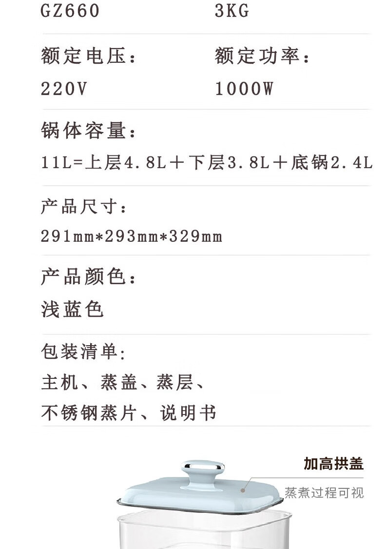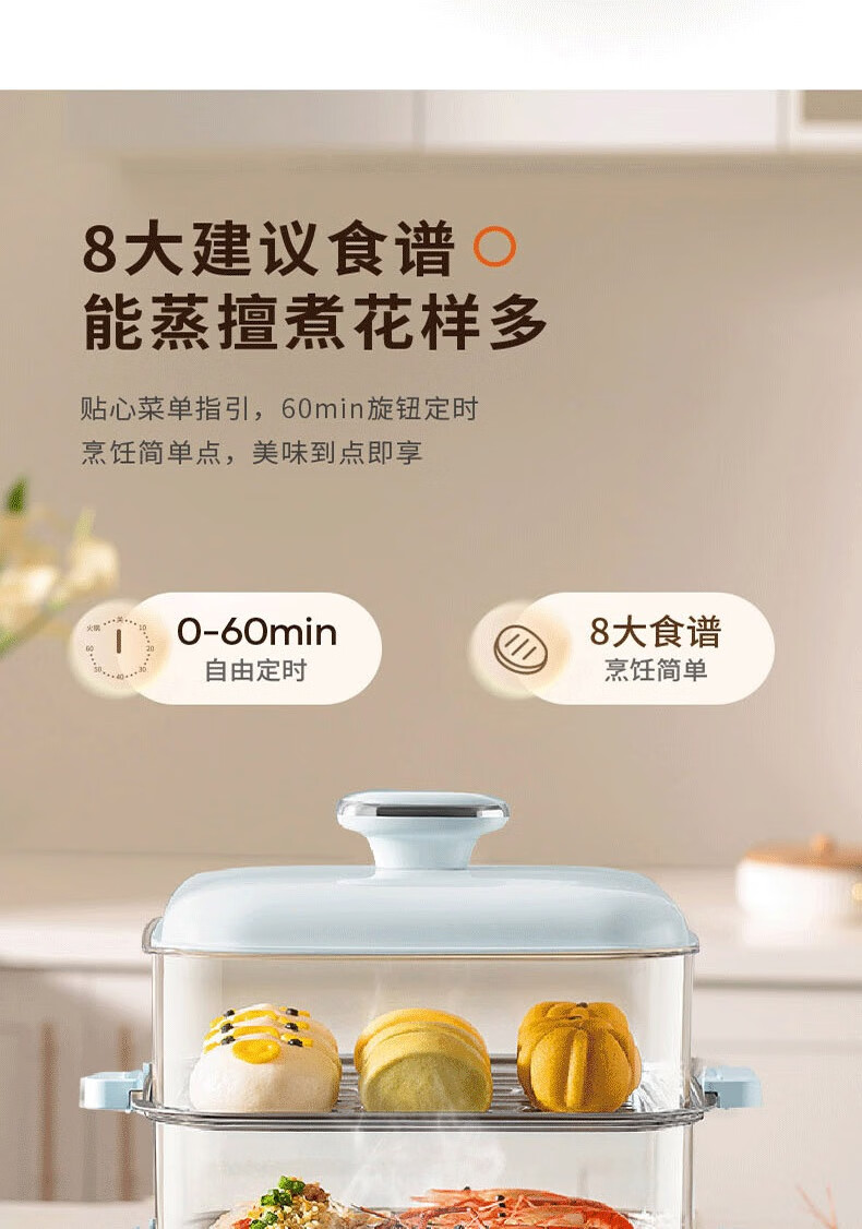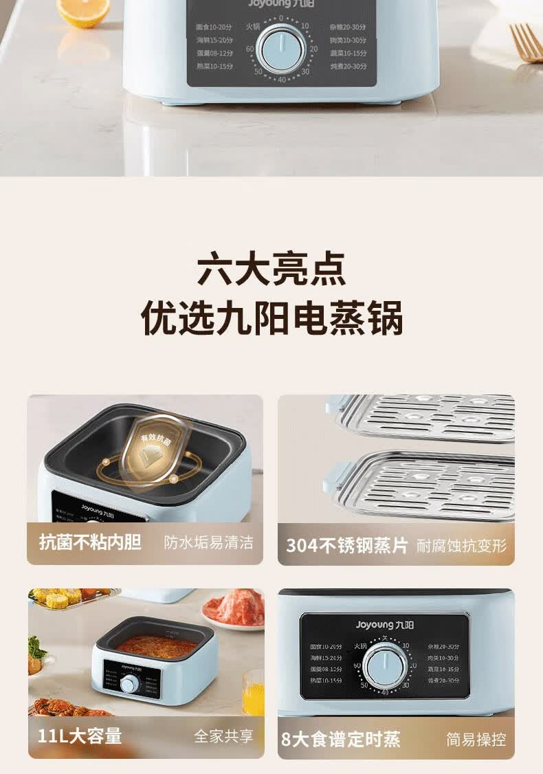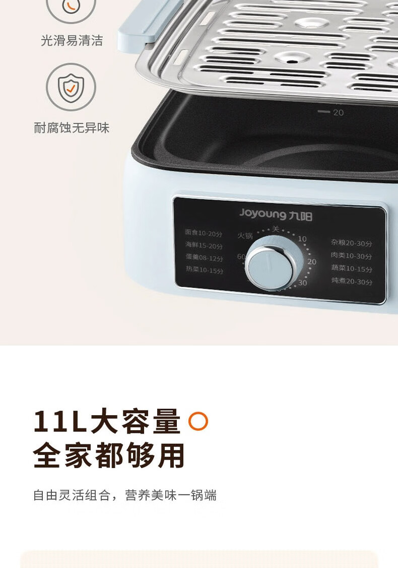 上蒸下煮,一机多能;;不锈钢蒸盘,安心材质;;定时旋钮,解放双手;;11L双层大容量,实用多能;;升级不粘涂层,涮煮不粘。