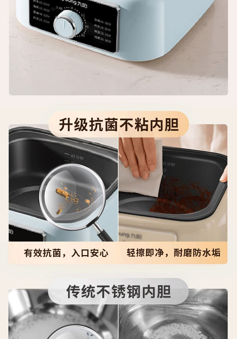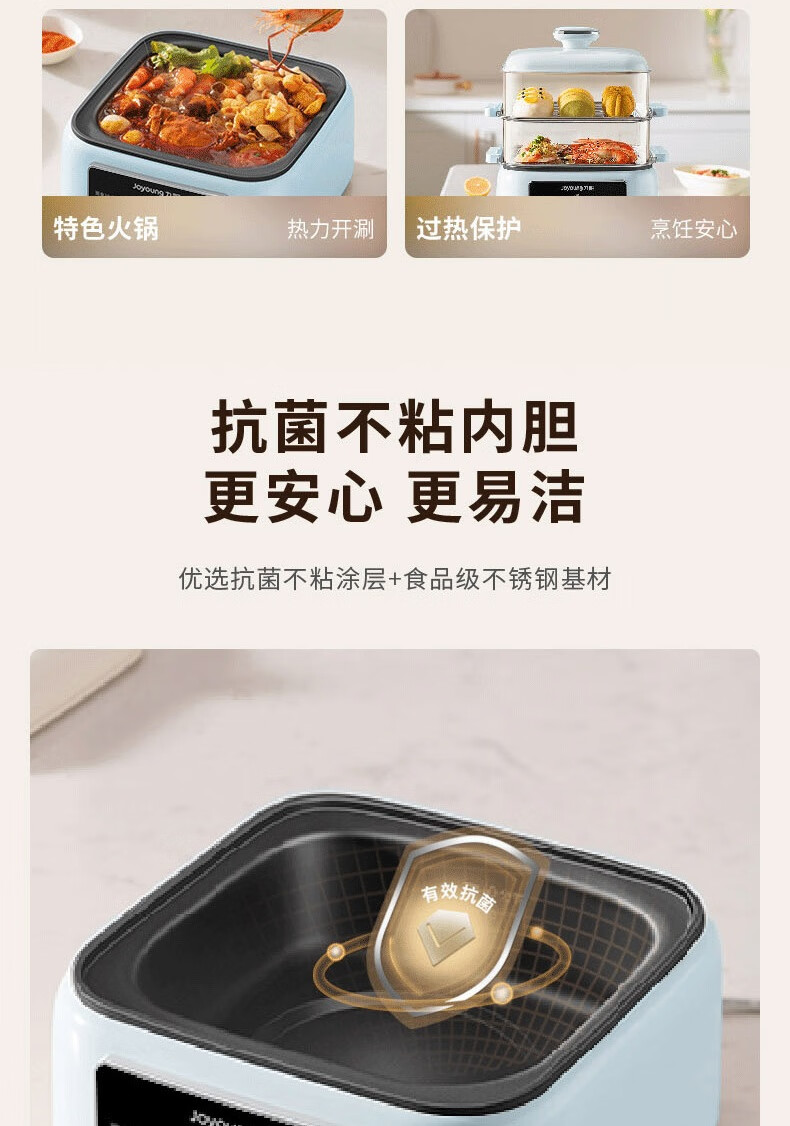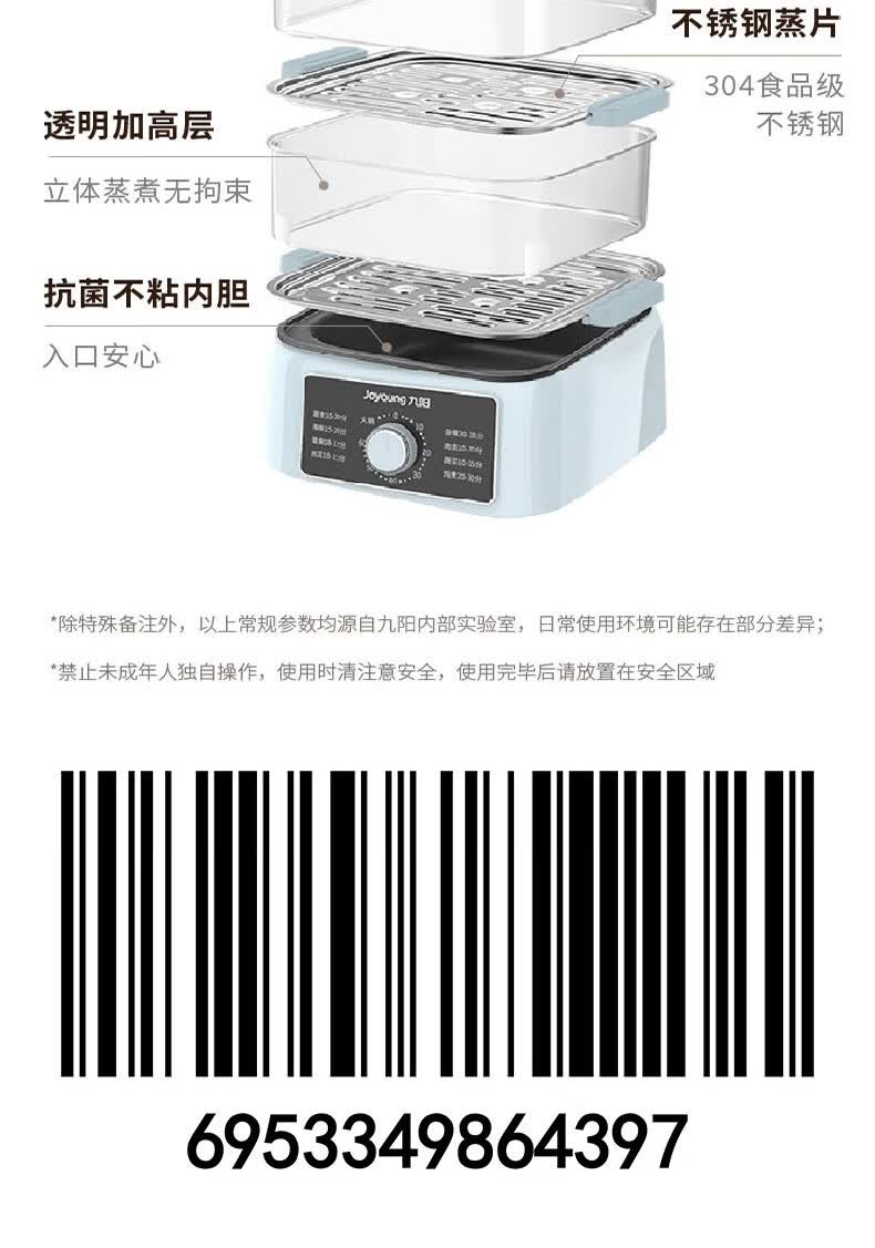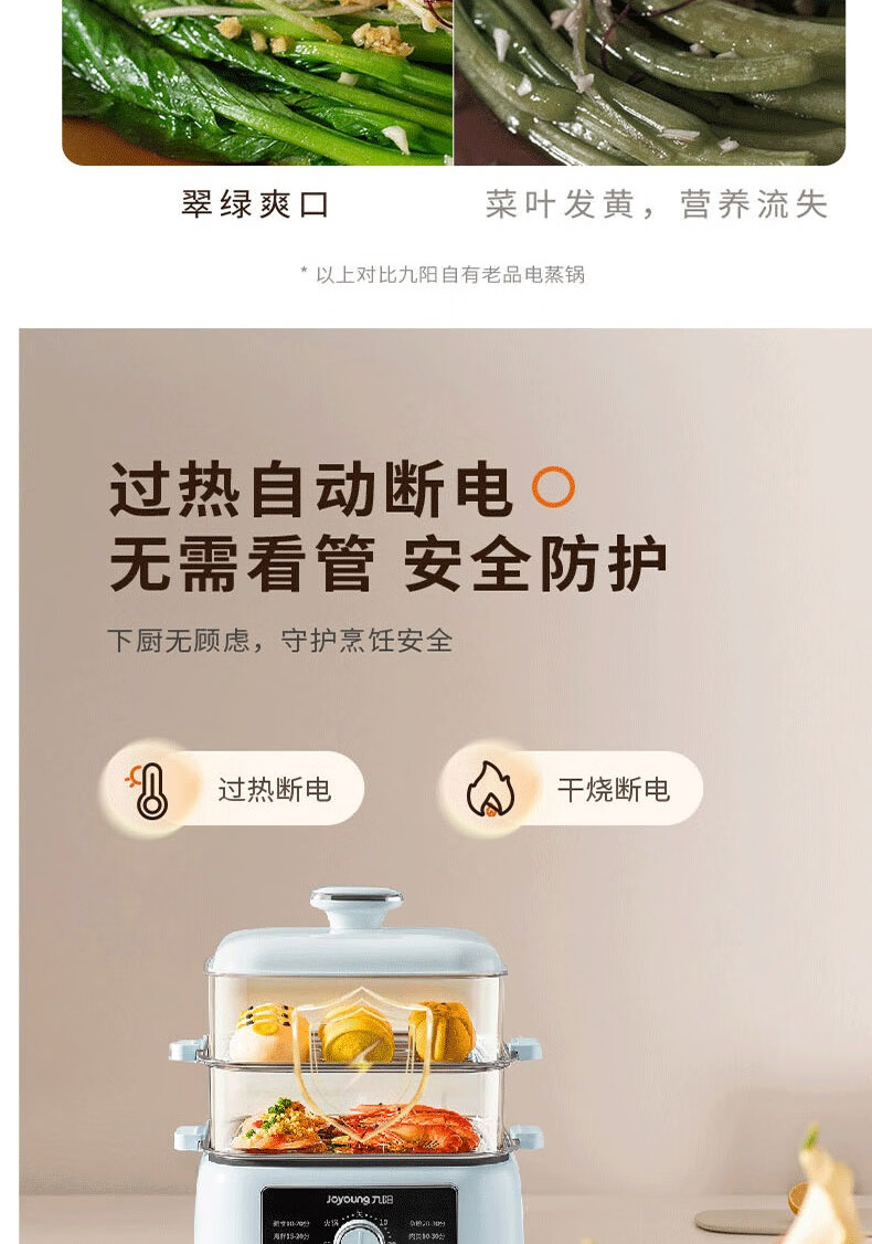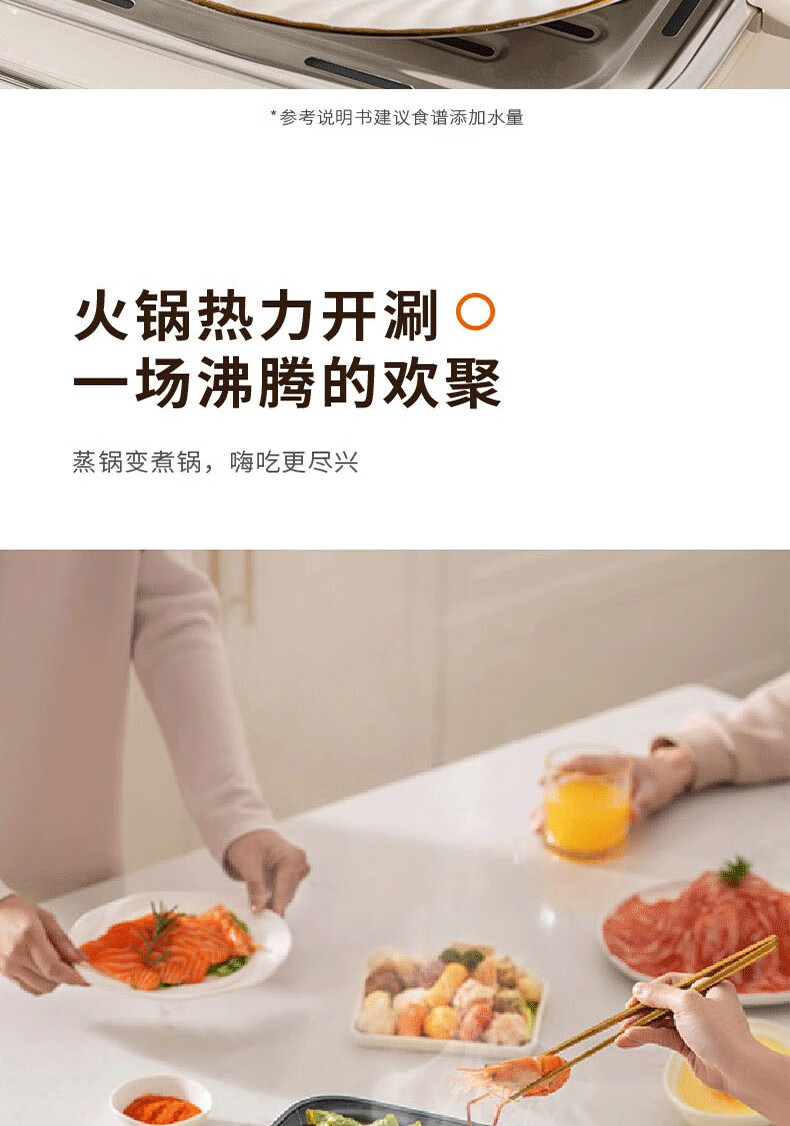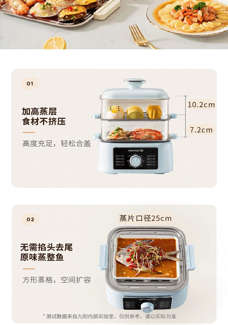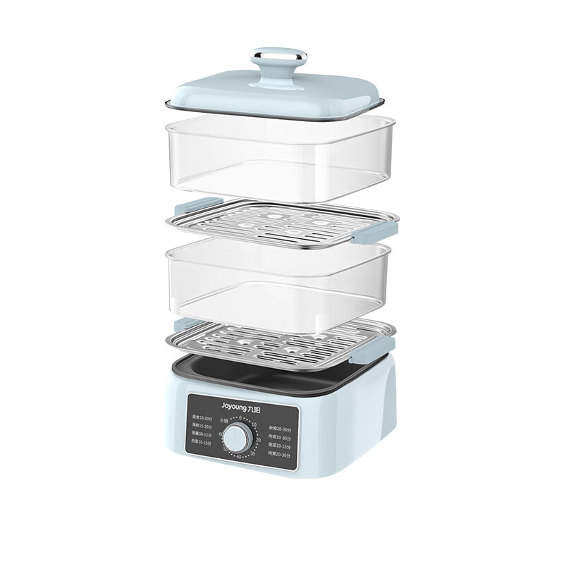 上蒸下煮,一机多能;;不锈钢蒸盘,安心材质;;定时旋钮,解放双手;;11L双层大容量,实用多能;;升级不粘涂层,涮煮不粘。