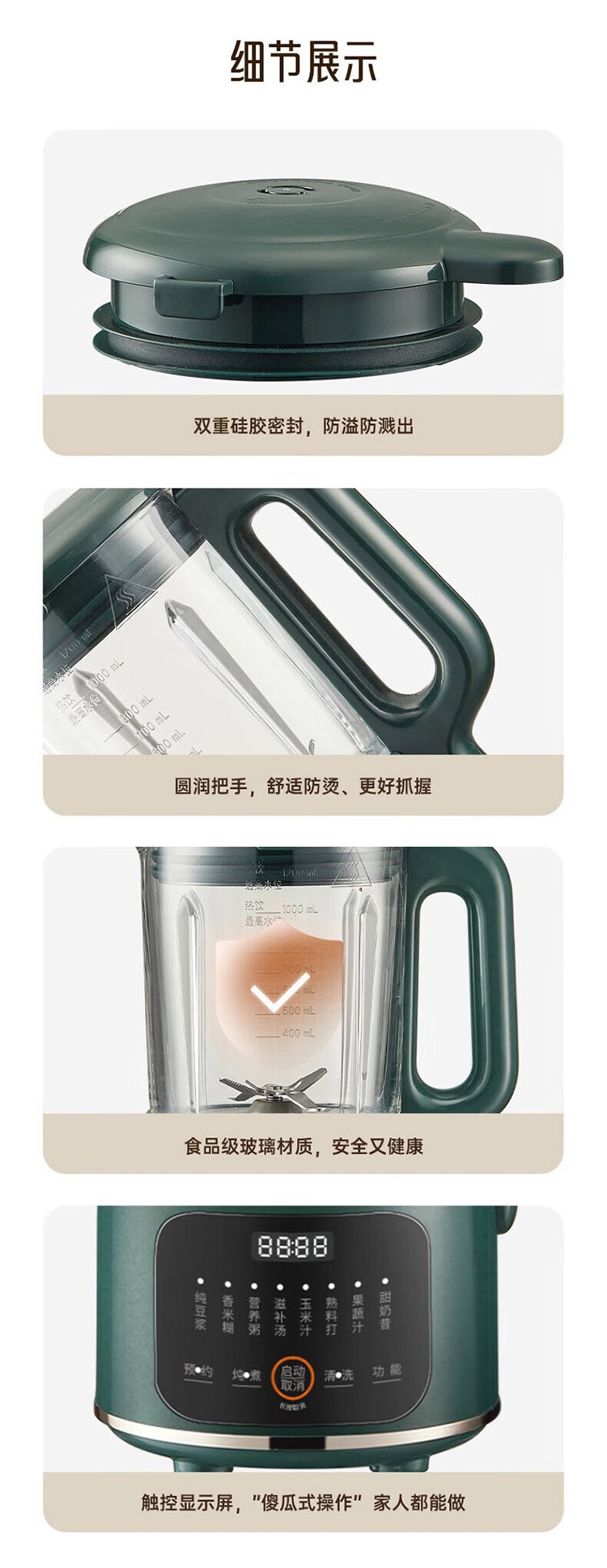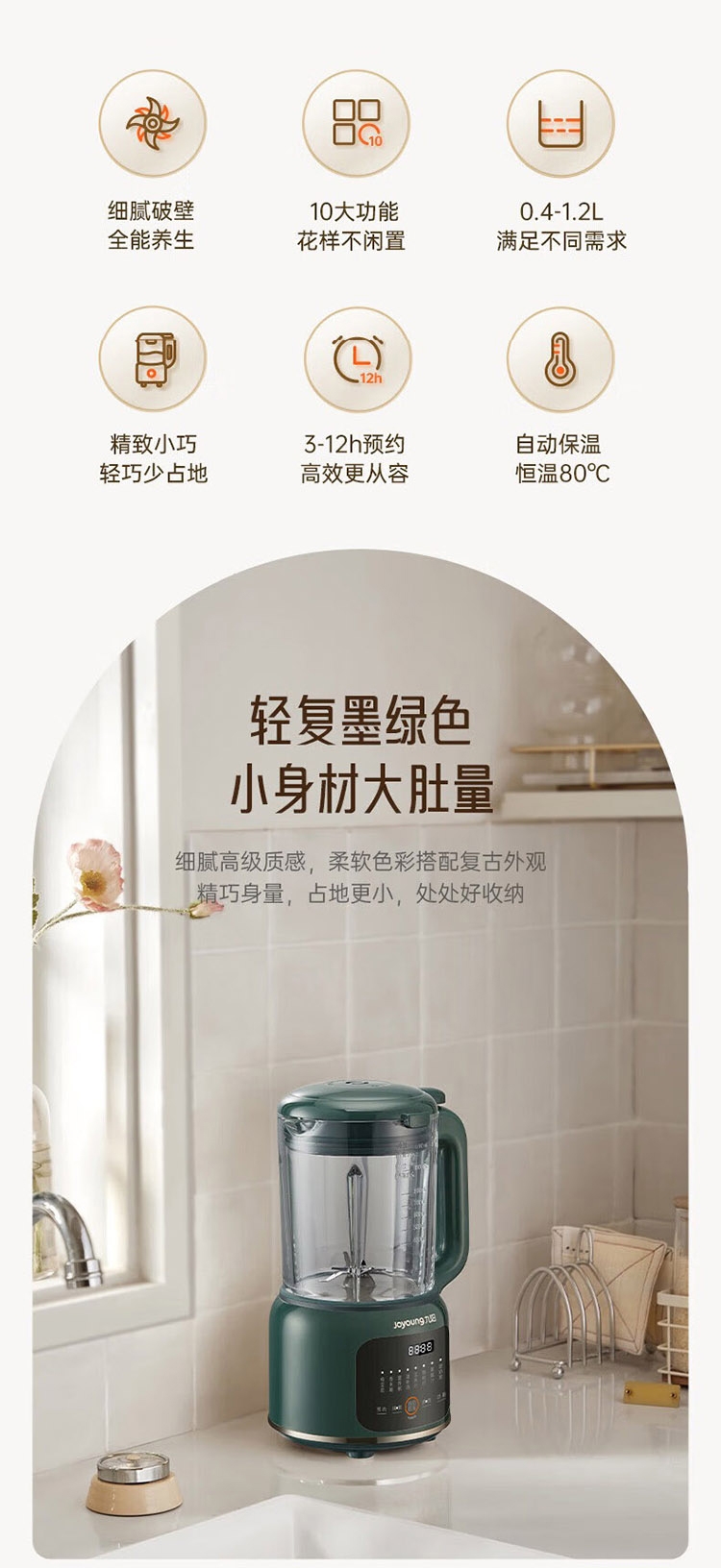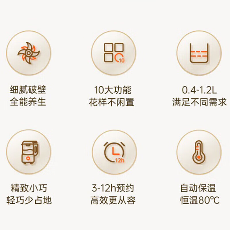 细腻破壁全能养生;10大功能花样不闲置;0.4-1.2L满足不同需求;精致小巧轻巧少占地;3-12h预约高效更从容