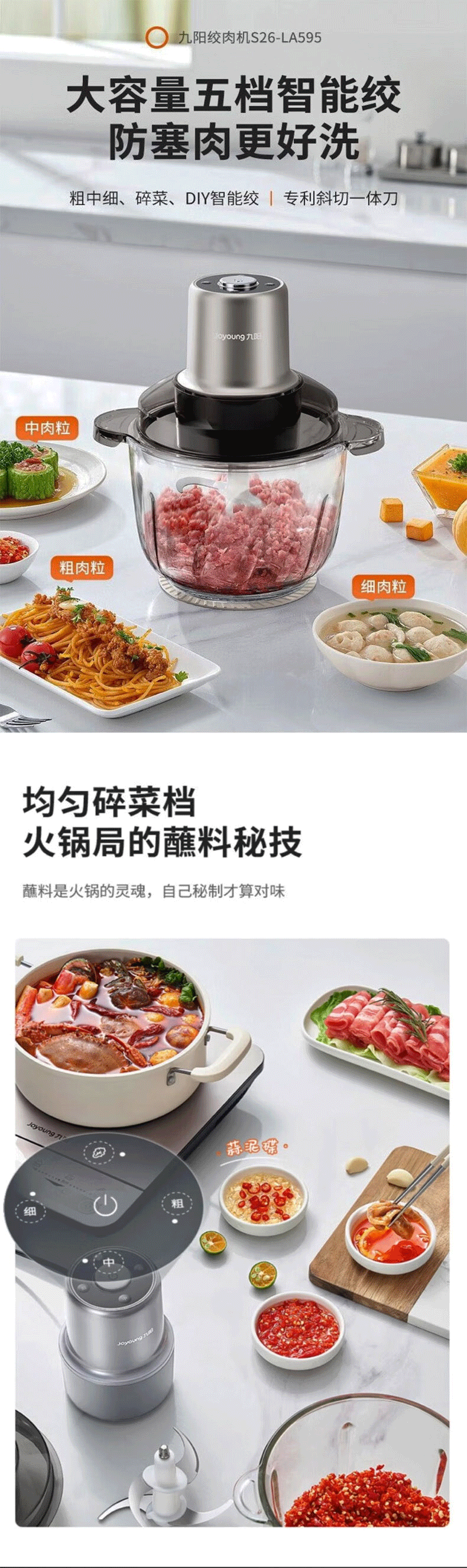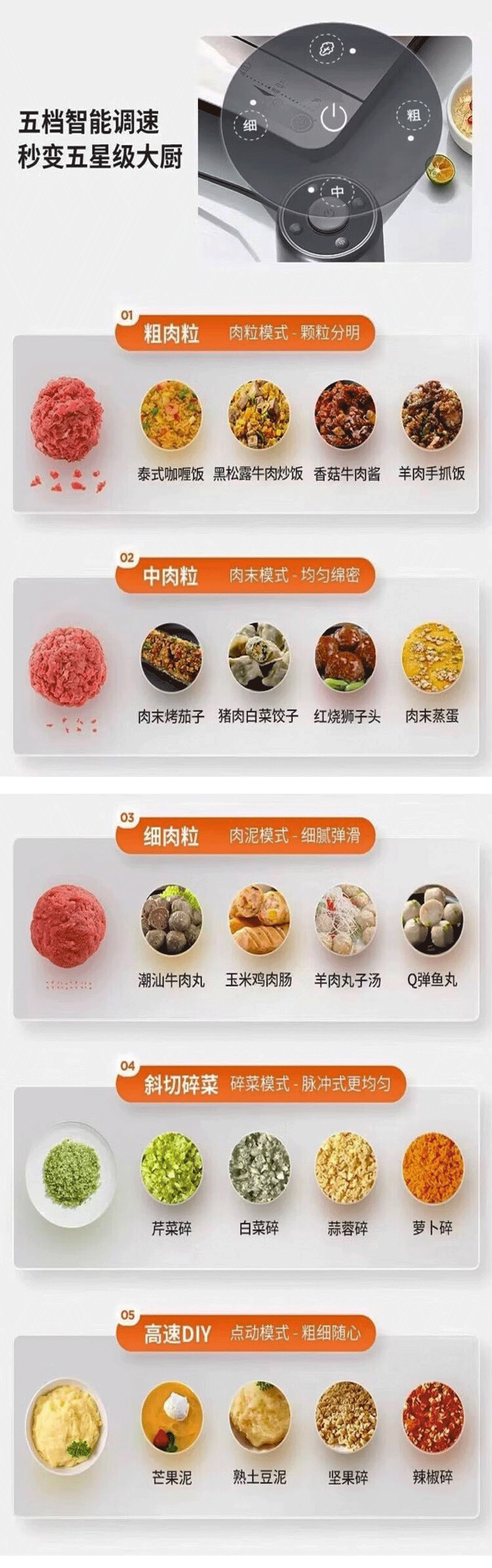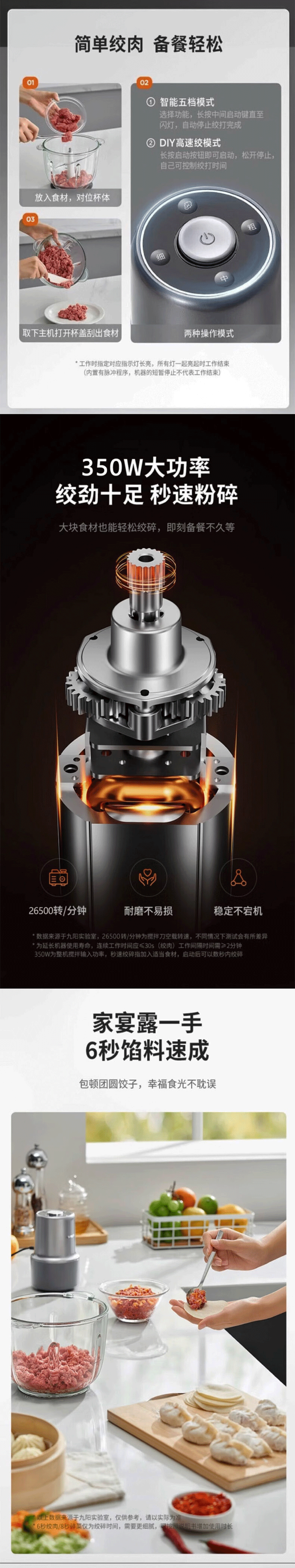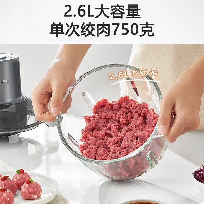 五档智能绞,专利斜切技术;2.6L大容量,一次切割900g;防塞肉短轴刀,切碎更细腻简便;食品级材质,安全健康易清洁;肉馅、菜馅、果泥只需一按