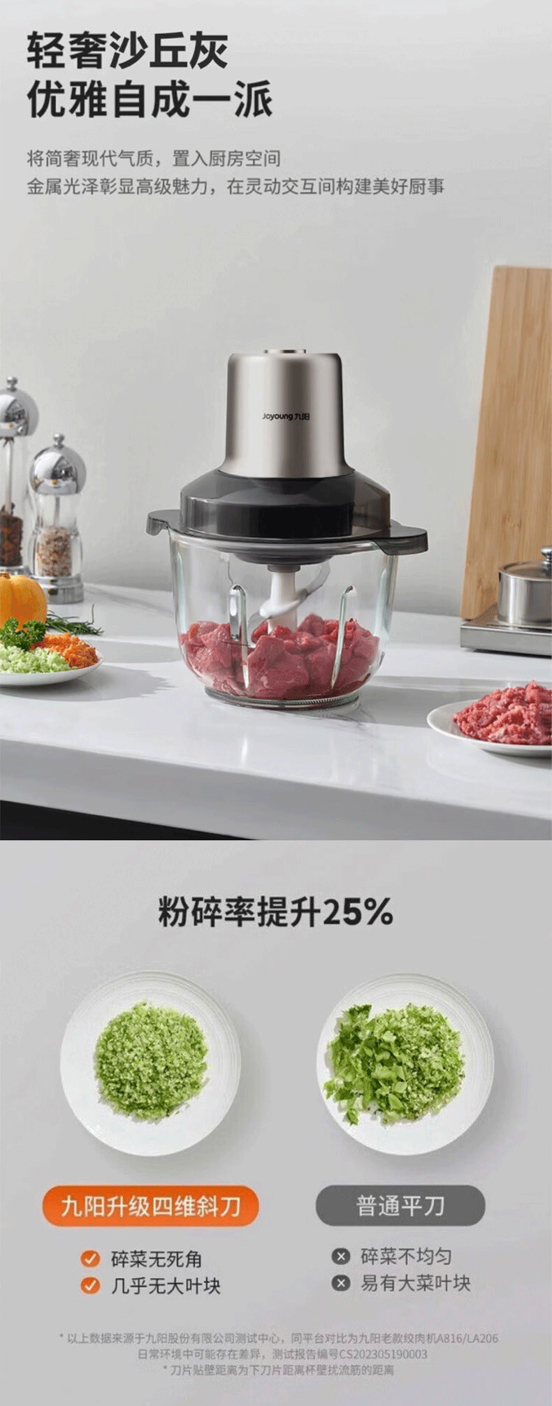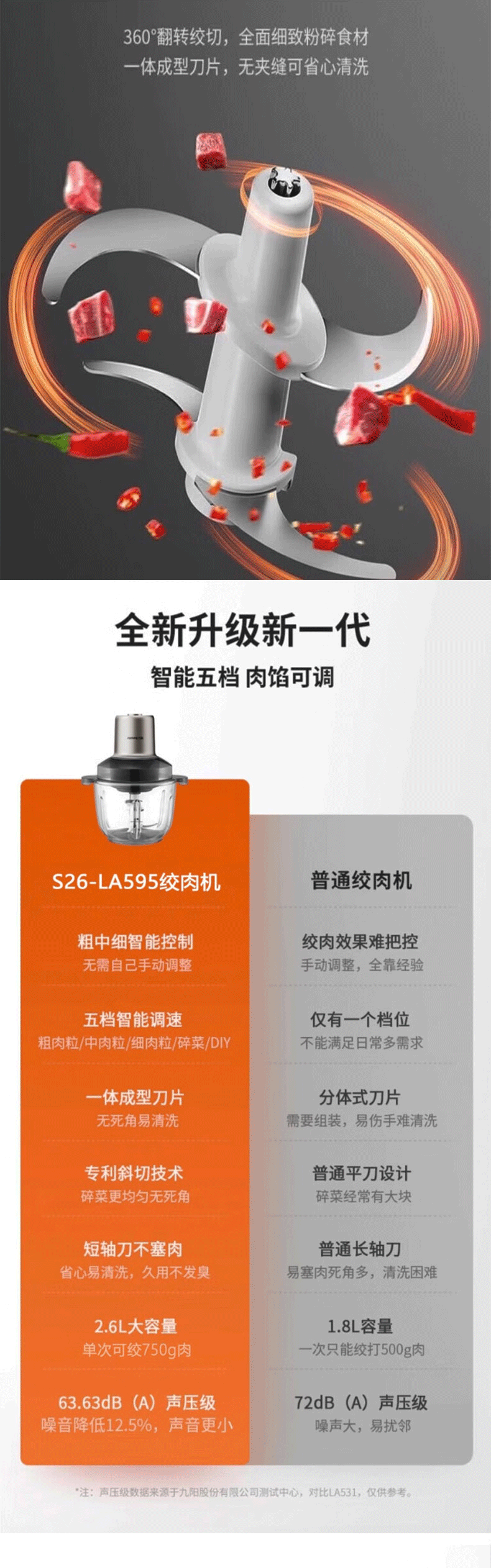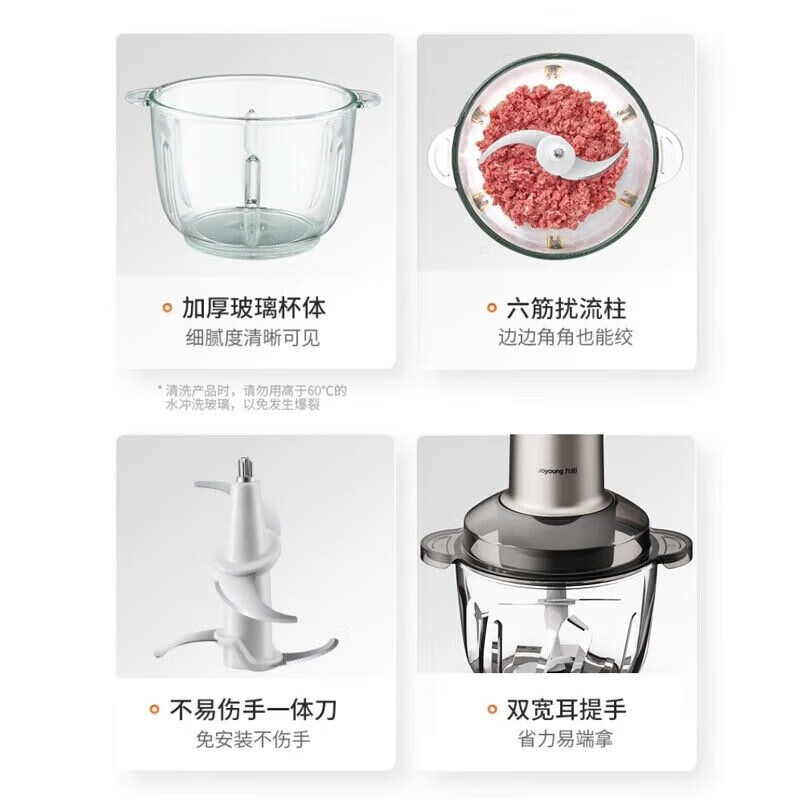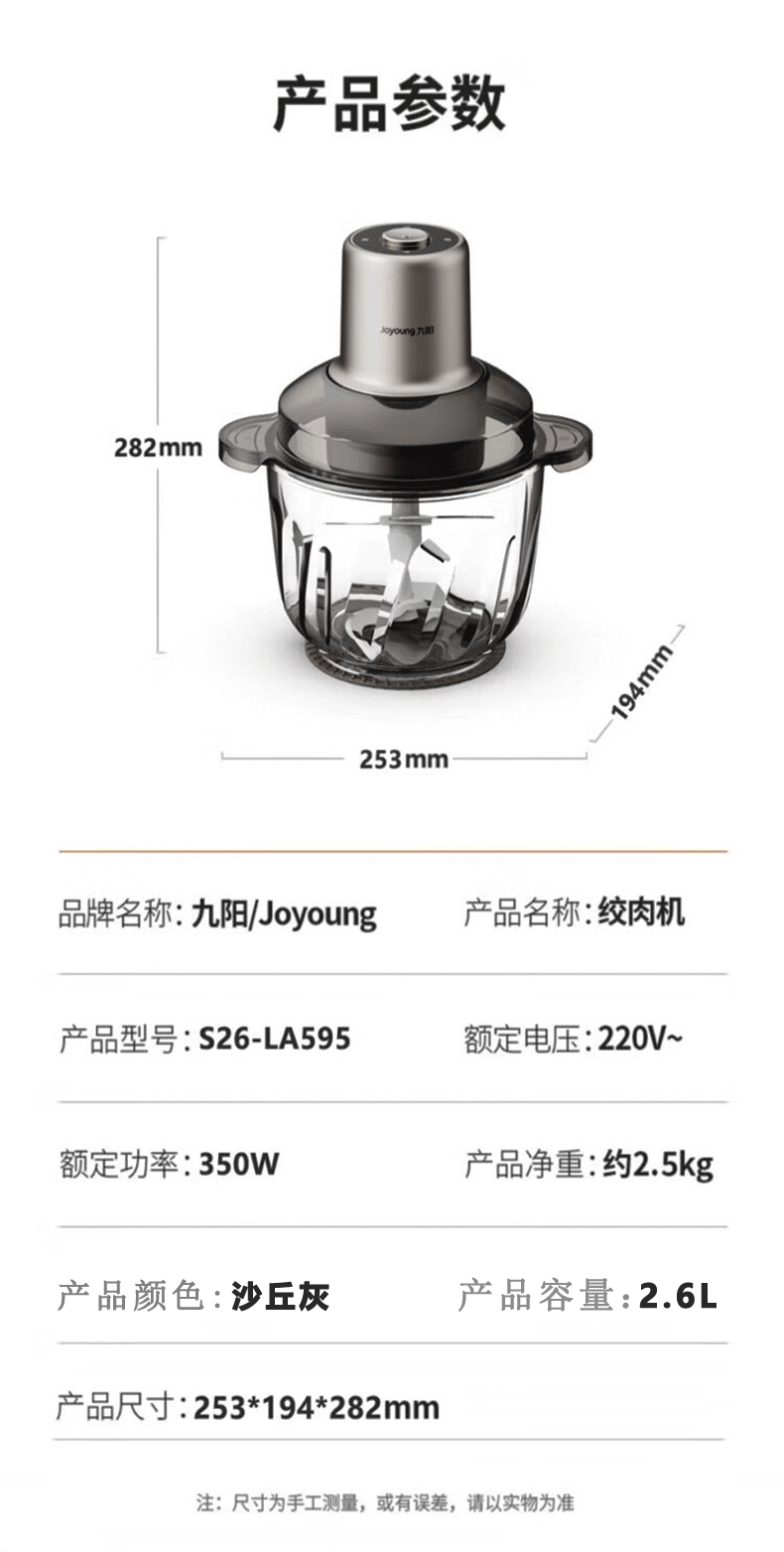 五档智能绞,专利斜切技术;2.6L大容量,一次切割900g;防塞肉短轴刀,切碎更细腻简便;食品级材质,安全健康易清洁;肉馅、菜馅、果泥只需一按