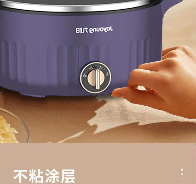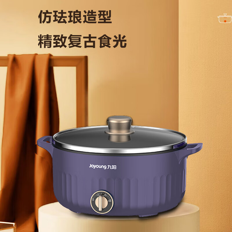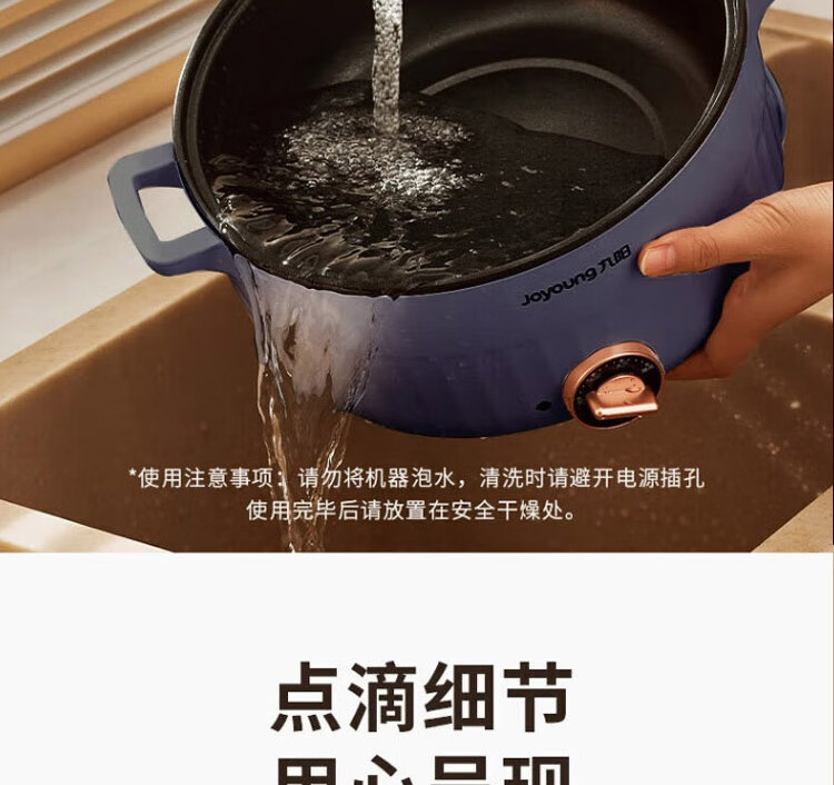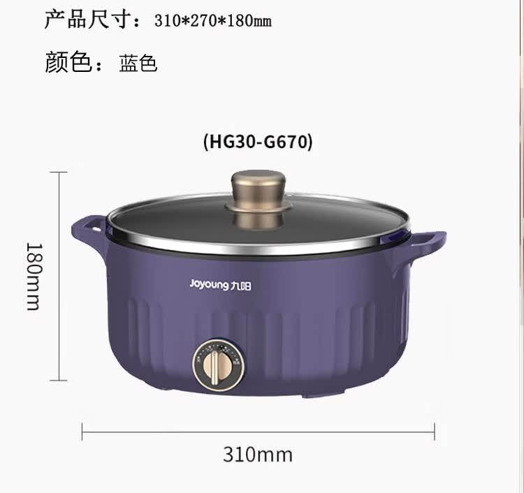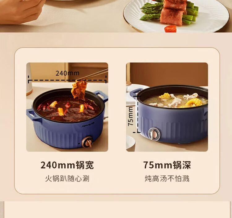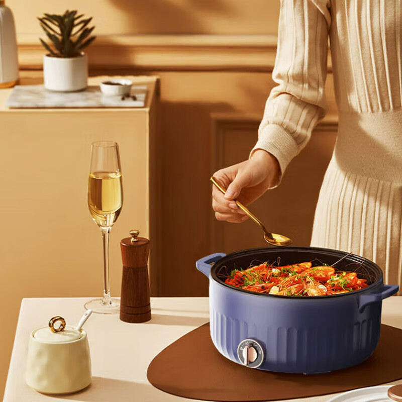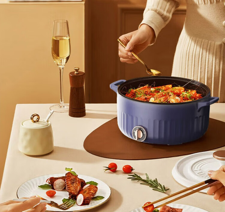 多功能:焖、煮、煎、炖、炒;;高颜值、复古蓝;;旋钮调温;;不粘易清洗。