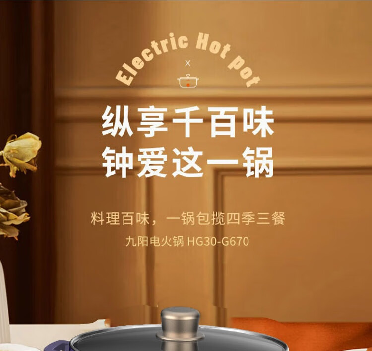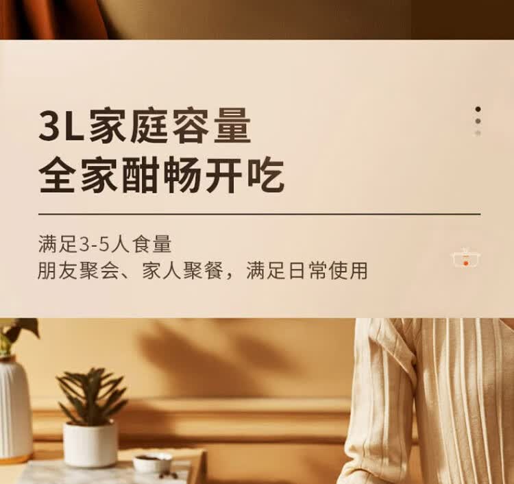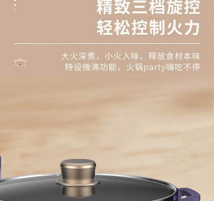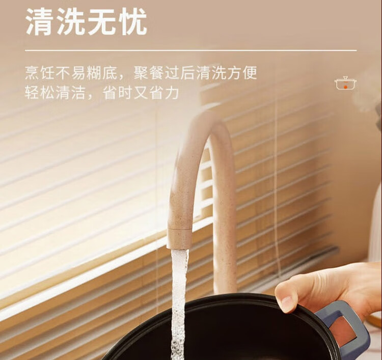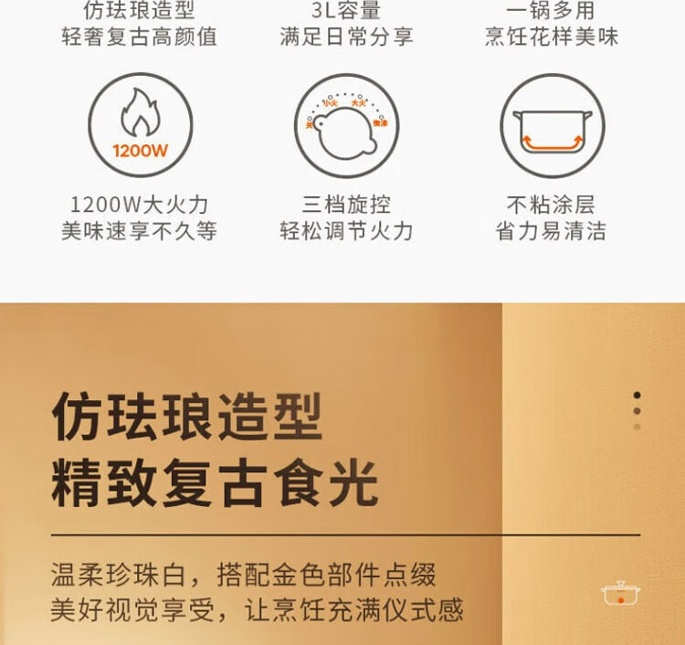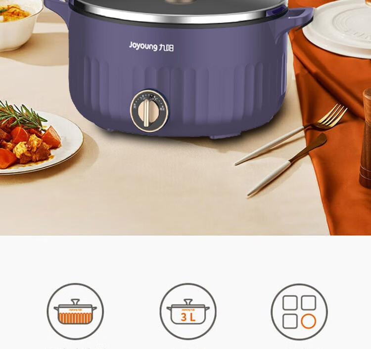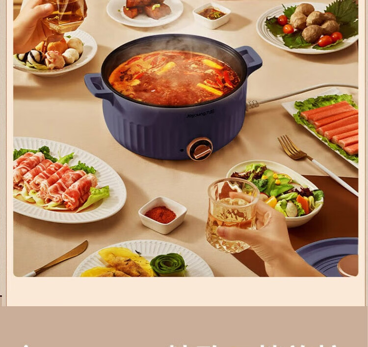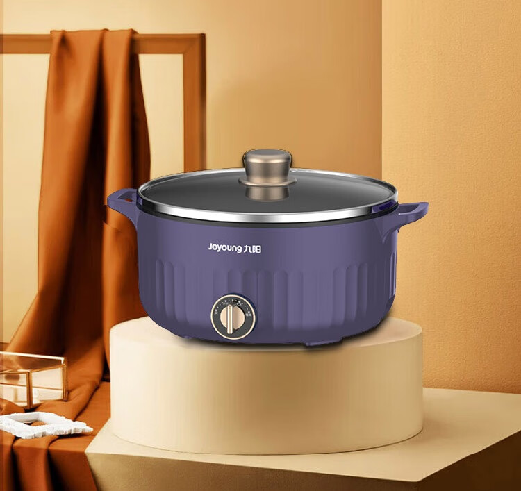 多功能:焖、煮、煎、炖、炒;;高颜值、复古蓝;;旋钮调温;;不粘易清洗。