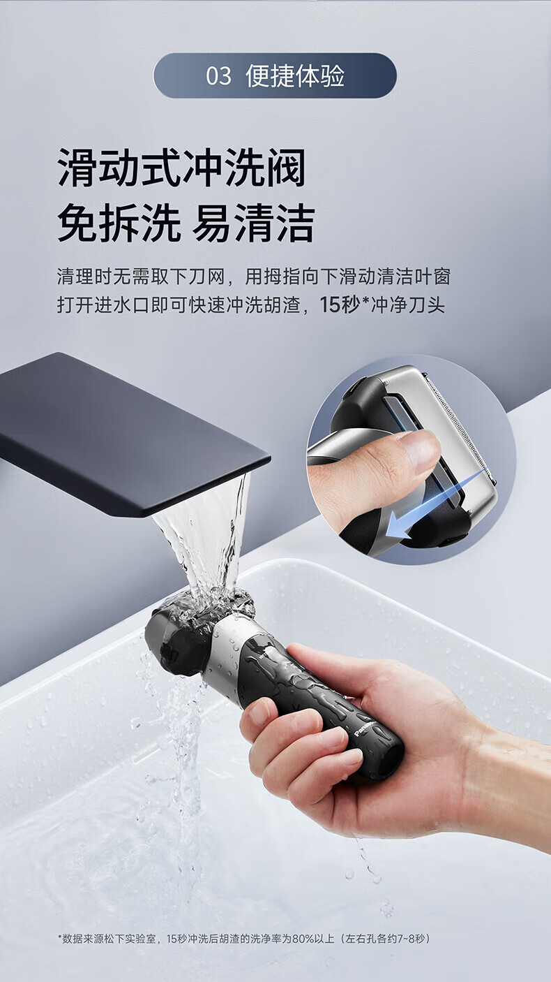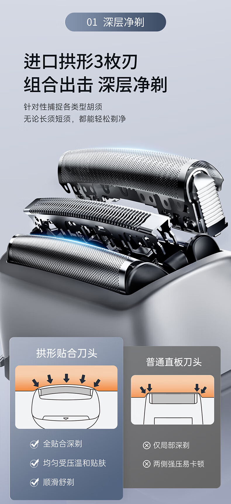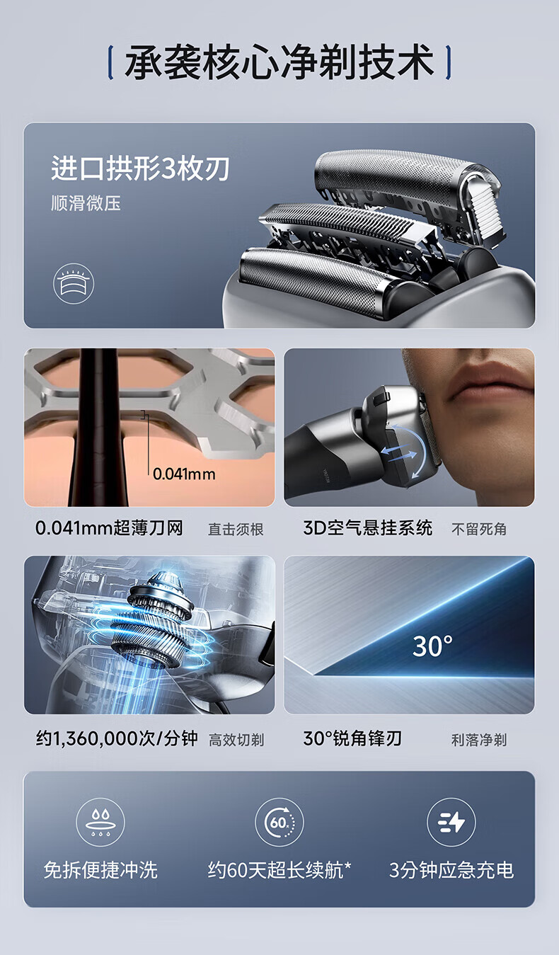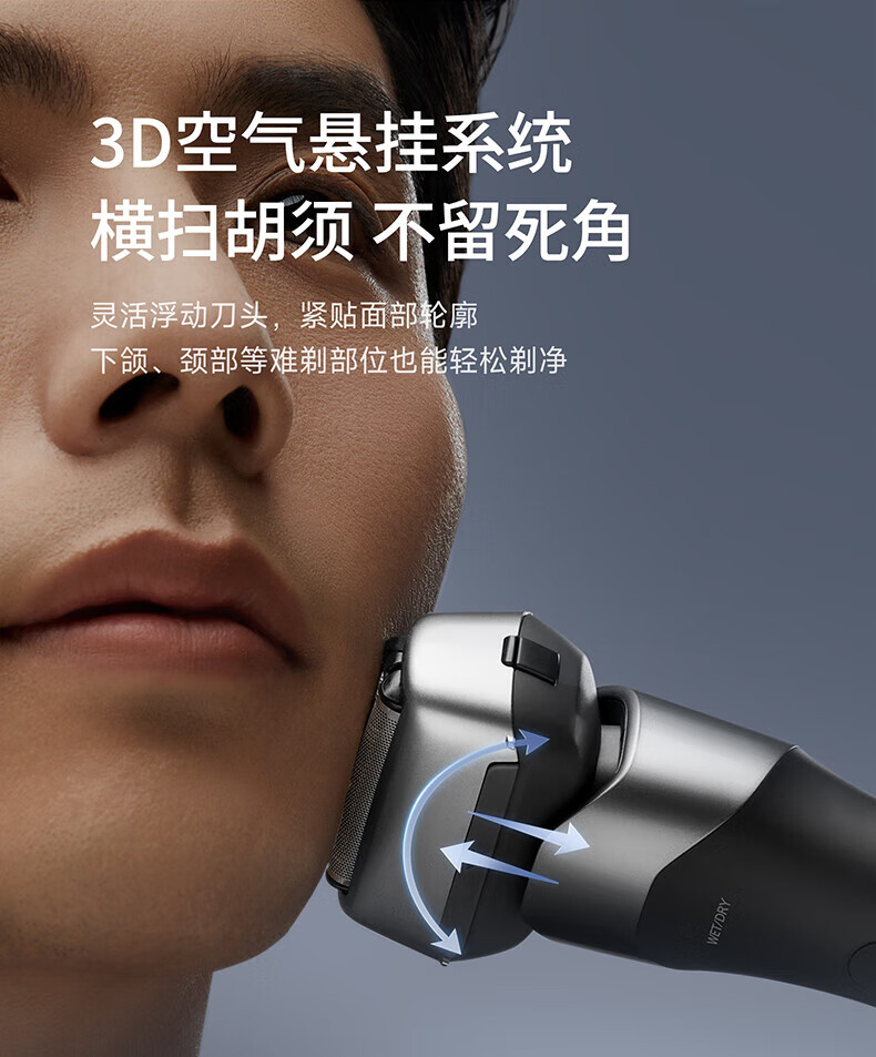 独立浮动三刀头,贴合面部轮廓净须快;高速马达驱动,剃须高效不拉扯刺痛;全身防水设计,干湿两剃清洁超方便;轻巧便携机身,出差旅行携带无负担;一键弹出刀头,清洗替换轻松又快捷