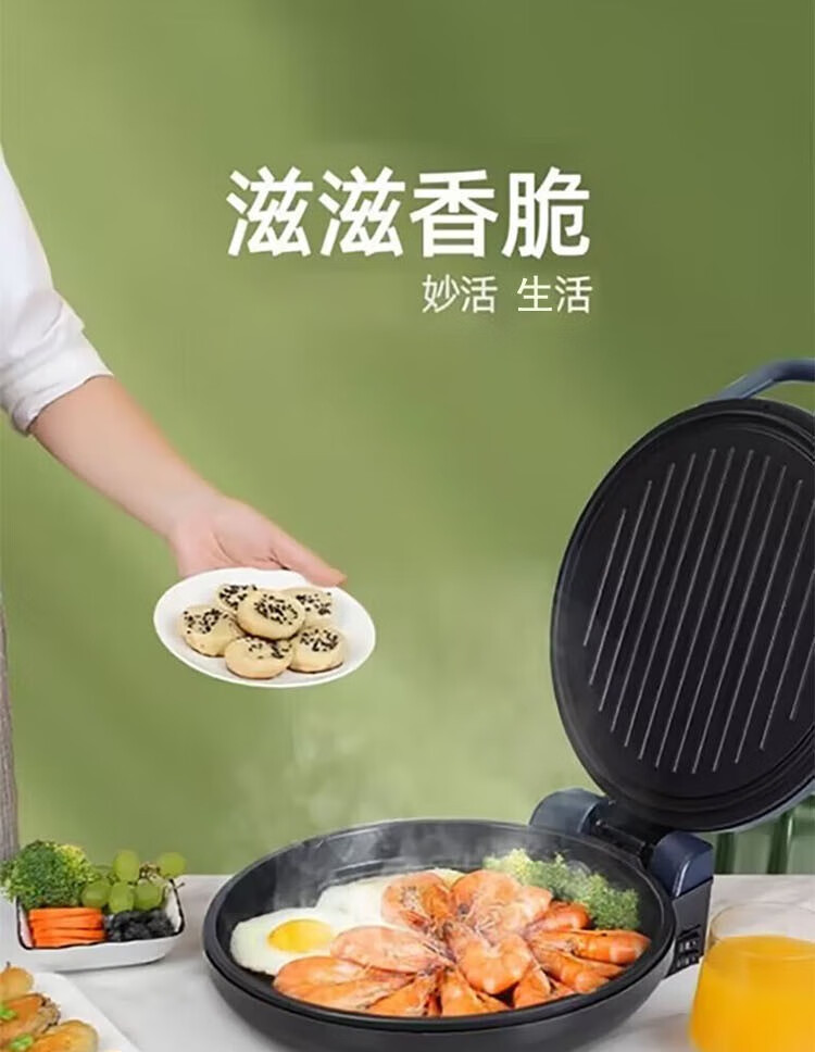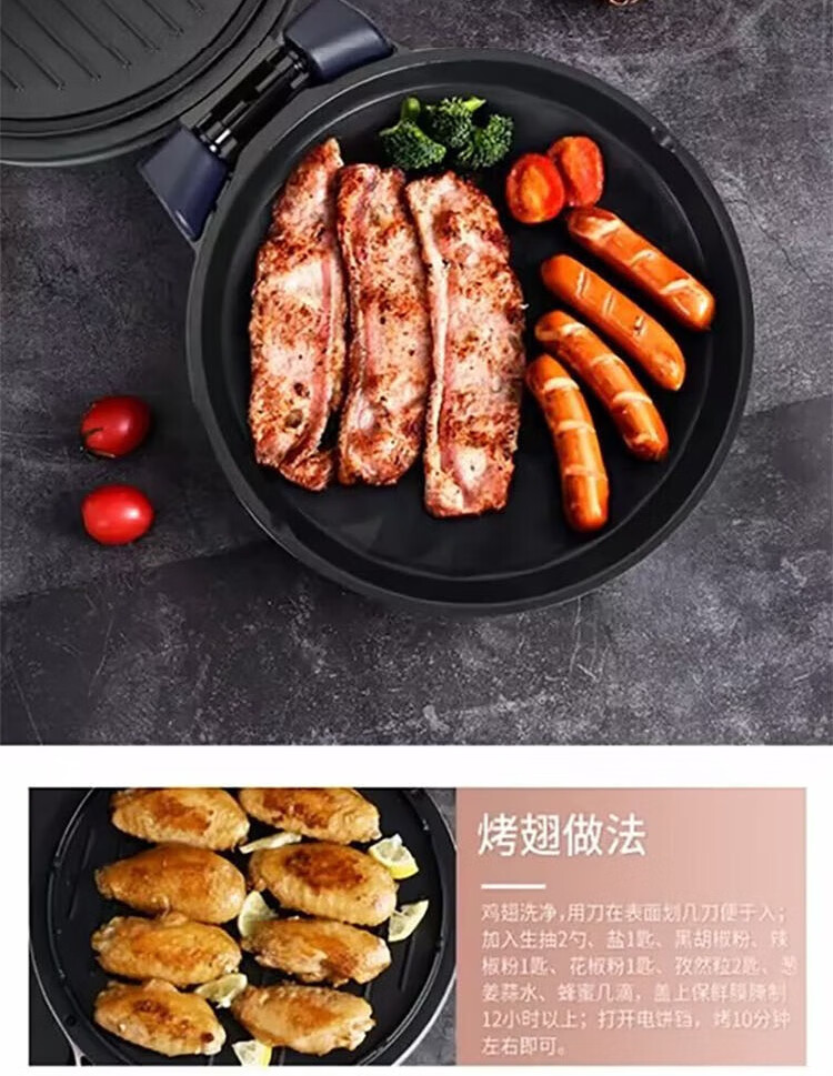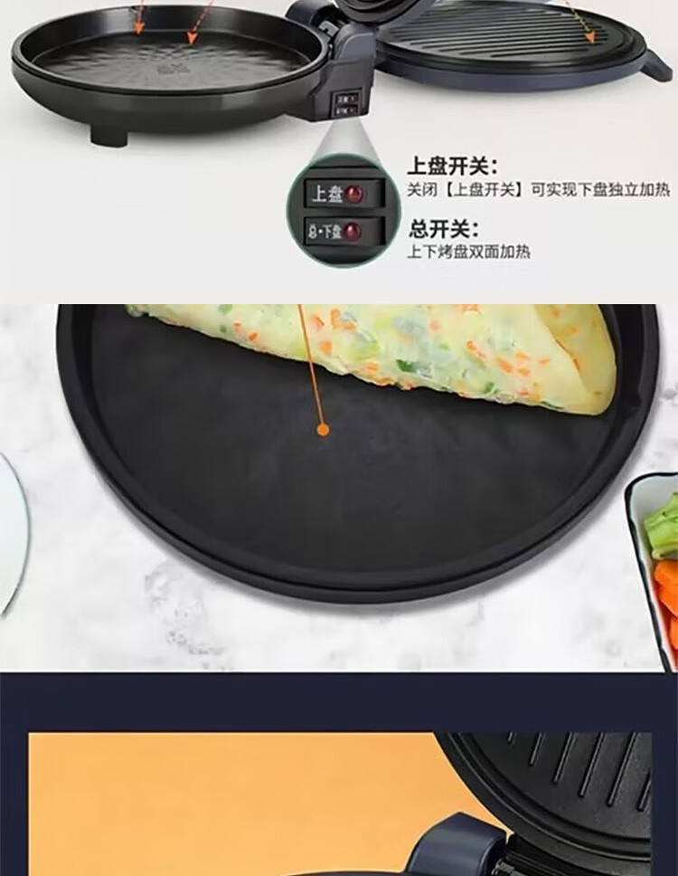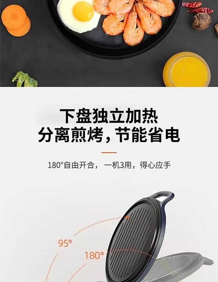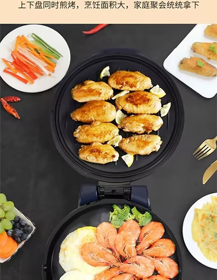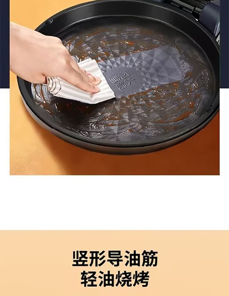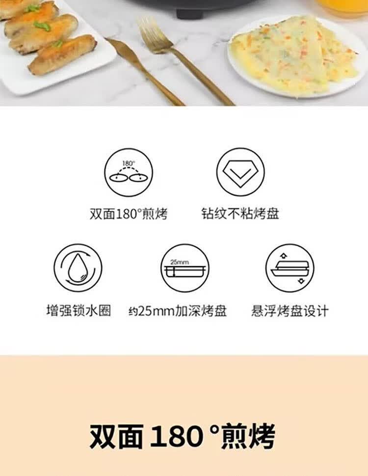 上下双盘,双面加热;聚能烤盘,均匀发热;180度伸展,双面煎烤;无烟不粘锅,耐刮耐磨耐酸碱,易清洁,污渍不残留;煎饼、鸡翅、花生米、烧烤均可
